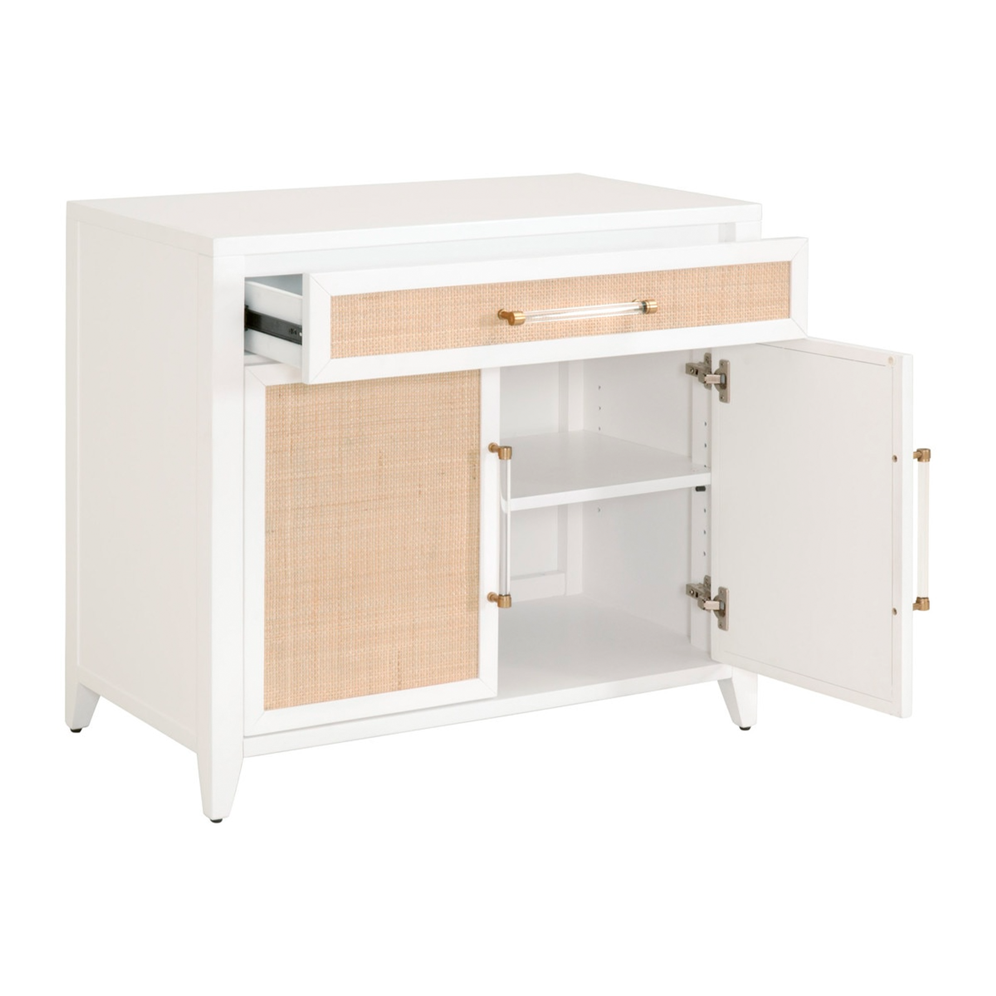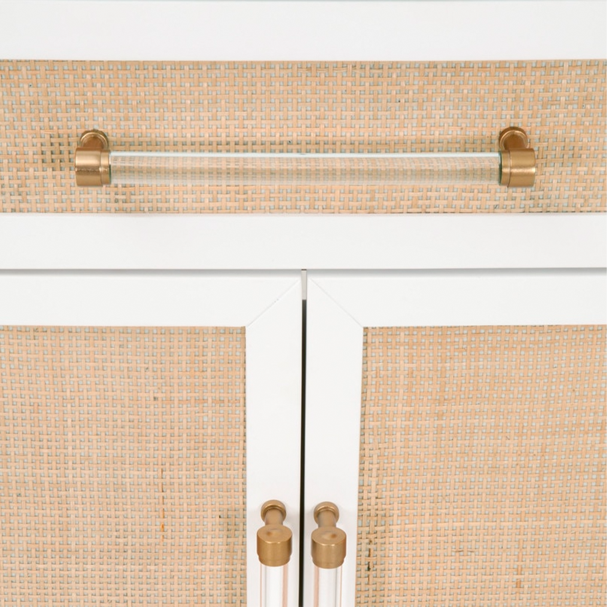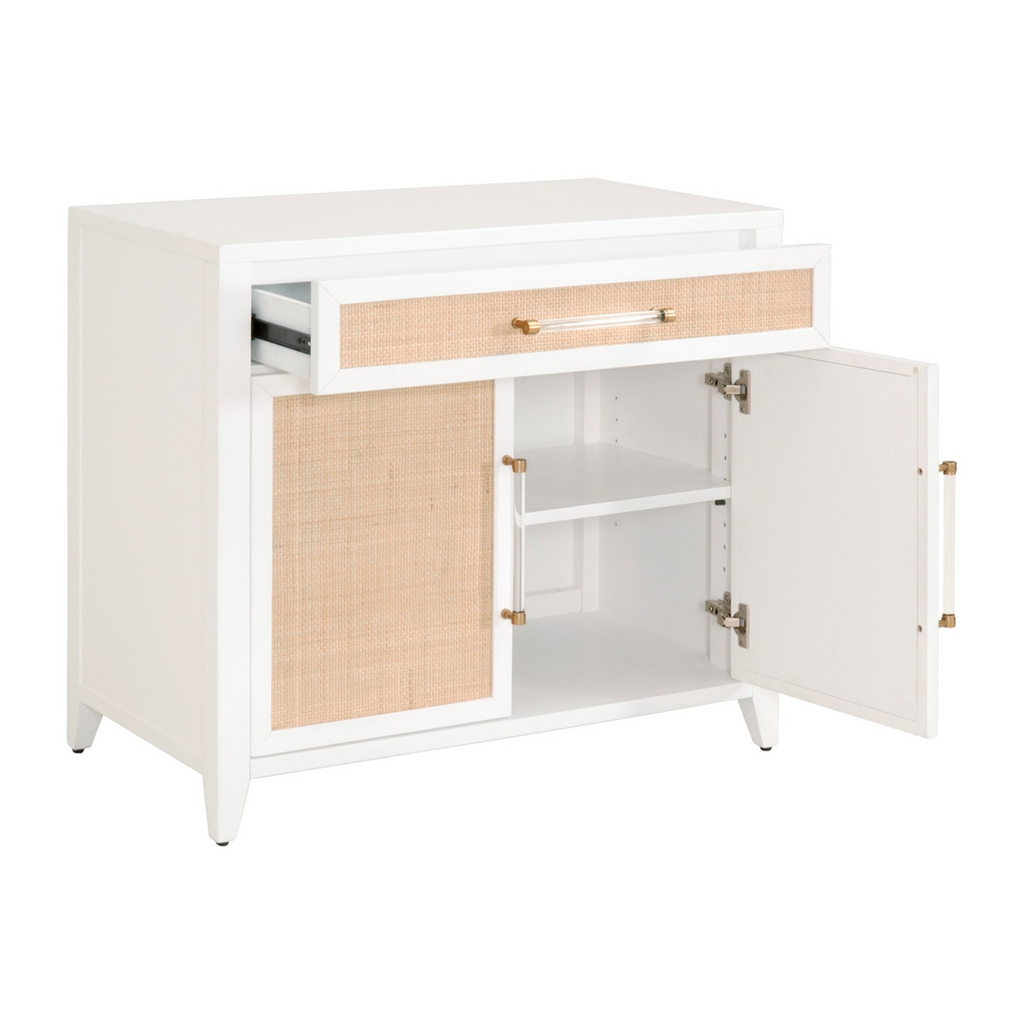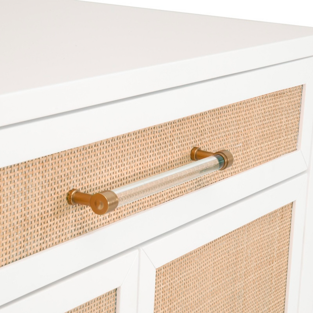 This transitional Holland Media Chest blends design styles taken from tropical, traditional, and modern looks. The front drawer and doors feature a natural rattan inlay framed by matte white lacquered wood. The interior cabinet features a cord management hole for electronic devices and an adjustable shelf to reach your desired height. Clear handles with brushed brass ends accessorize this media cabinet as well.