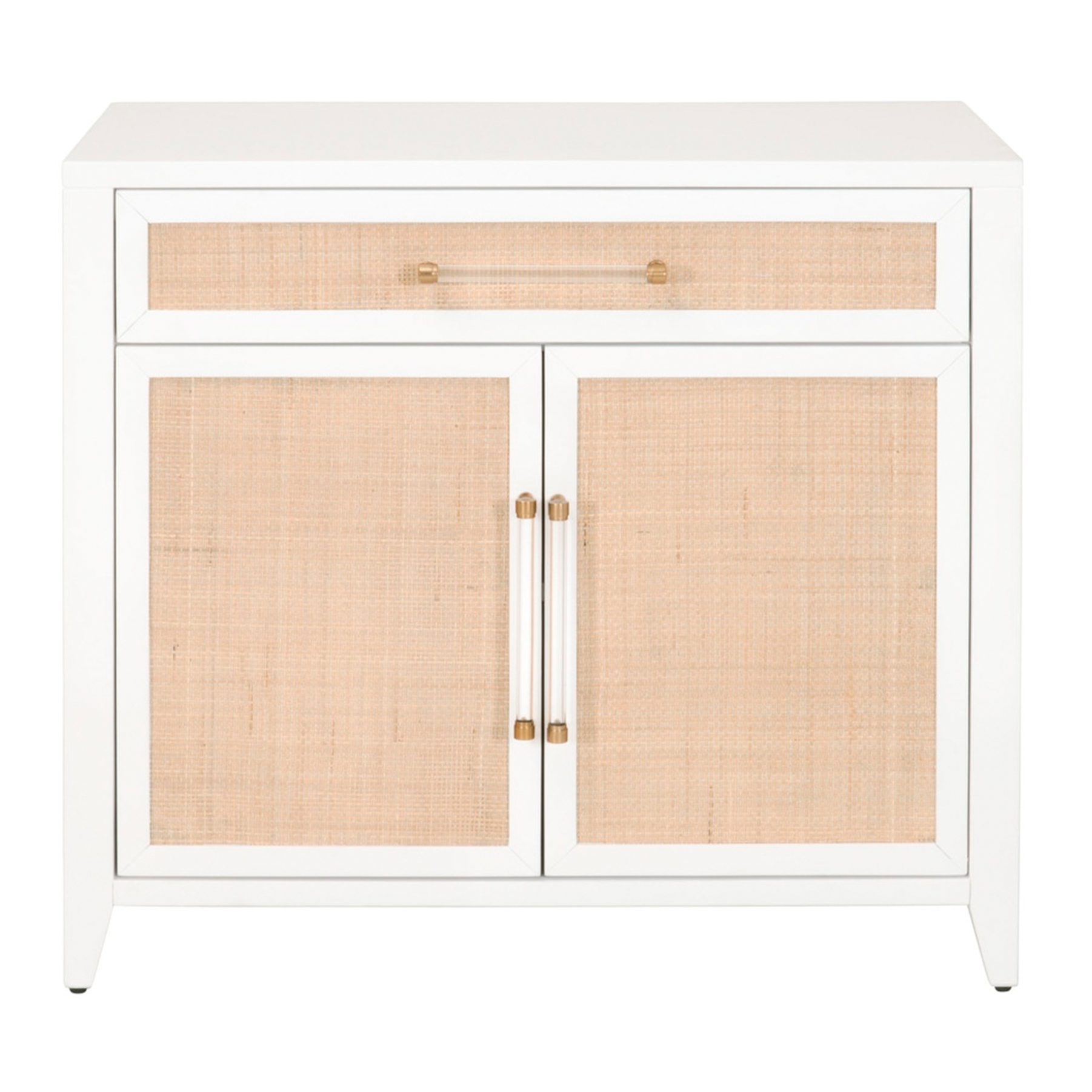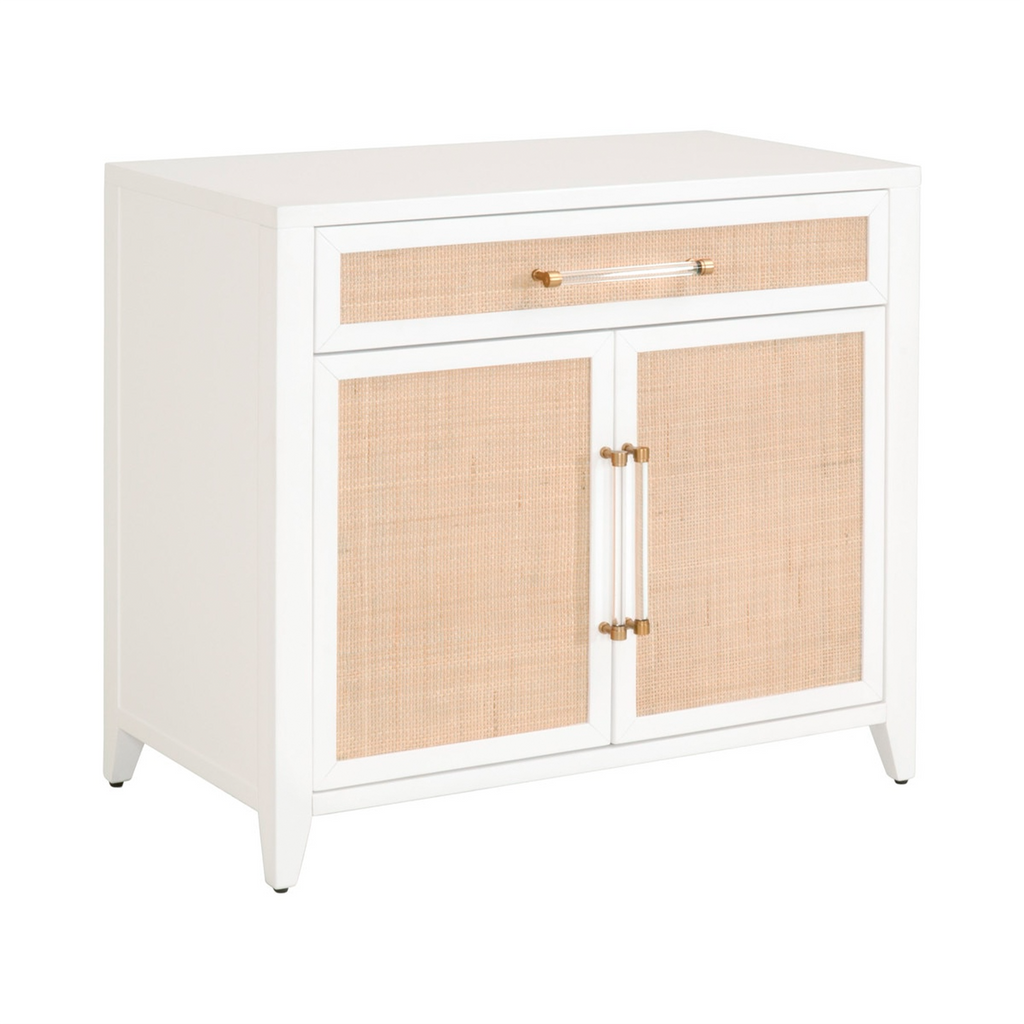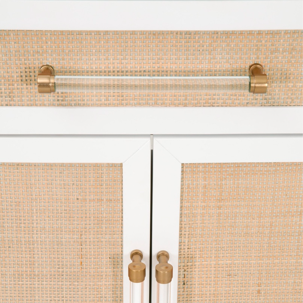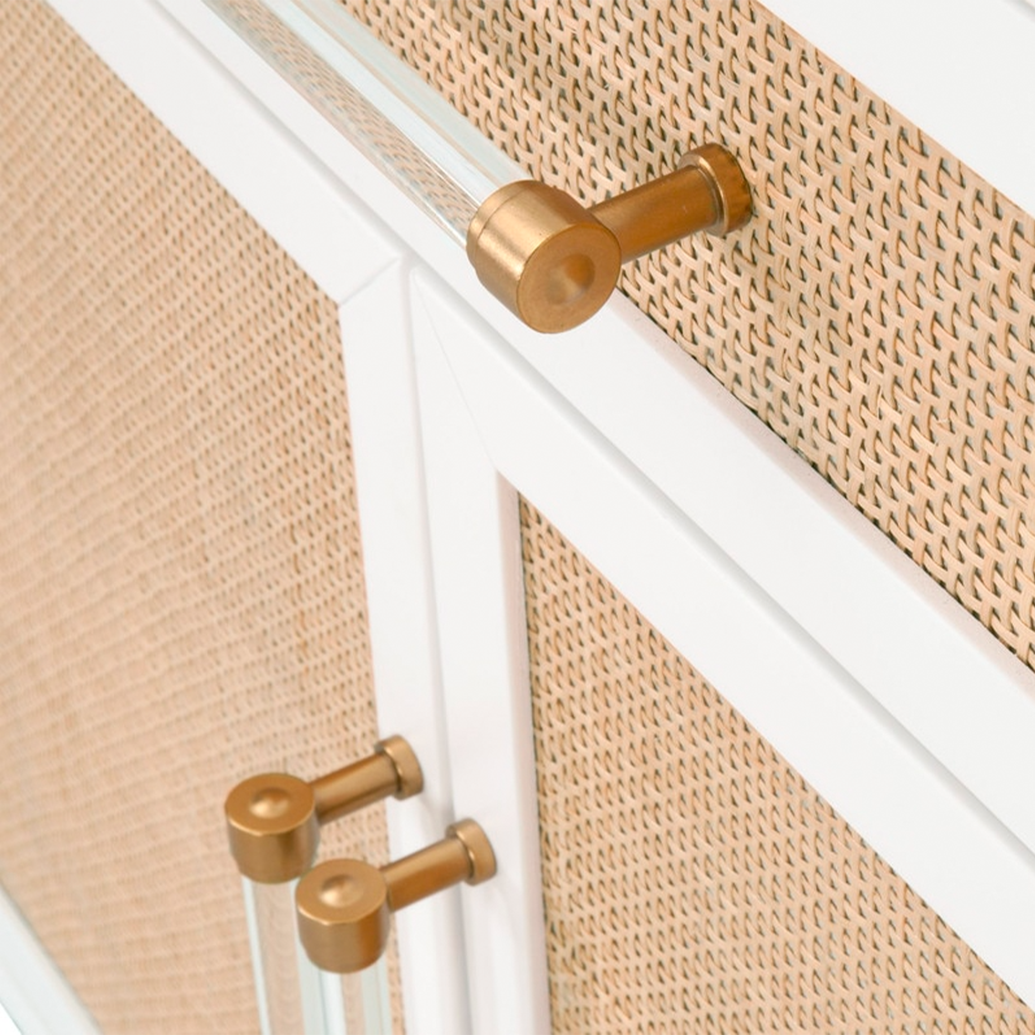 This transitional Holland Media Chest blends design styles taken from tropical, traditional, and modern looks. The front drawer and doors feature a natural rattan inlay framed by matte white lacquered wood. The interior cabinet features a cord management hole for electronic devices and an adjustable shelf to reach your desired height. Clear handles with brushed brass ends accessorize this media cabinet as well.