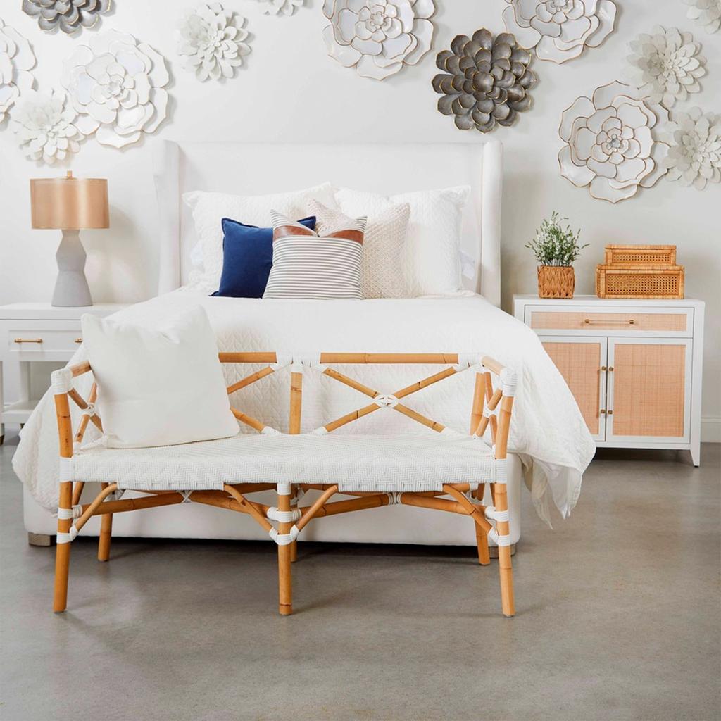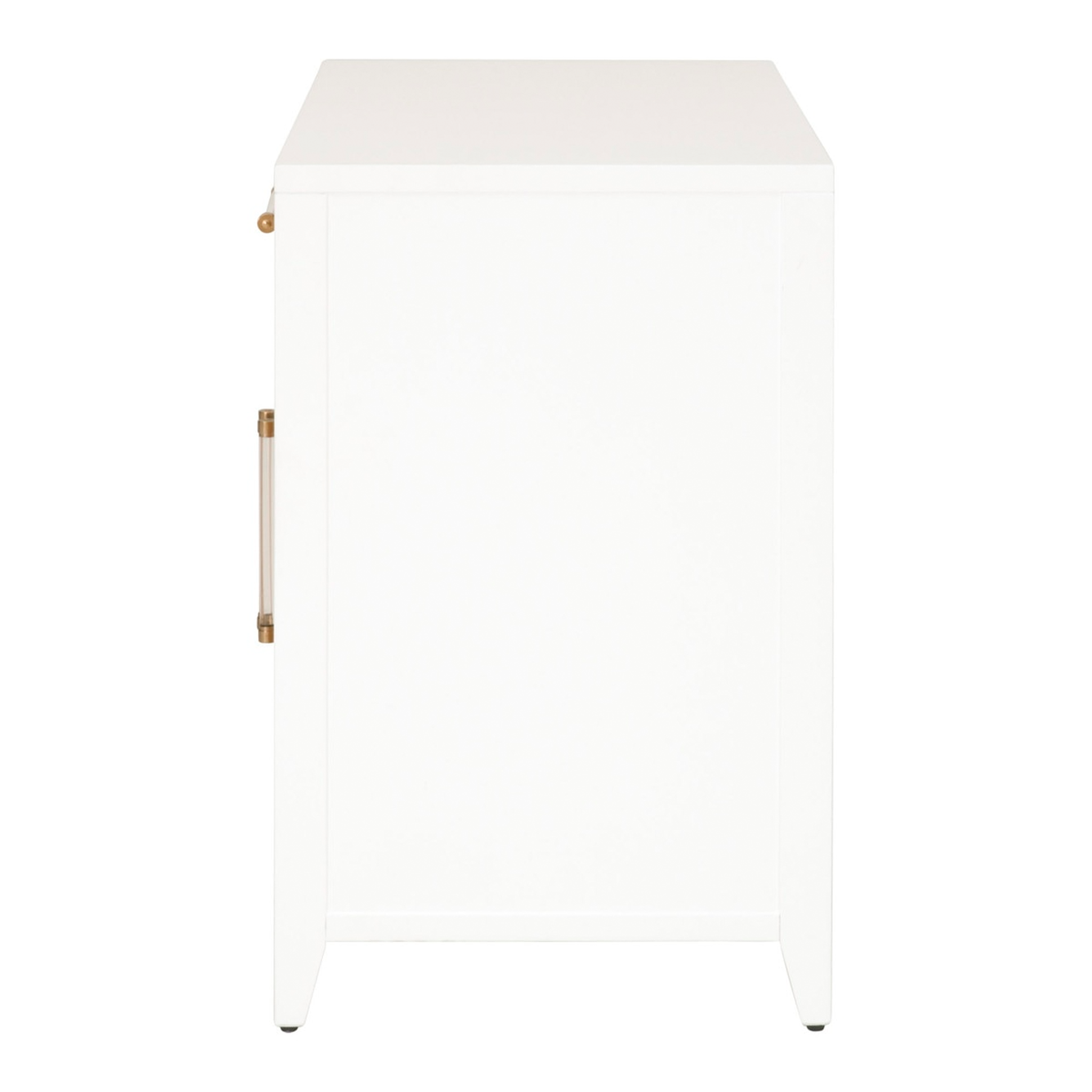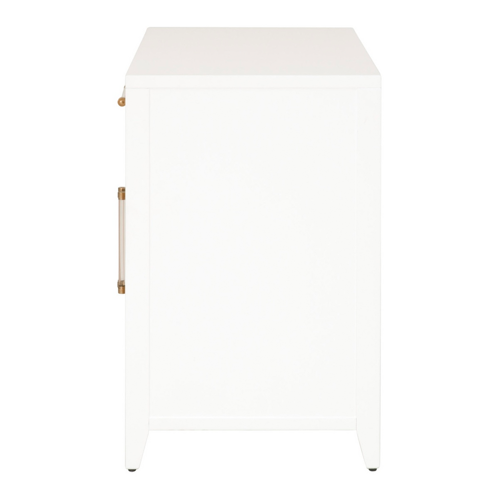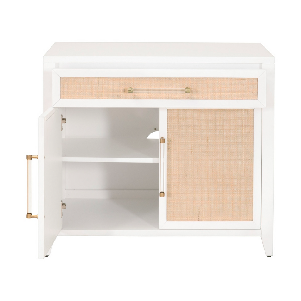 This transitional Holland Media Chest blends design styles taken from tropical, traditional, and modern looks. The front drawer and doors feature a natural rattan inlay framed by matte white lacquered wood. The interior cabinet features a cord management hole for electronic devices and an adjustable shelf to reach your desired height. Clear handles with brushed brass ends accessorize this media cabinet as well.