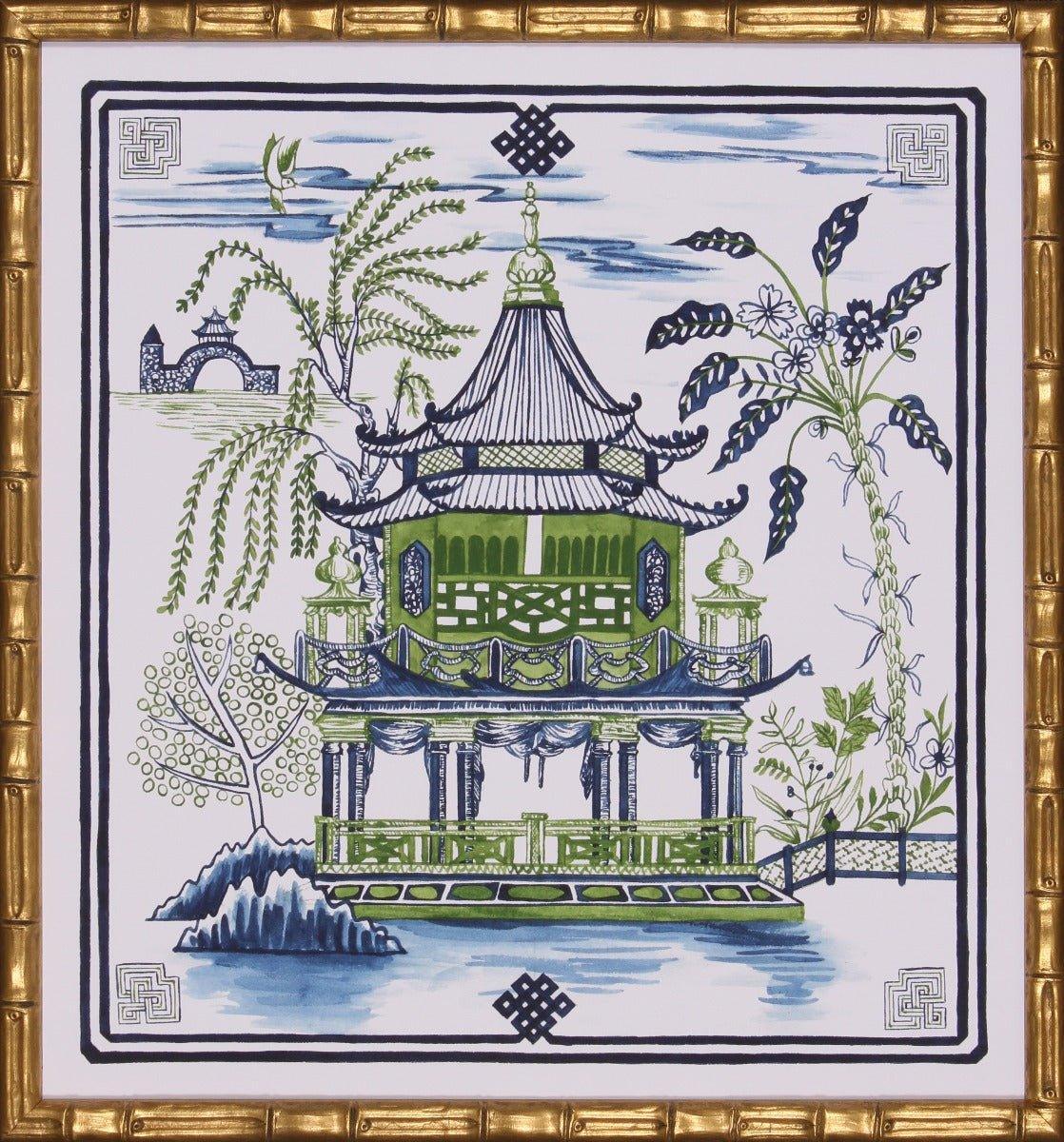 Indigo Blue & Green Pagoda Visit I Lithograph in Gold Frame