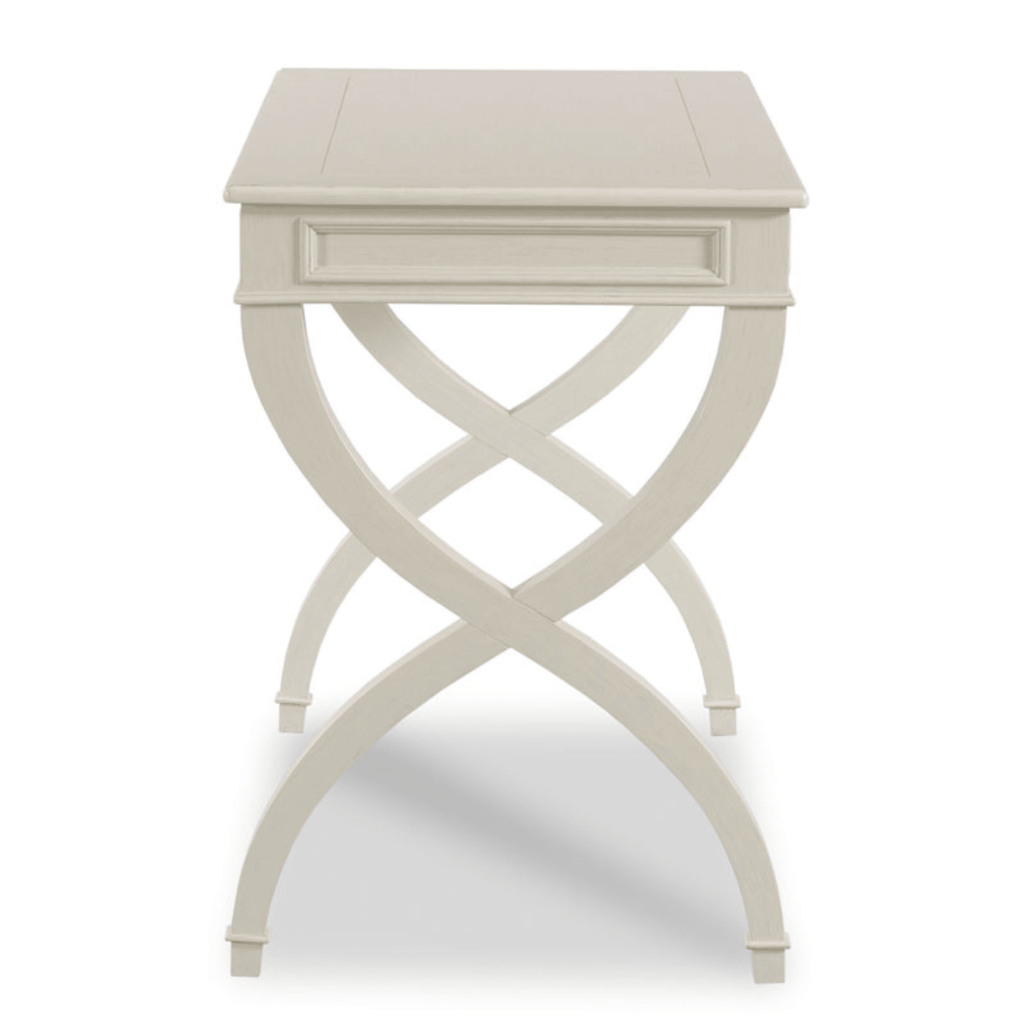 A rectangular top rests over an apron rail drawer flanked by curvaceous intersecting legs.