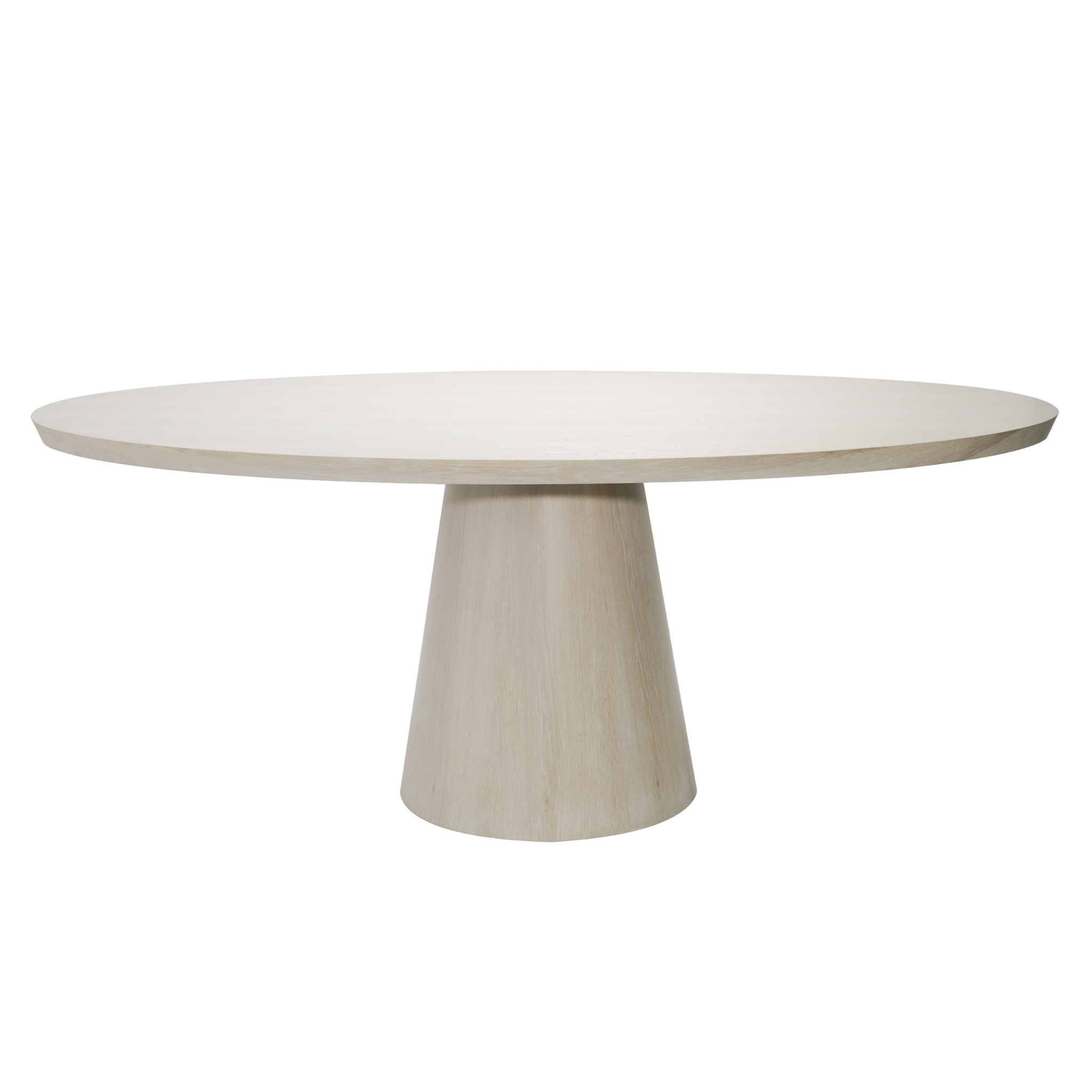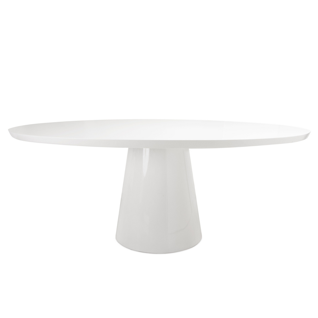 Our Jefferson oval dining table makes the most of its classic, minimalist silhouette. The tapered wood base has a stately presence, and light cerused finish or glossy white lacquer finish amplifies its natural, textured oak grain.  With an 86-inch wide, reverse-beveled top, the Jefferson comfortably seats six to eight guests.
