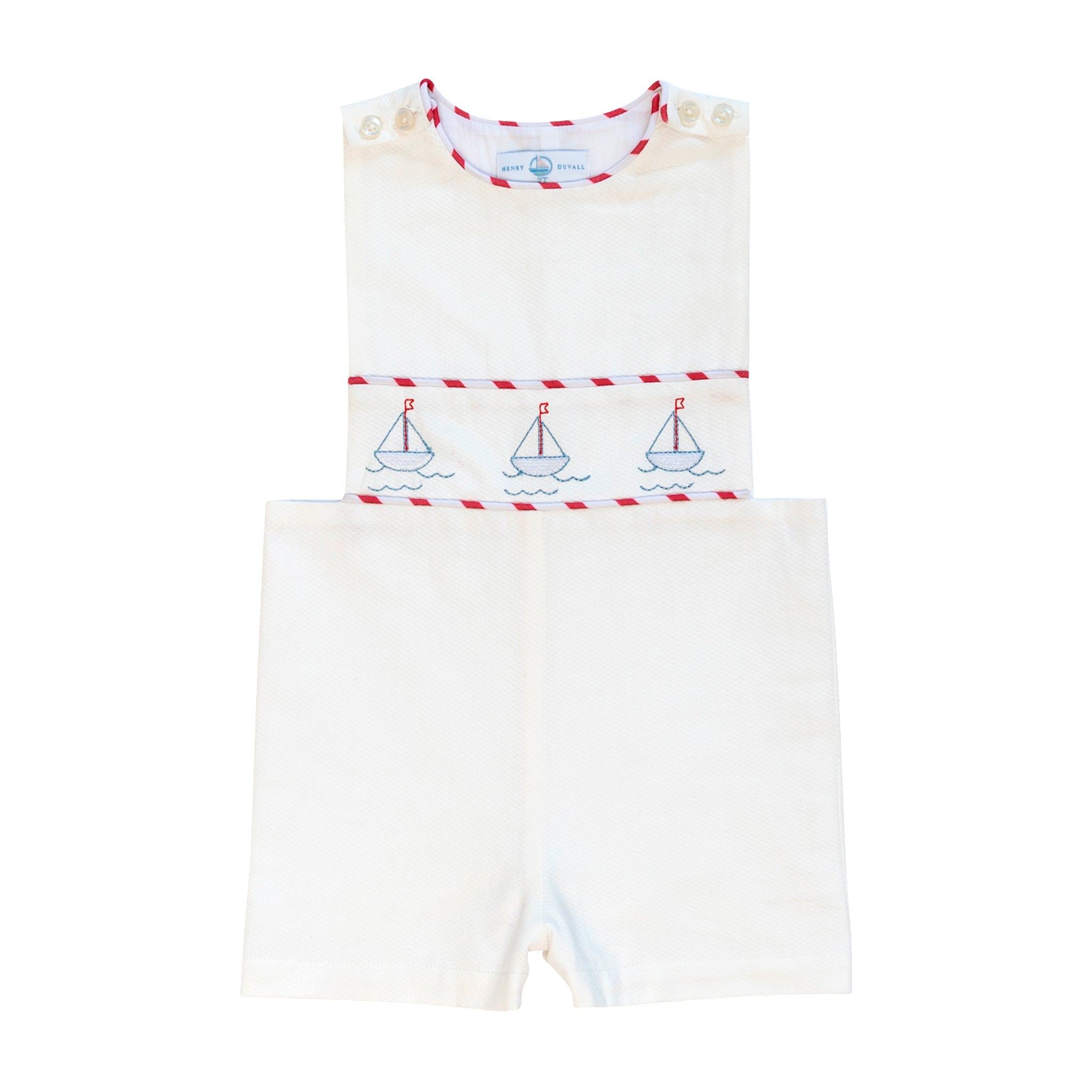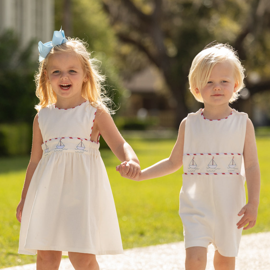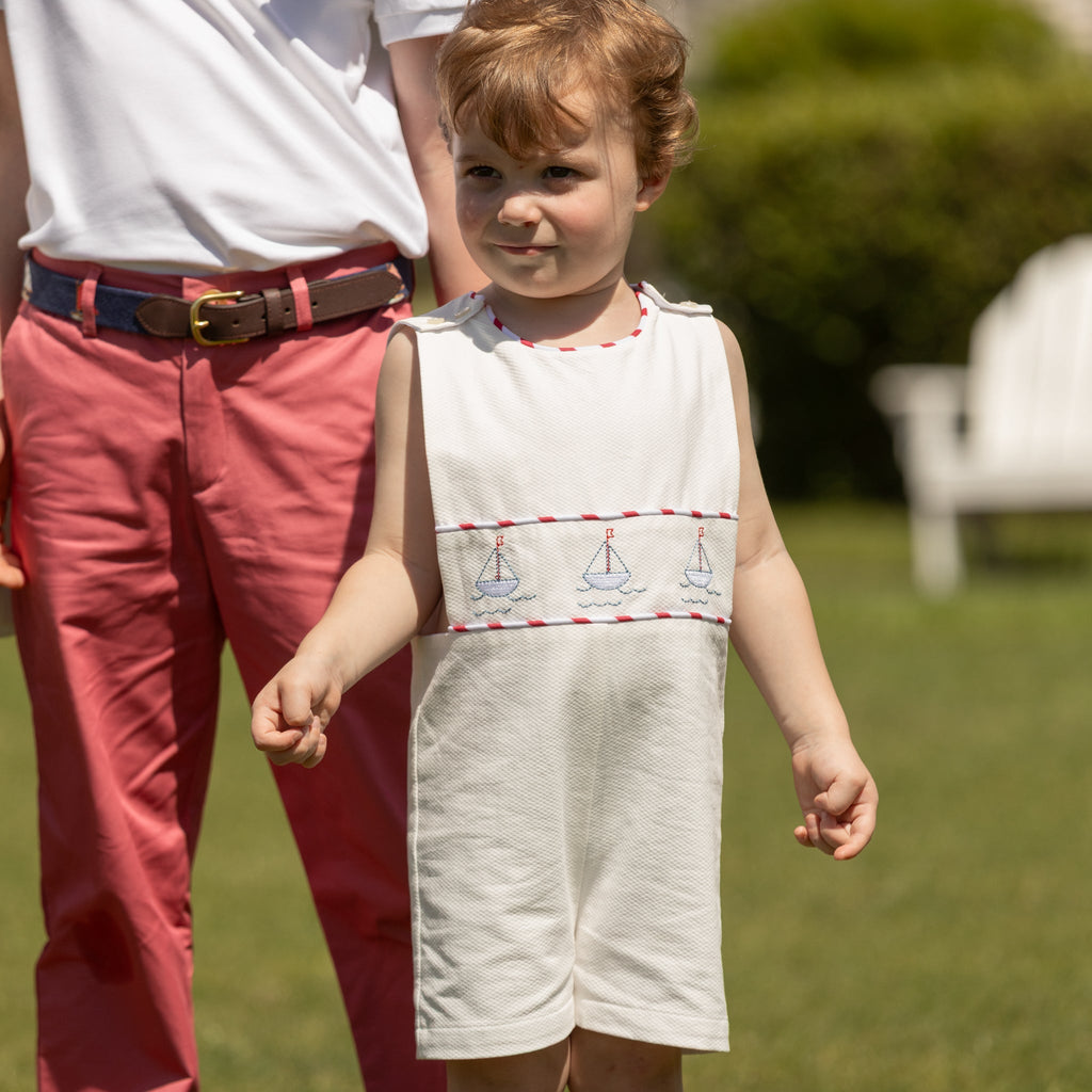Our Jennings Jon Jon is classic and sweet, the perfect toddler boy option for summer. Made of luxurious cotton pique in 8th Street Ivory, and featuring our sailboat embroidery, it's an heirloom in the making. Coordinate with all our Southampton Sailboat pieces, or our new women's Laine dress for the perfect family coordination this season.