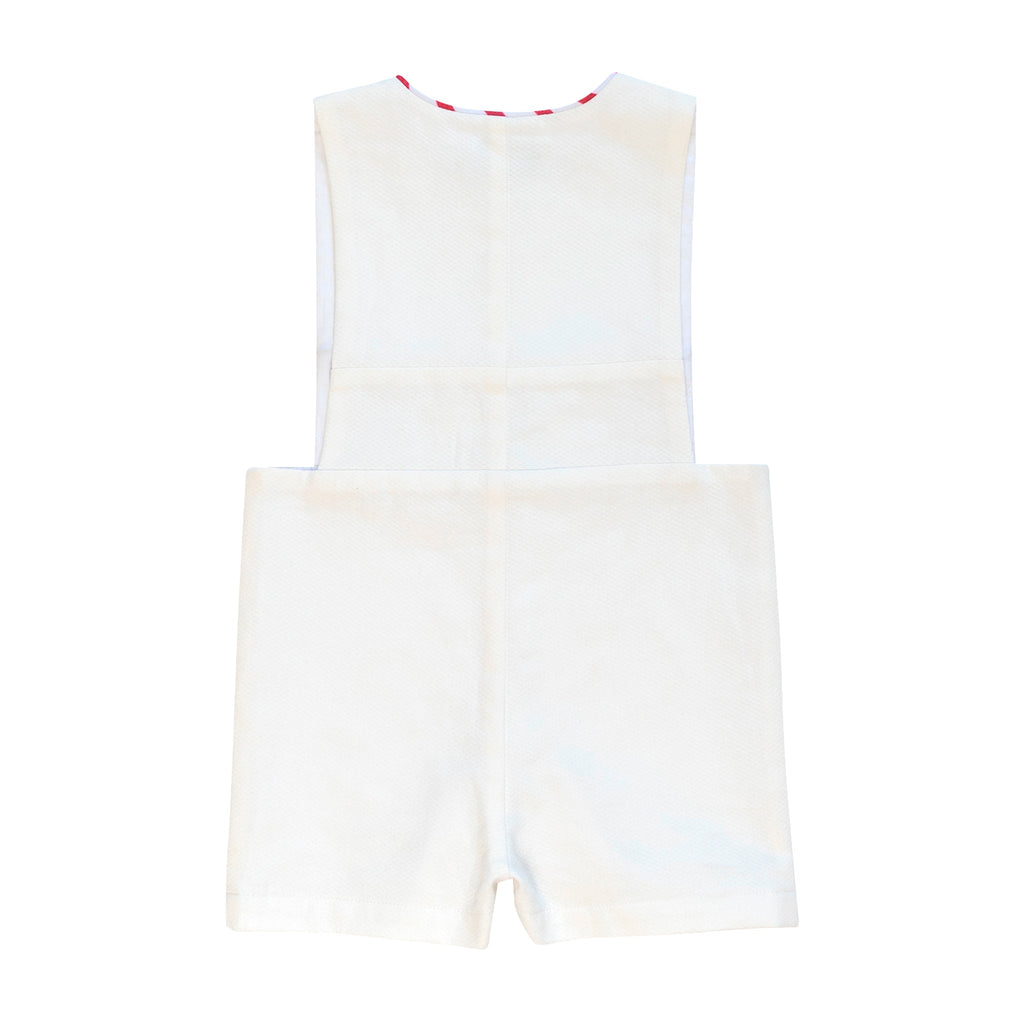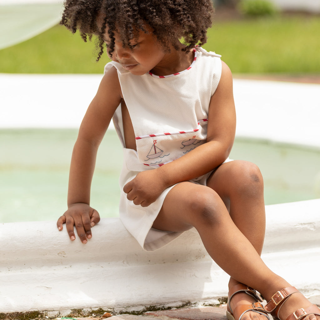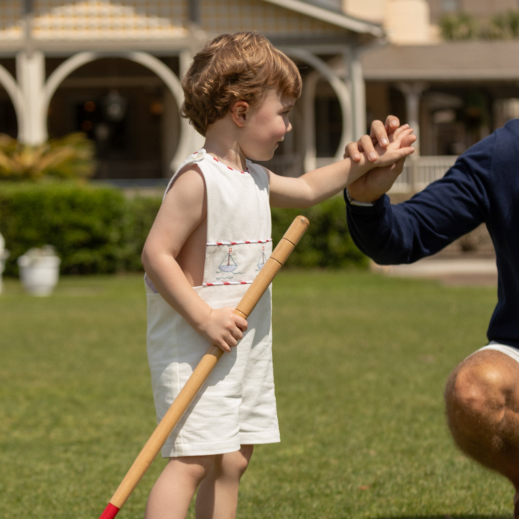 Our Jennings Jon Jon is classic and sweet, the perfect toddler boy option for summer. Made of luxurious cotton pique in 8th Street Ivory, and featuring our sailboat embroidery, it's an heirloom in the making. Coordinate with all our Southampton Sailboat pieces, or our new women's Laine dress for the perfect family coordination this season.