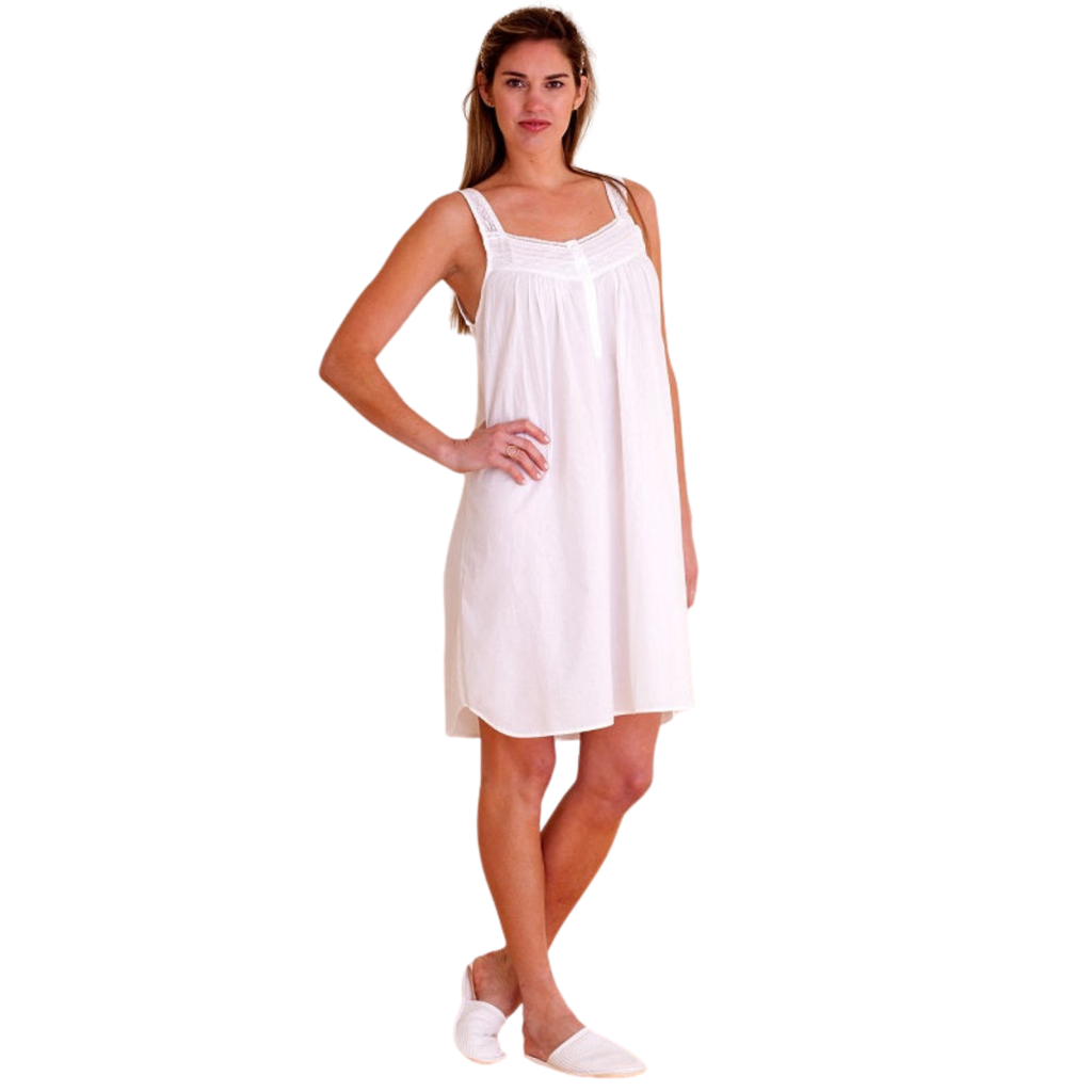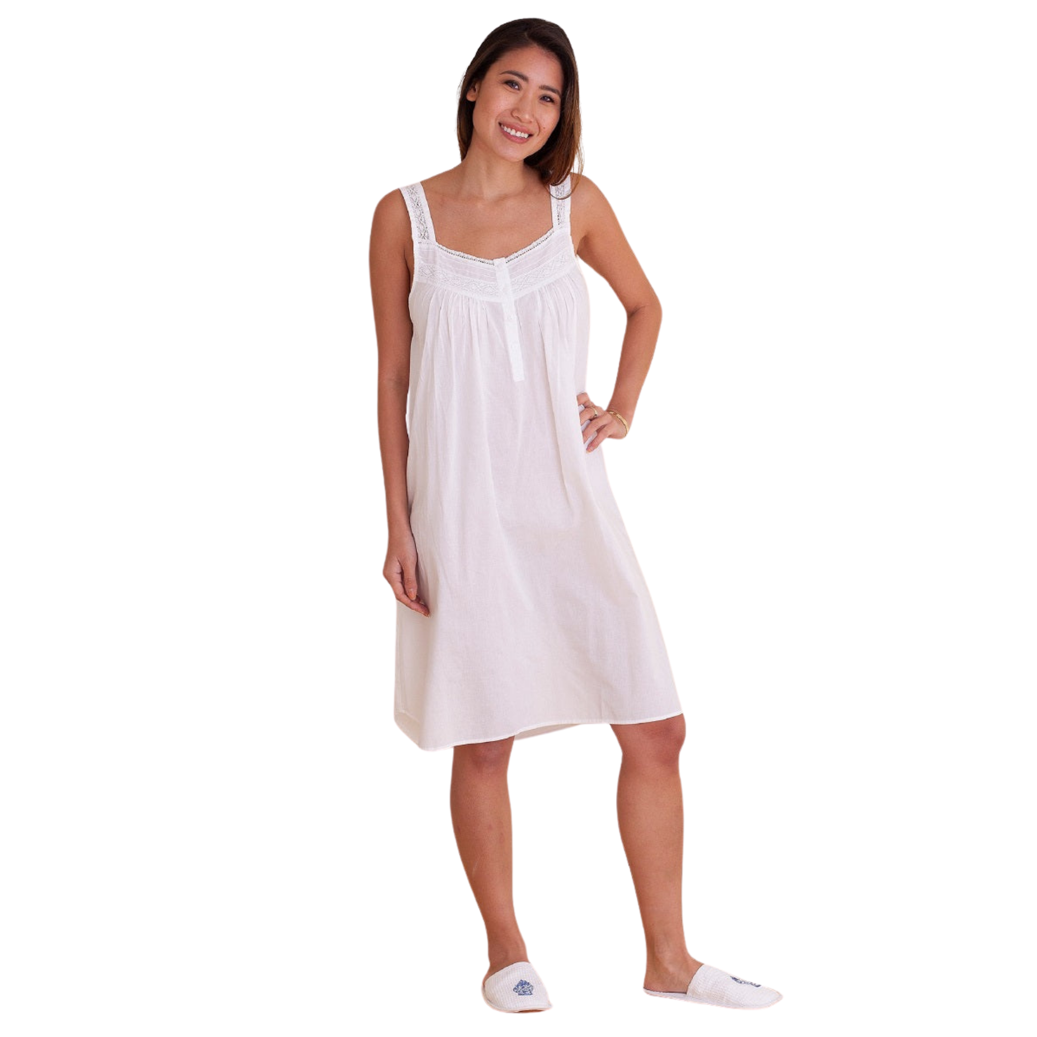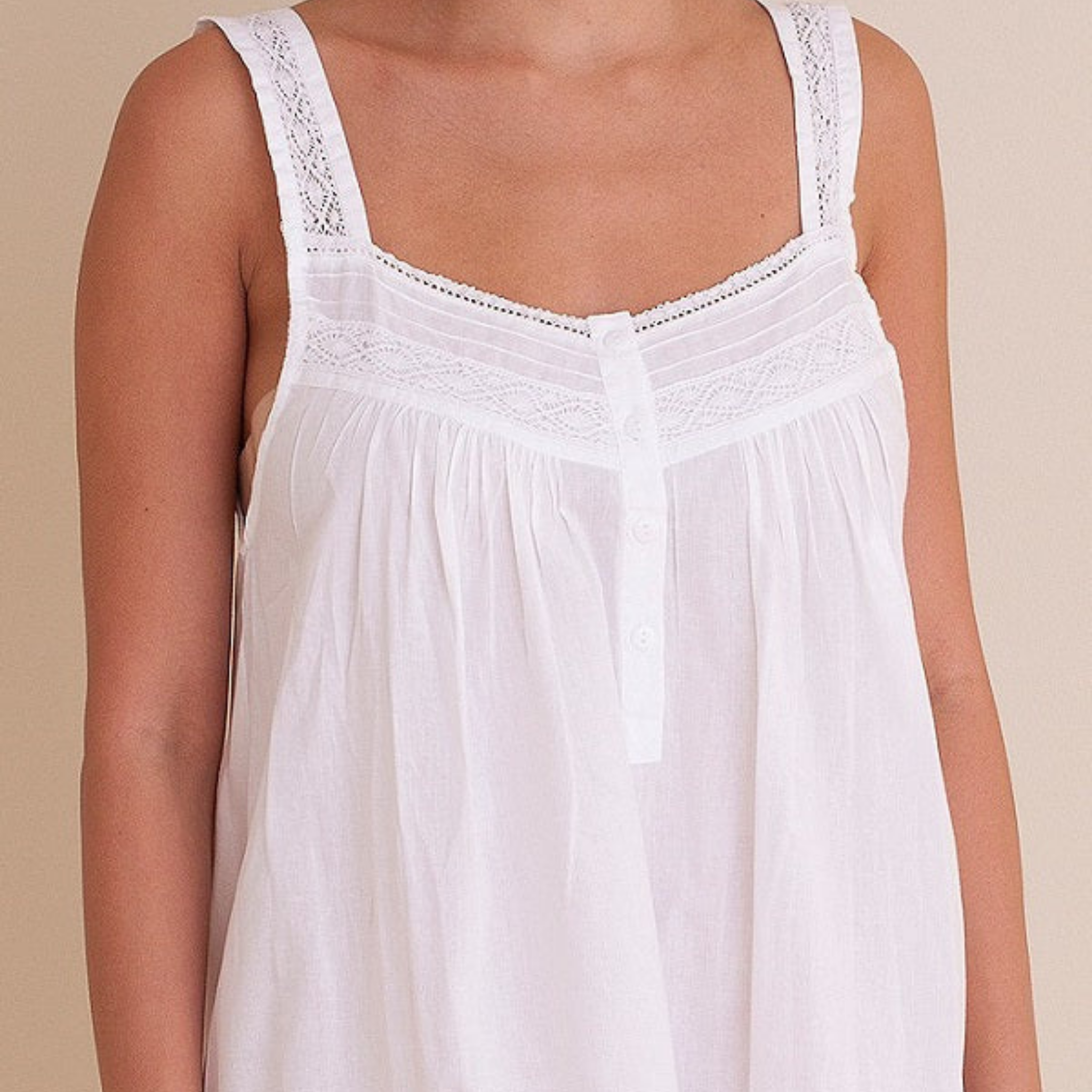 This Victorian sleeveless white cotton nightgown with cut out lace shoulder straps and trim is perfect for keeping cool on warmer evenings. The Joy nightgown is popular for its 4 front buttons and gorgeous lace trim on the bodice. The front buttons make it easy to pull on and take off, and great for women who are pregnant or breastfeeding.