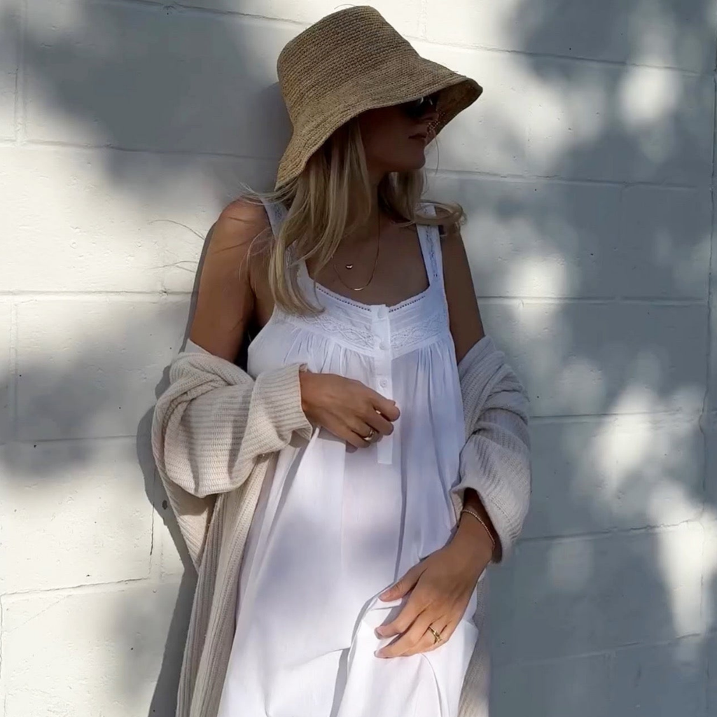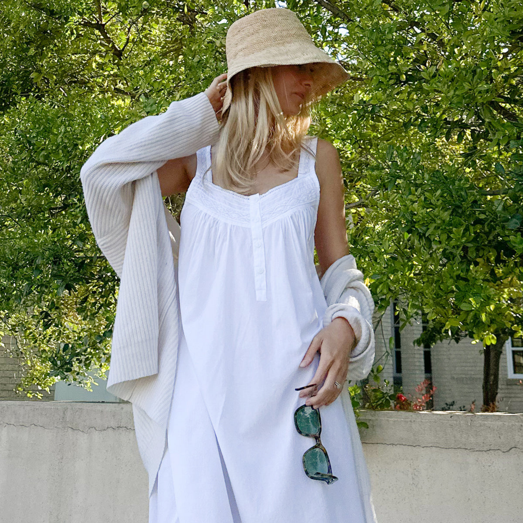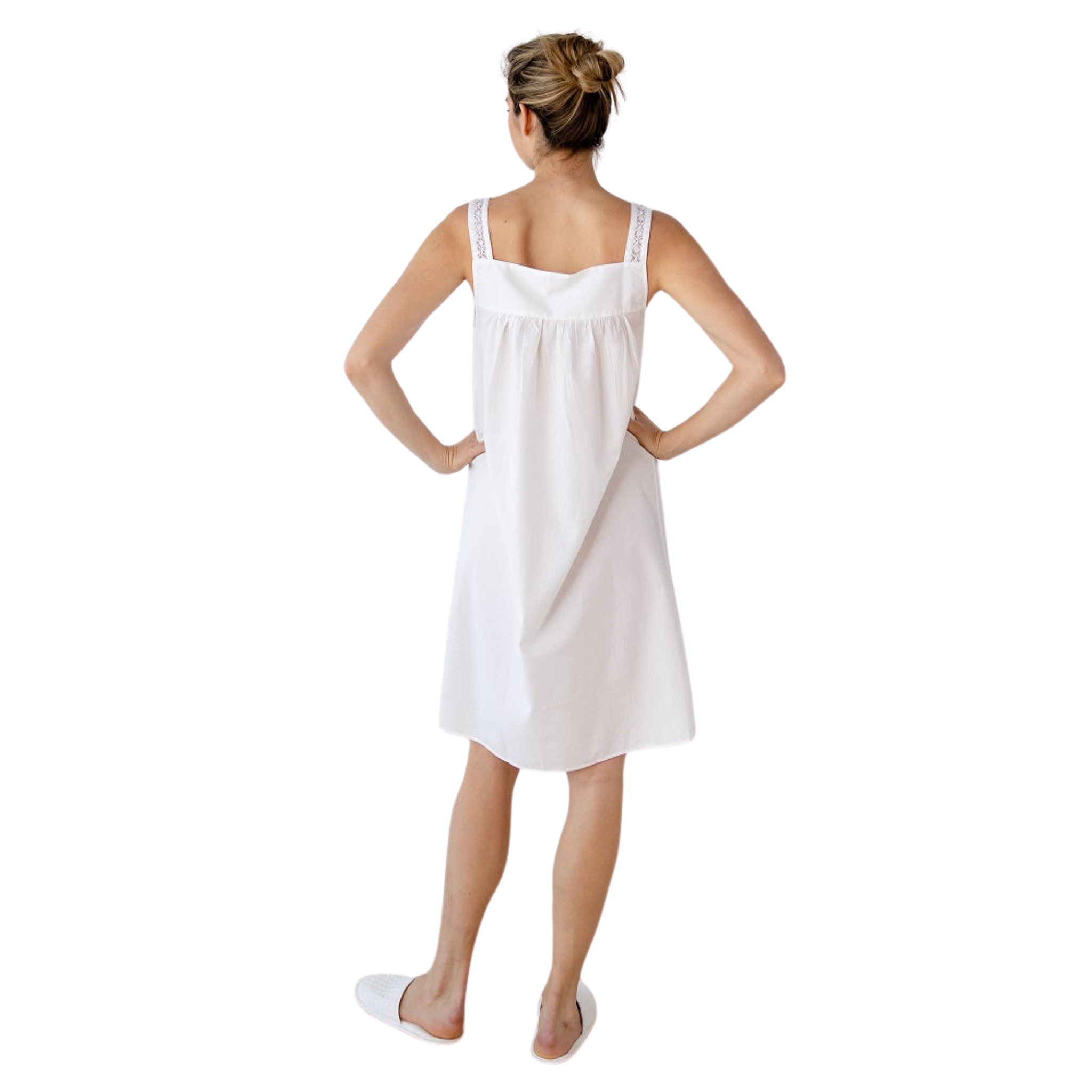 This Victorian sleeveless white cotton nightgown with cut out lace shoulder straps and trim is perfect for keeping cool on warmer evenings. The Joy nightgown is popular for its 4 front buttons and gorgeous lace trim on the bodice. The front buttons make it easy to pull on and take off, and great for women who are pregnant or breastfeeding.