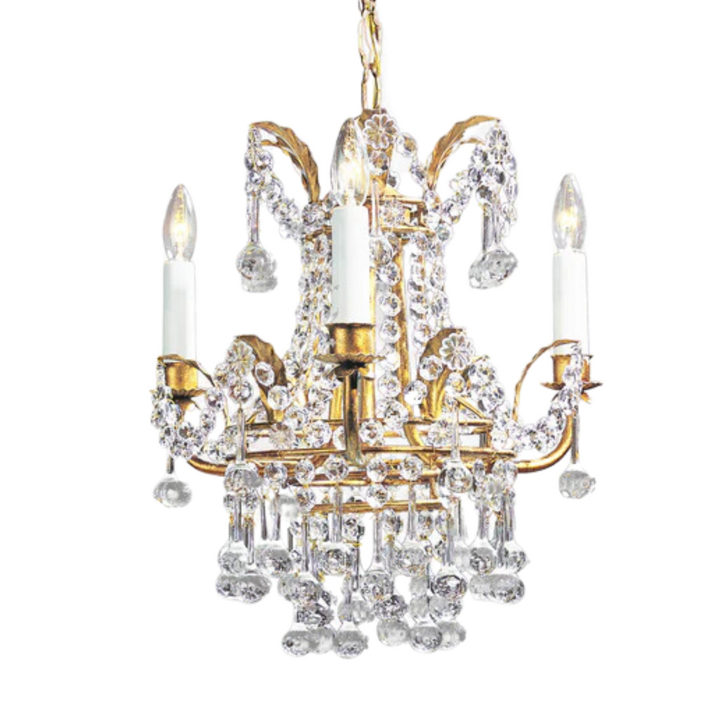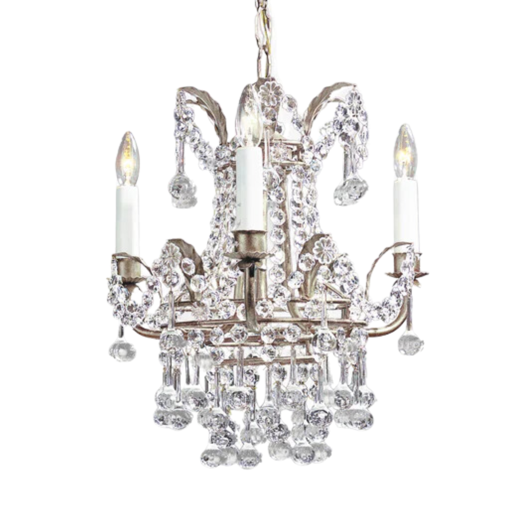 Iron chandelier with antiqued silver leaf or gold leaf and crystals. This item is custom made to order and may not be returned.