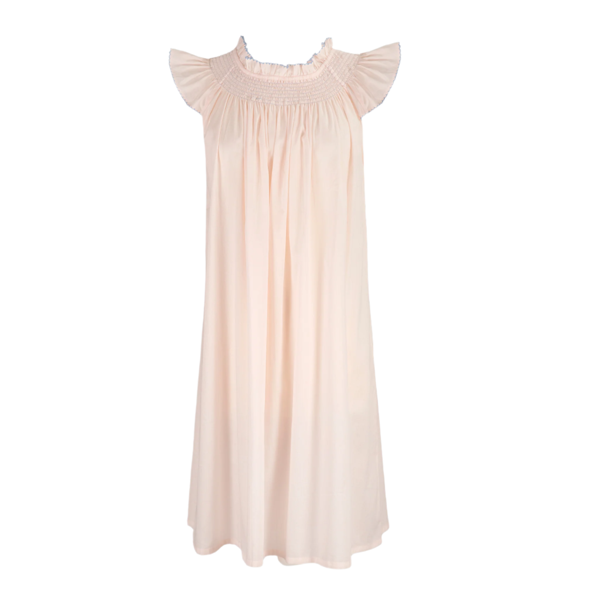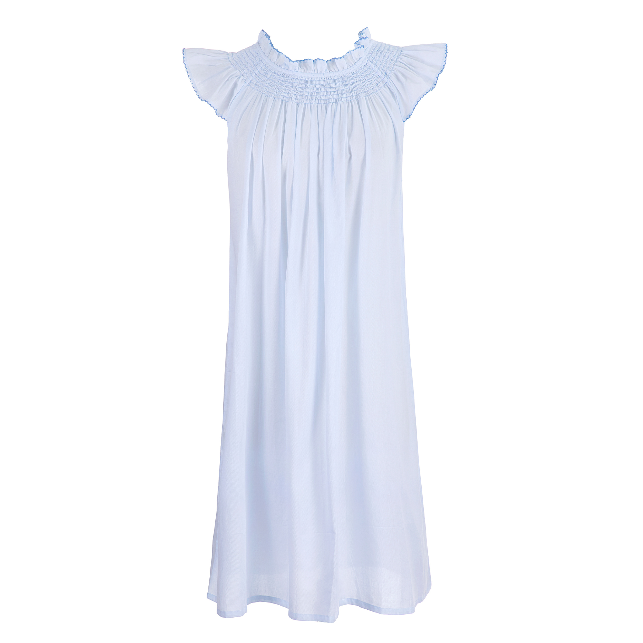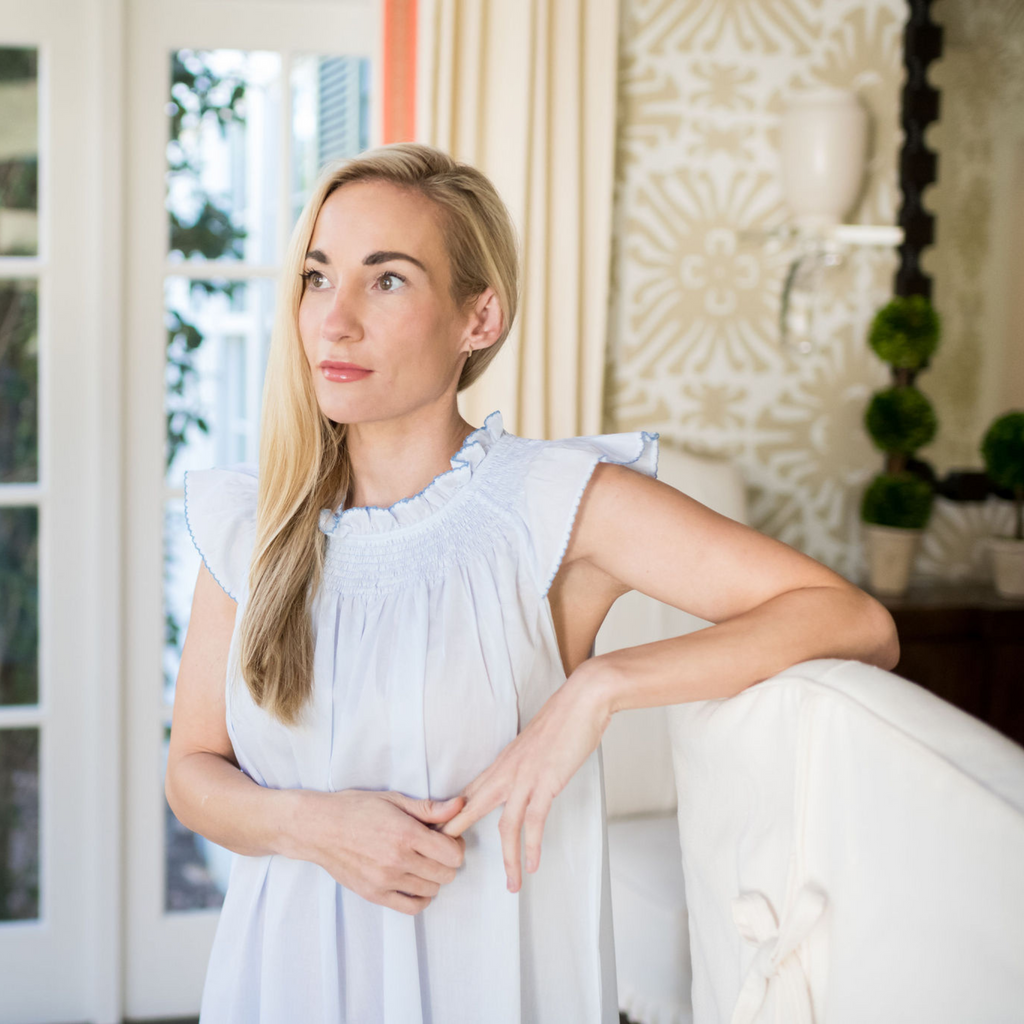 Our Katy Nightgown is made with a super soft brushed cotton. This lightweight stunner features a smocked elastic neckline and delicately scalloped flutter sleeves with contrast trim. Wear it around the house or toss it over a swim suit. From the Bedroom to the Beach.