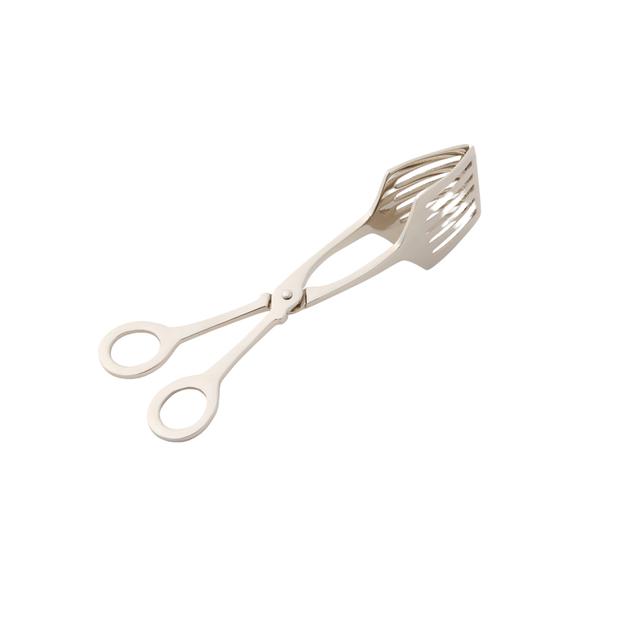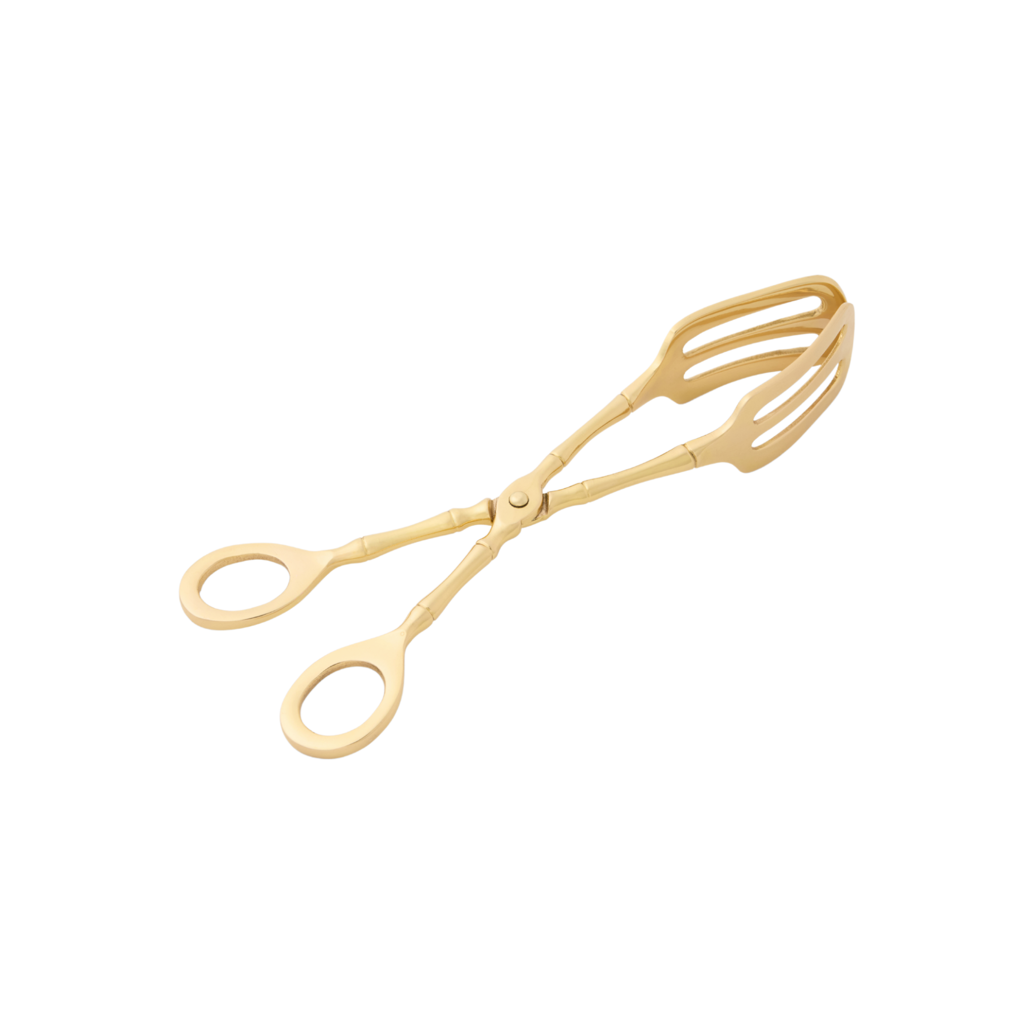 The Kayla serving tongs present classic, complementary finishes and textured details. A polished gold or nickel finish feels decadent to the touch.
