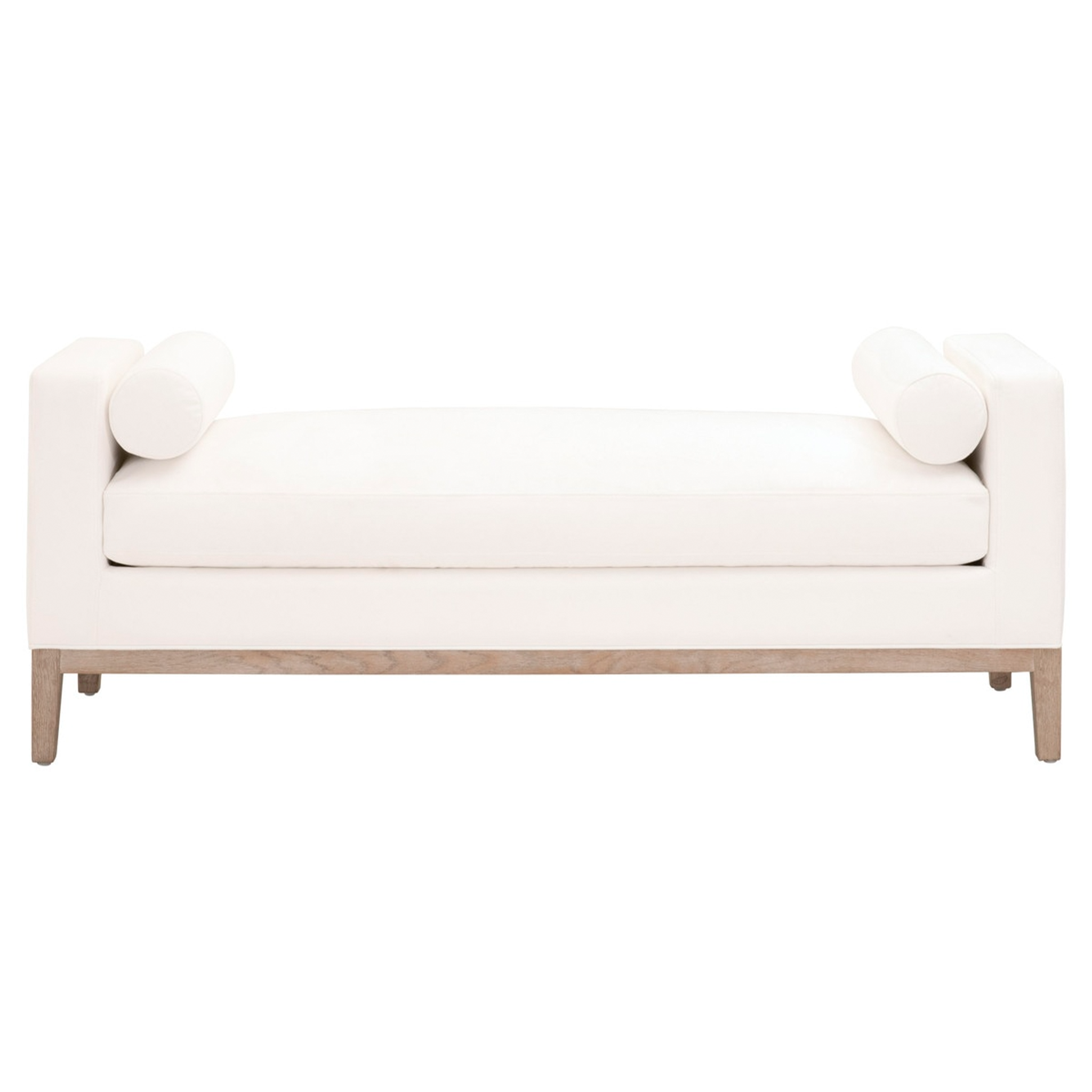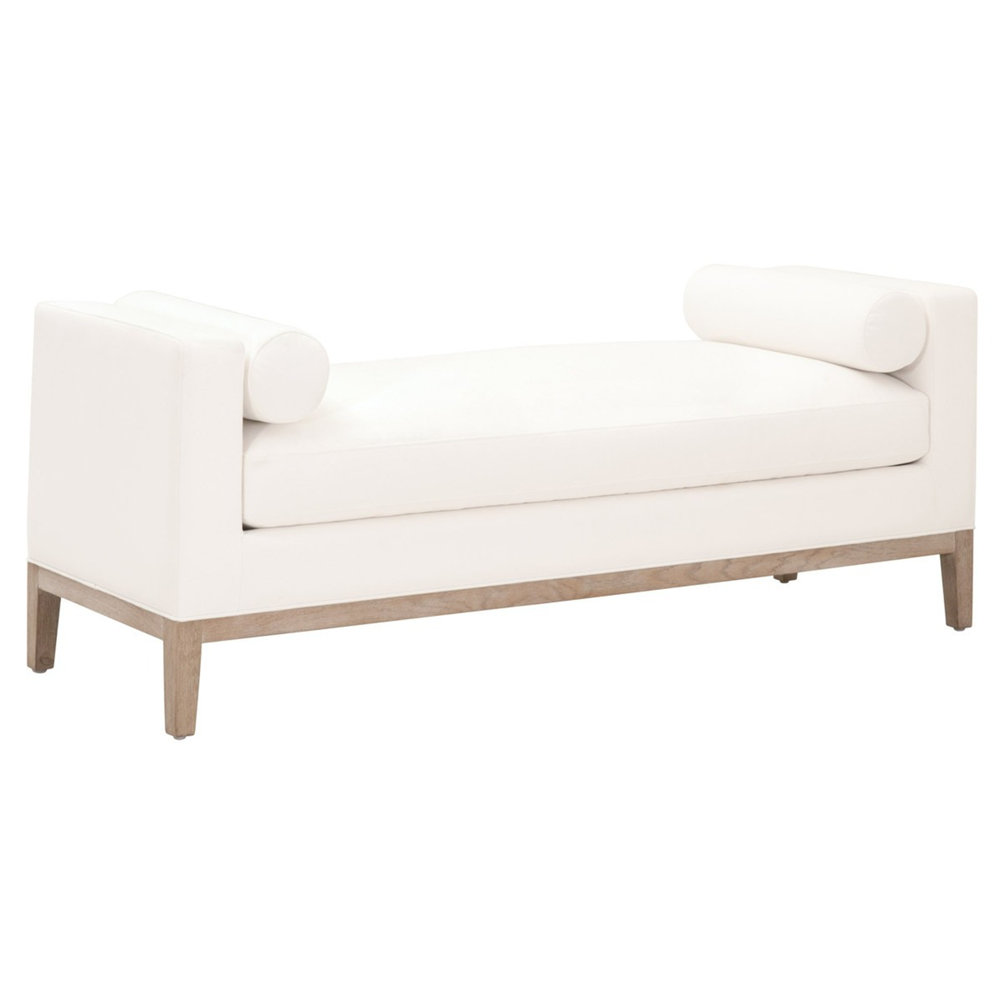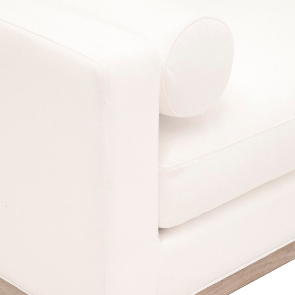 Ideal for many purposes, this Keaton Upholstered Bench can be put in any room. It is upholstered with LiveSmart Peyton Pearl performance fabric and features a removable seat cushion and decorative bolster pillows. The performance fabric coverings can be unzipped and taken off from the cushions, for easier cleaning and fluffing. Its legs and exposed wood base are made of solid oak with natural gray undertones.