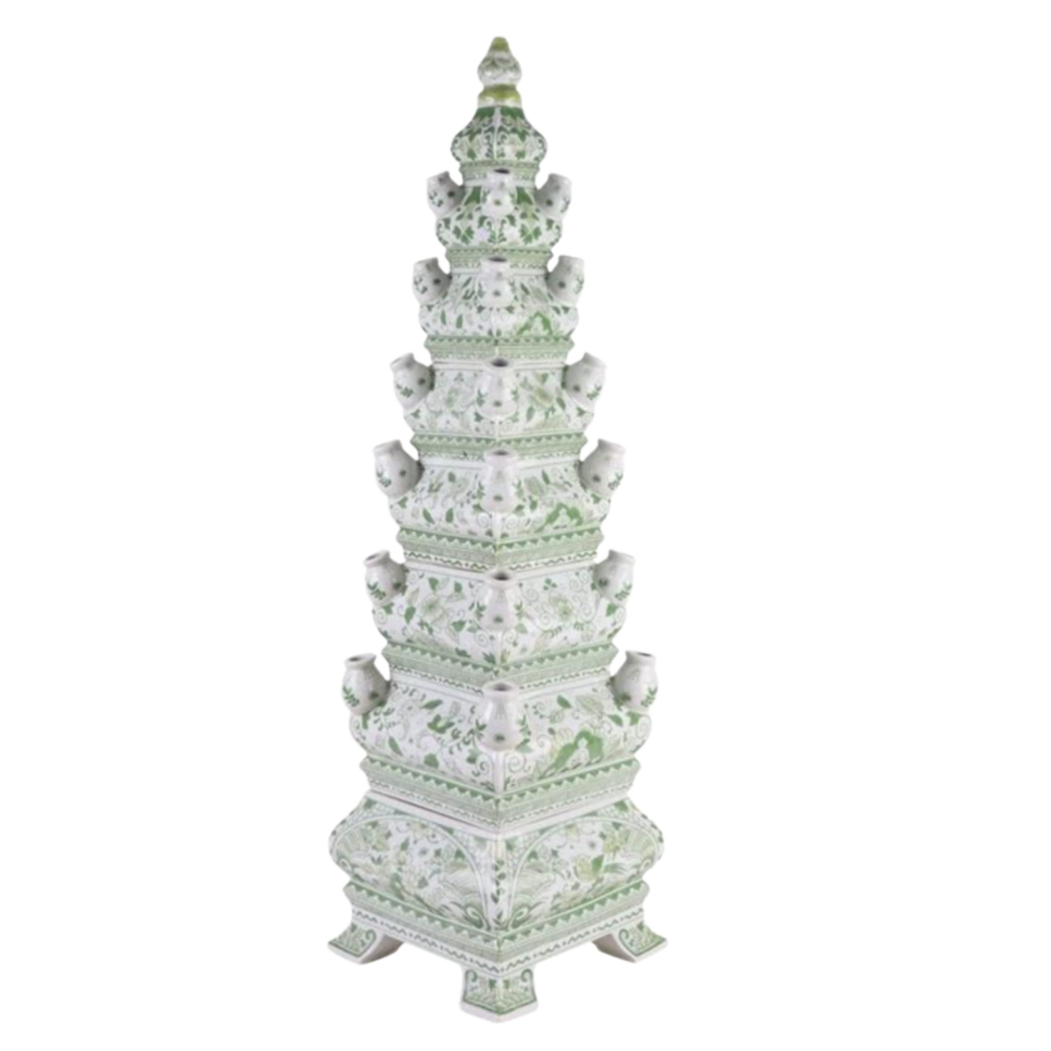 Capture the essence of timeless elegance with our Grand Green and White Tulipiere. Each piece is a masterpiece of craftsmanship, adorned with delicate green and white hand-painted scenes that wrap around the entire body of the tulipiere. Perfect as a standalone statement piece or paired with its companions, this tulipiere is composed of four separate pieces.