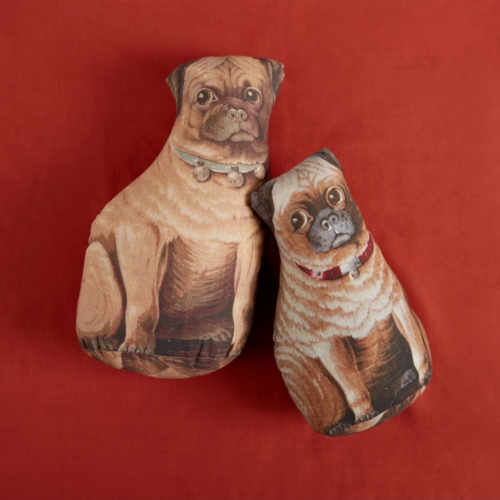 The design of this pug shaped decorative pillow is based on a vintage sew at home pattern that was produced in the late 19th and early 20th centuries. Click images for greater detail.
