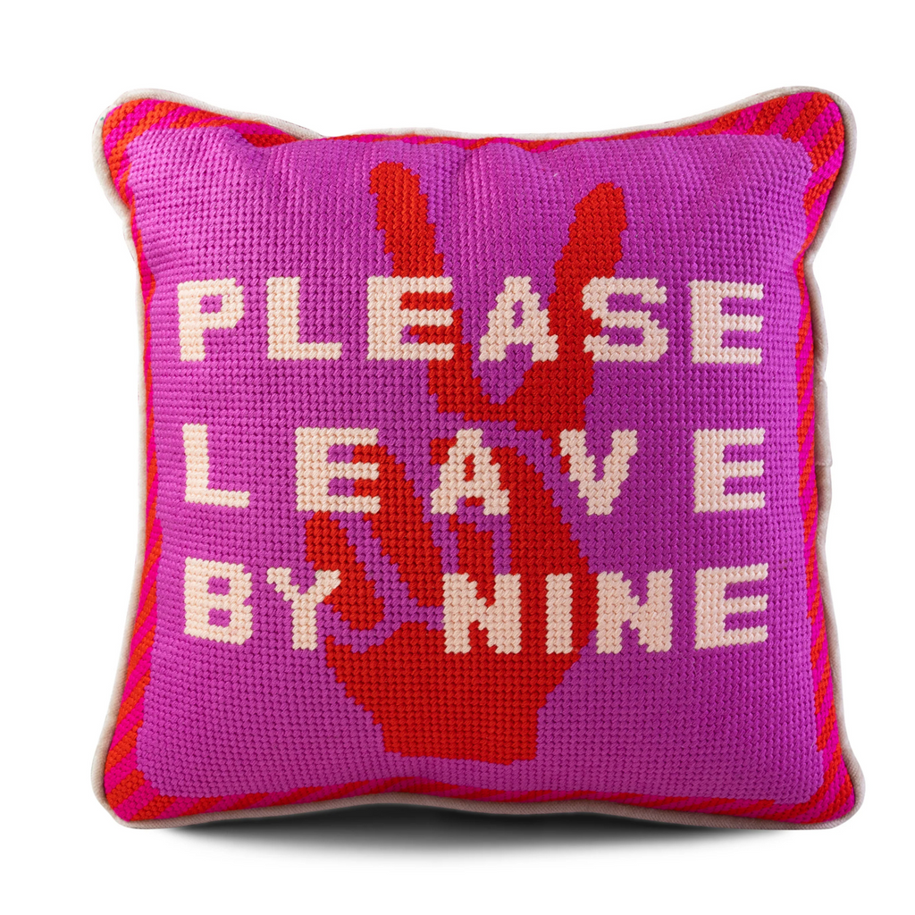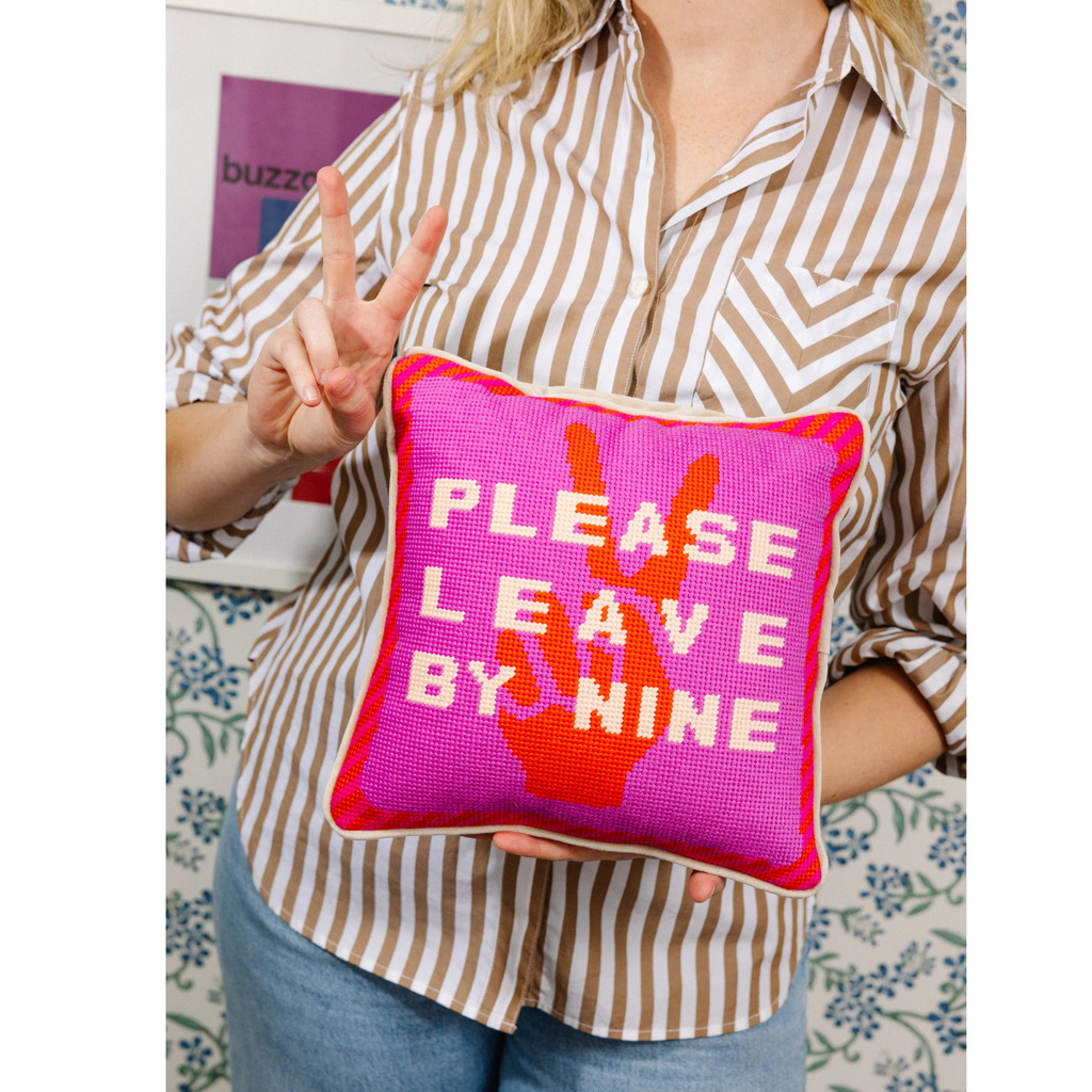 For those who believe that hospitality has a curfew—this pillow is for you. It’s made for the gracious host who knows how to say, “Please leave by nine,” with a smile. Because when it’s time to wrap things up, it’s okay to send your guests home—politely, but firmly. Bring a burst of joy to your space with this Needlepoint and Statement Pillows. Featuring bold colors, fun prints, and unapologetically honest phrases, the pillows are here to lift spirits and spark laughter—because your home should be your happy place. Hand-stitched and finished with luxe velvet backing, a modern twist on a beloved Southern tradition.