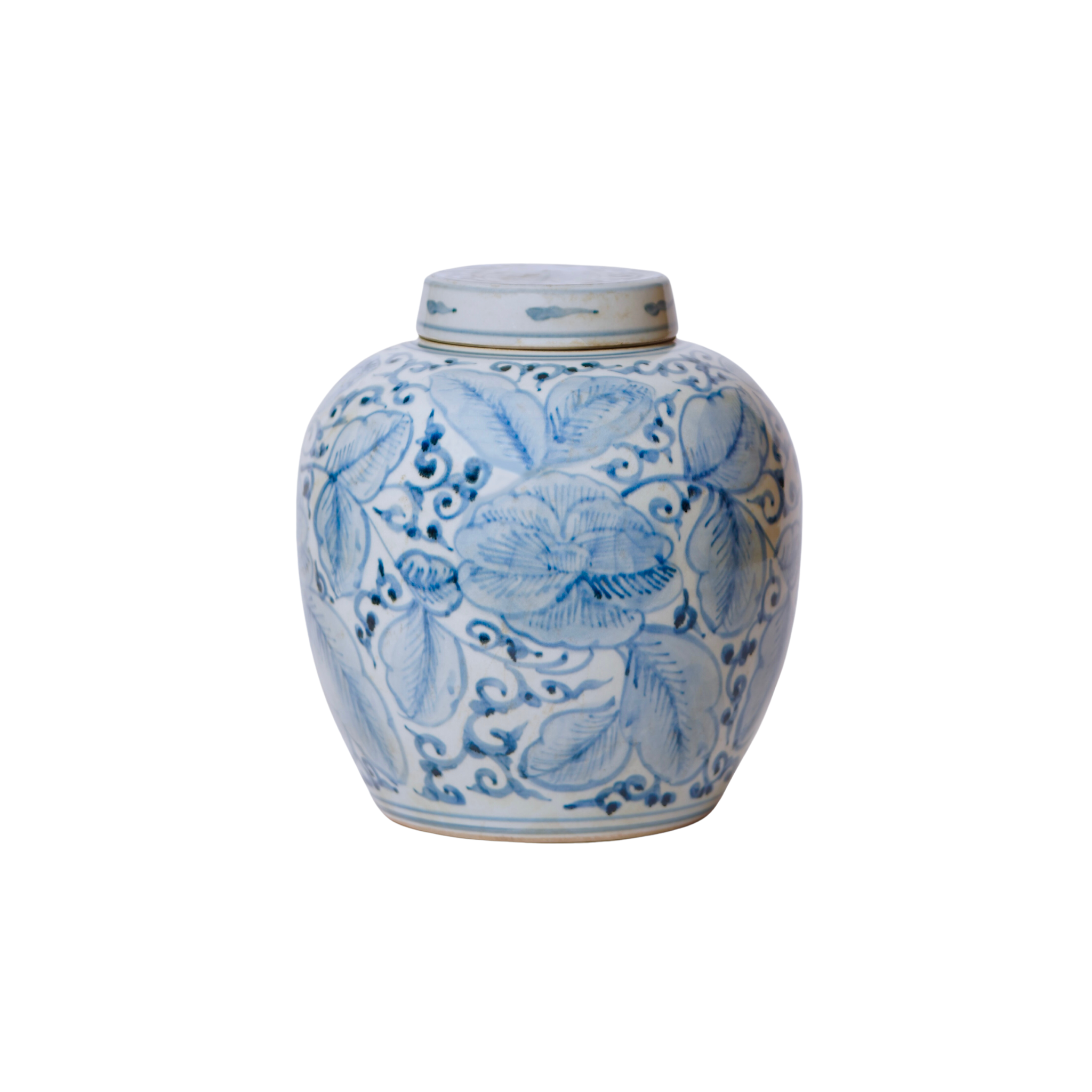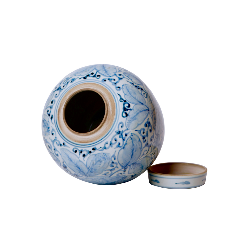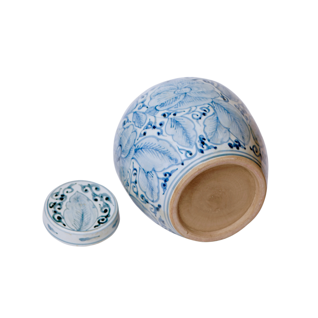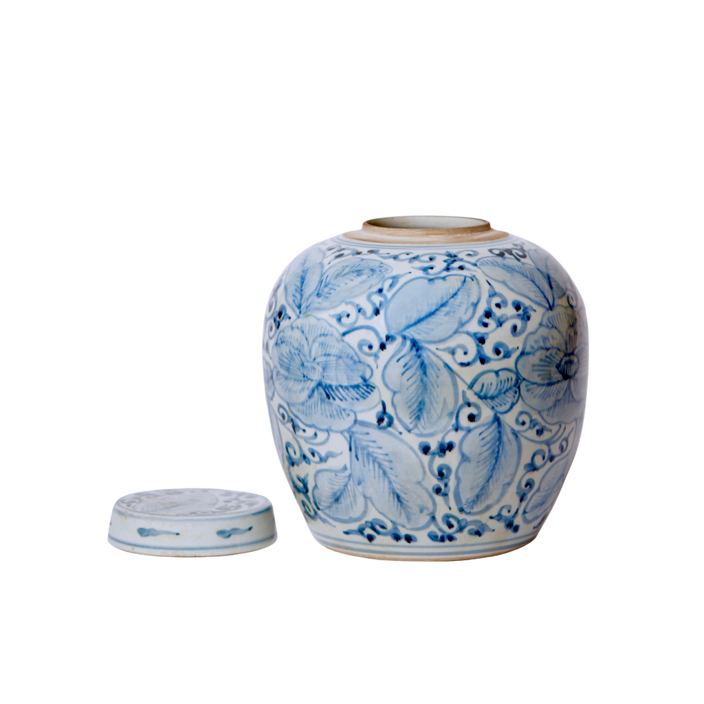 The intricate hand painted piece is a rustic porcelain blue and white round lidded storage jar with rose design. Click images for greater detail.