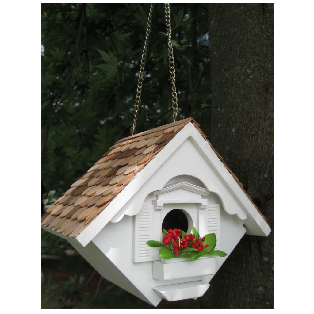 This Little White birdhouse is a hanging house designed to accommodate House Wrens, one of the only species that enjoy a swinging nest box! Topped with western red cedar, this charming little cottage has a window box frame and planter with decorative flowers (removable for outdoor use). Fully functional house has a bottom panel that can be easily removed for yearly cleaning. Sturdy galvanized metal chain.