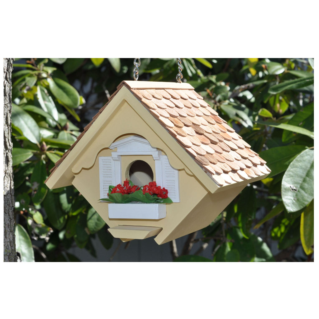 This Little Yellow birdhouse is a hanging house designed to accommodate House Wrens, one of the only species that enjoy a swinging nest box! Topped with western red cedar, this charming little cottage has a window box frame and planter with decorative flowers (removable for outdoor use). Fully functional house has a bottom panel that can be easily removed for yearly cleaning. Sturdy galvanized metal chain.