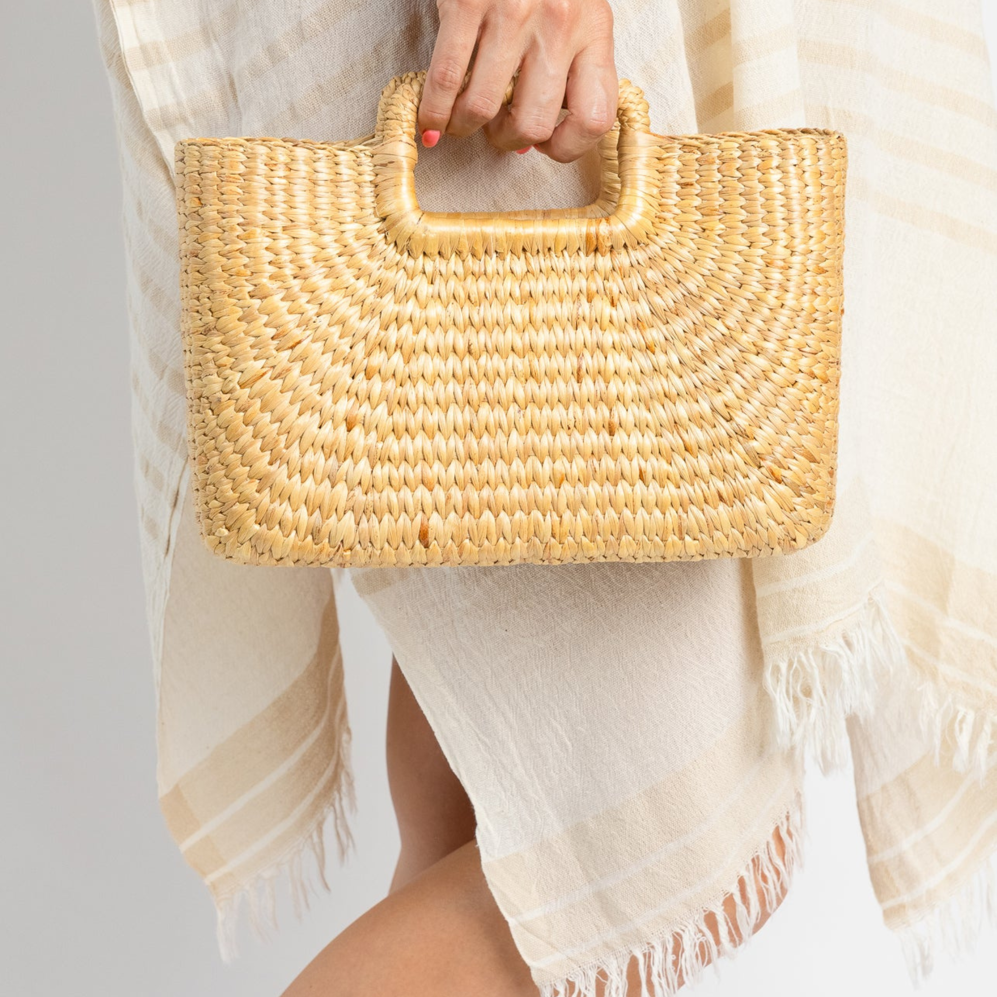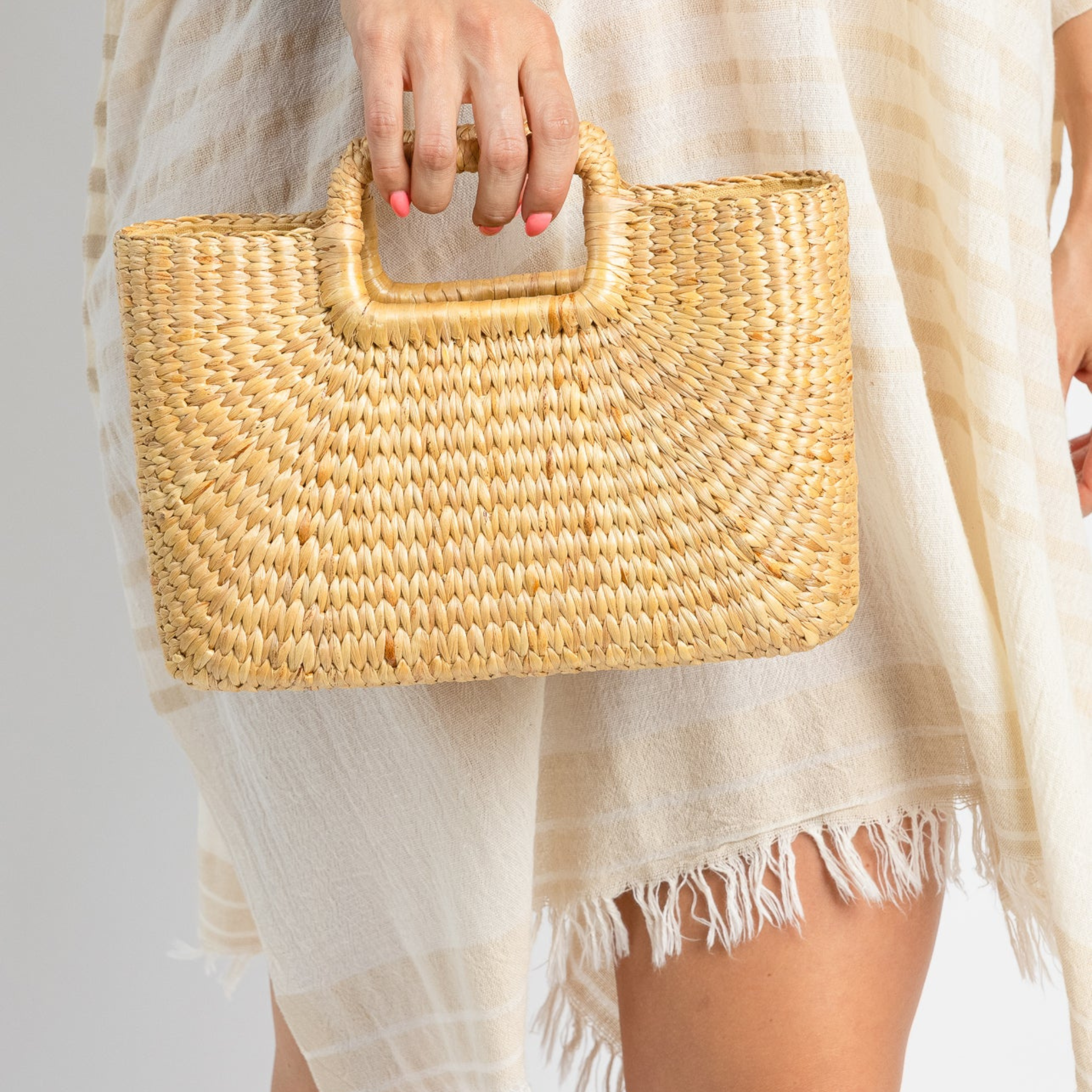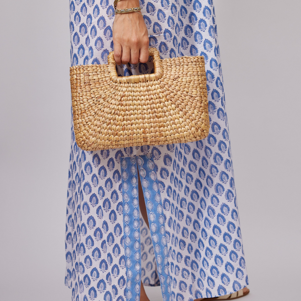 Our Lola Bag is a beautifully woven hyacinth tote, great for farmers markets or walking around town. Simple structured rectangular handles for a clean and classic hold.