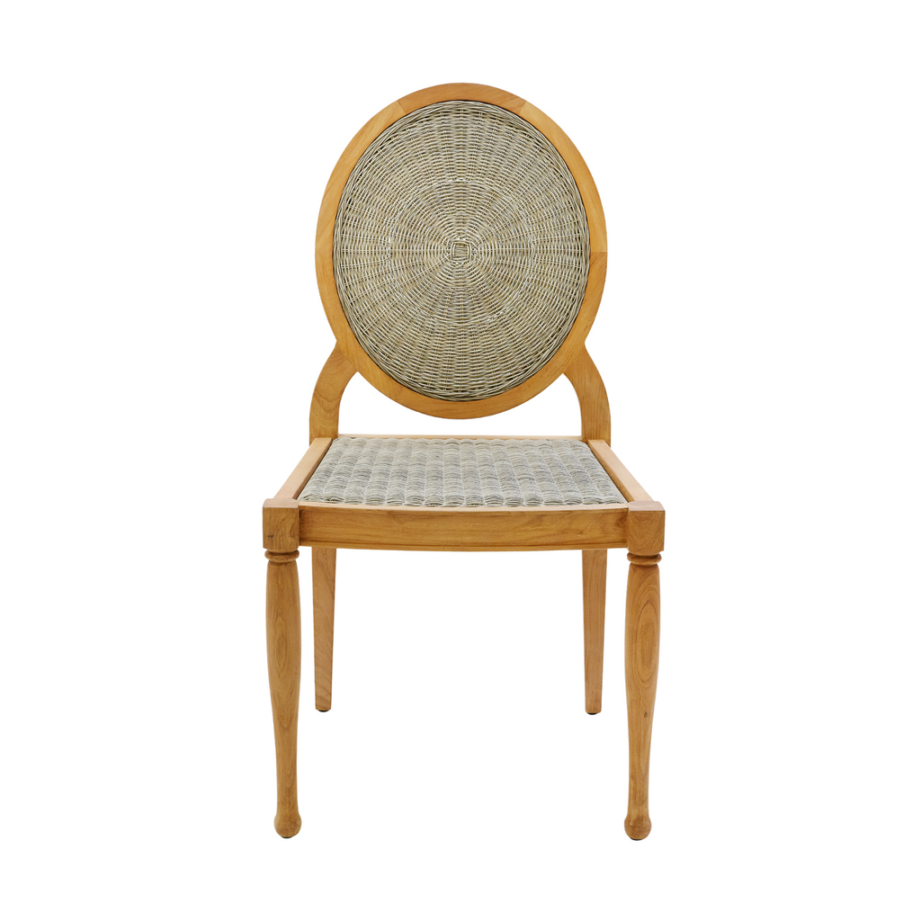 A clean and precise new outdoor chair inspired by the traditional Louis XVI chair shape. Framed in sustainably sourced teak, which will naturally weather to a warm silvery gray if left in the sunshine and rain, we’ve paired it with an all-weather wicker woven seat and back in gray. If never exposed to the elements the two materials make a pretty contrast, and if left outdoors the two materials will eventually harmonize mono-chromatically.