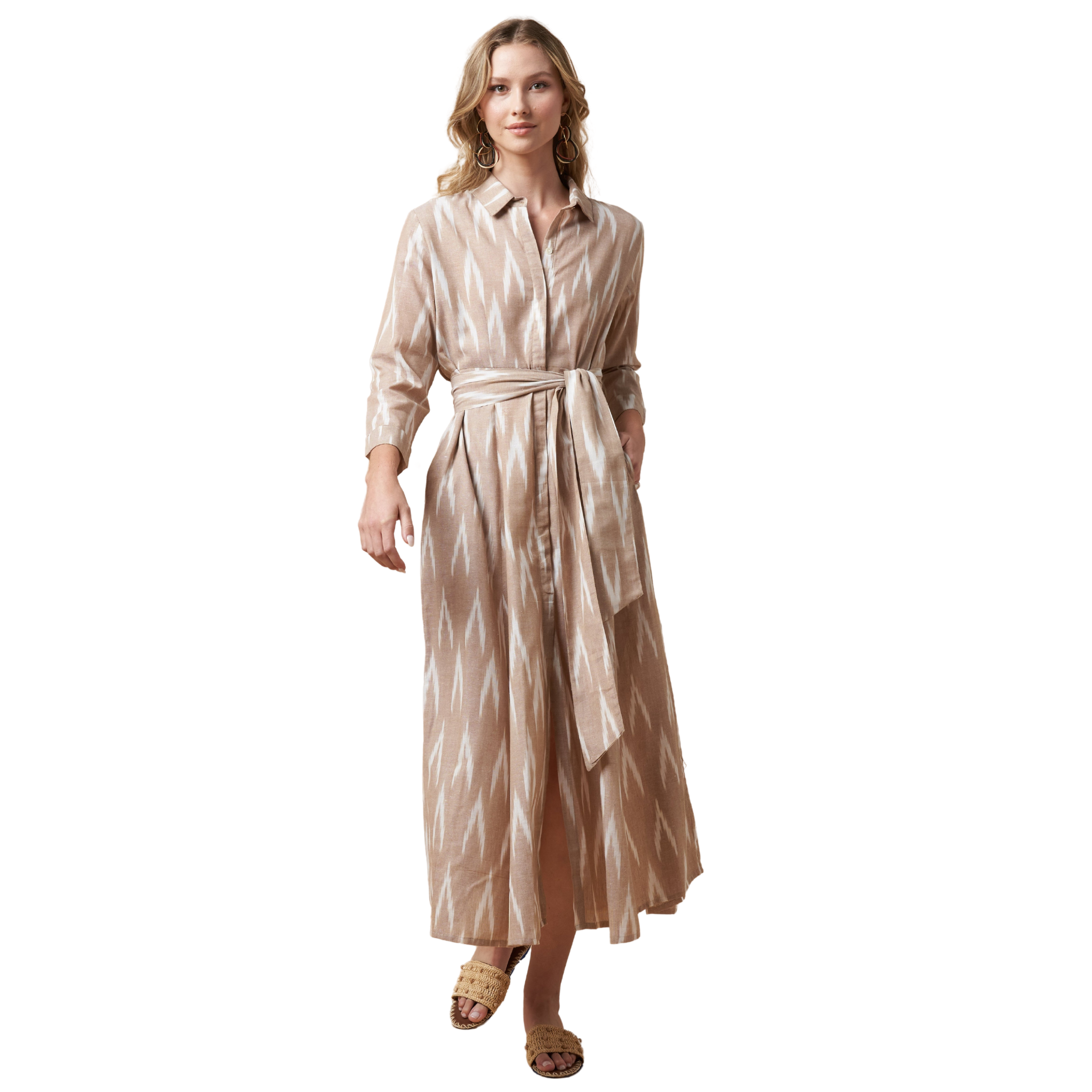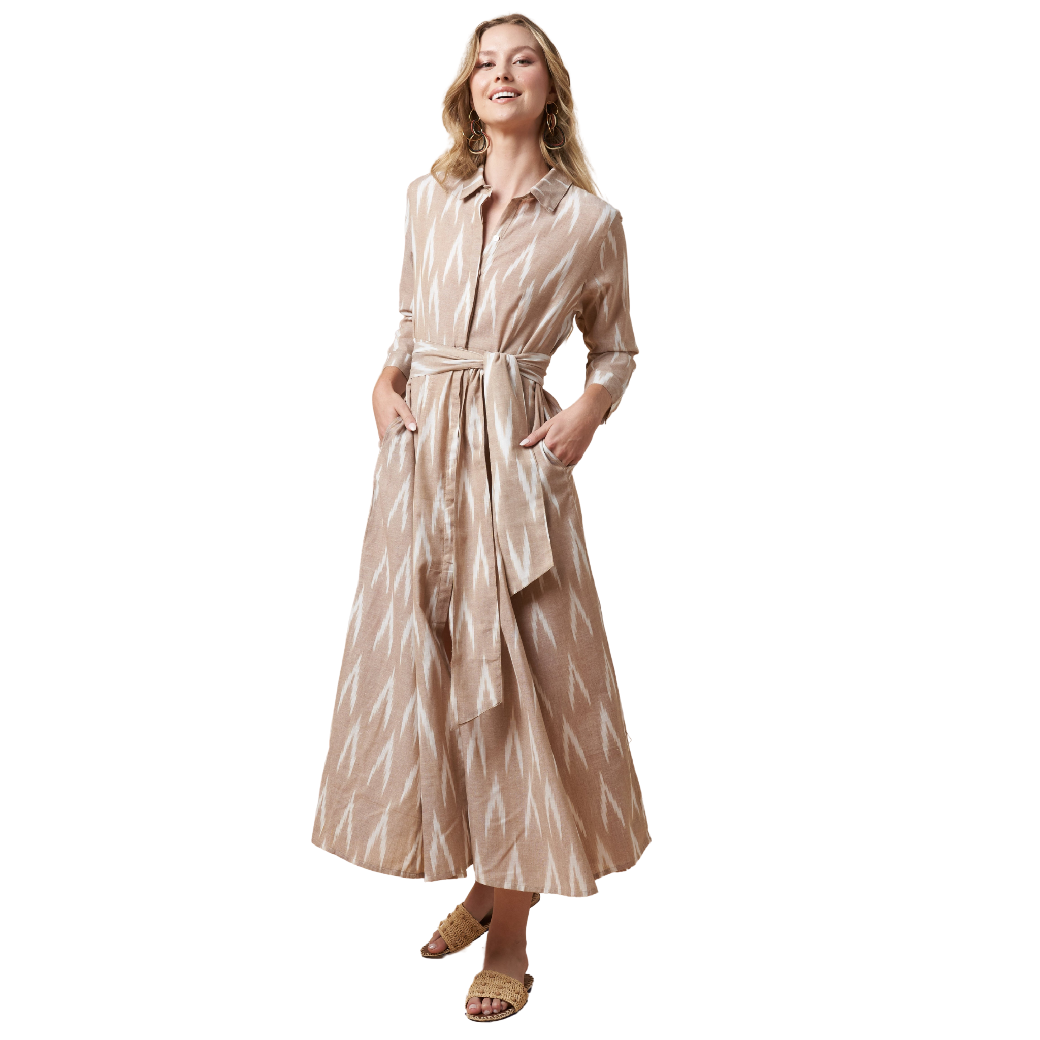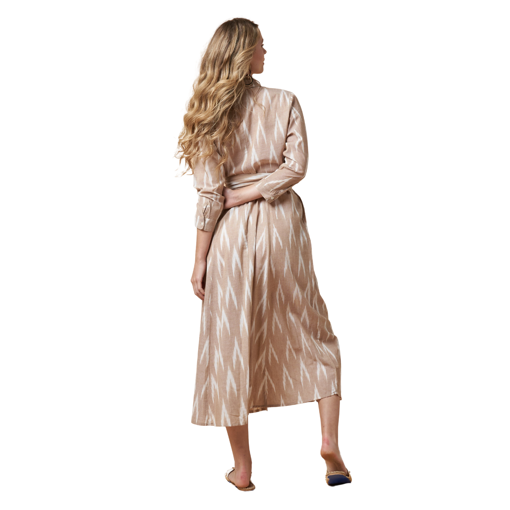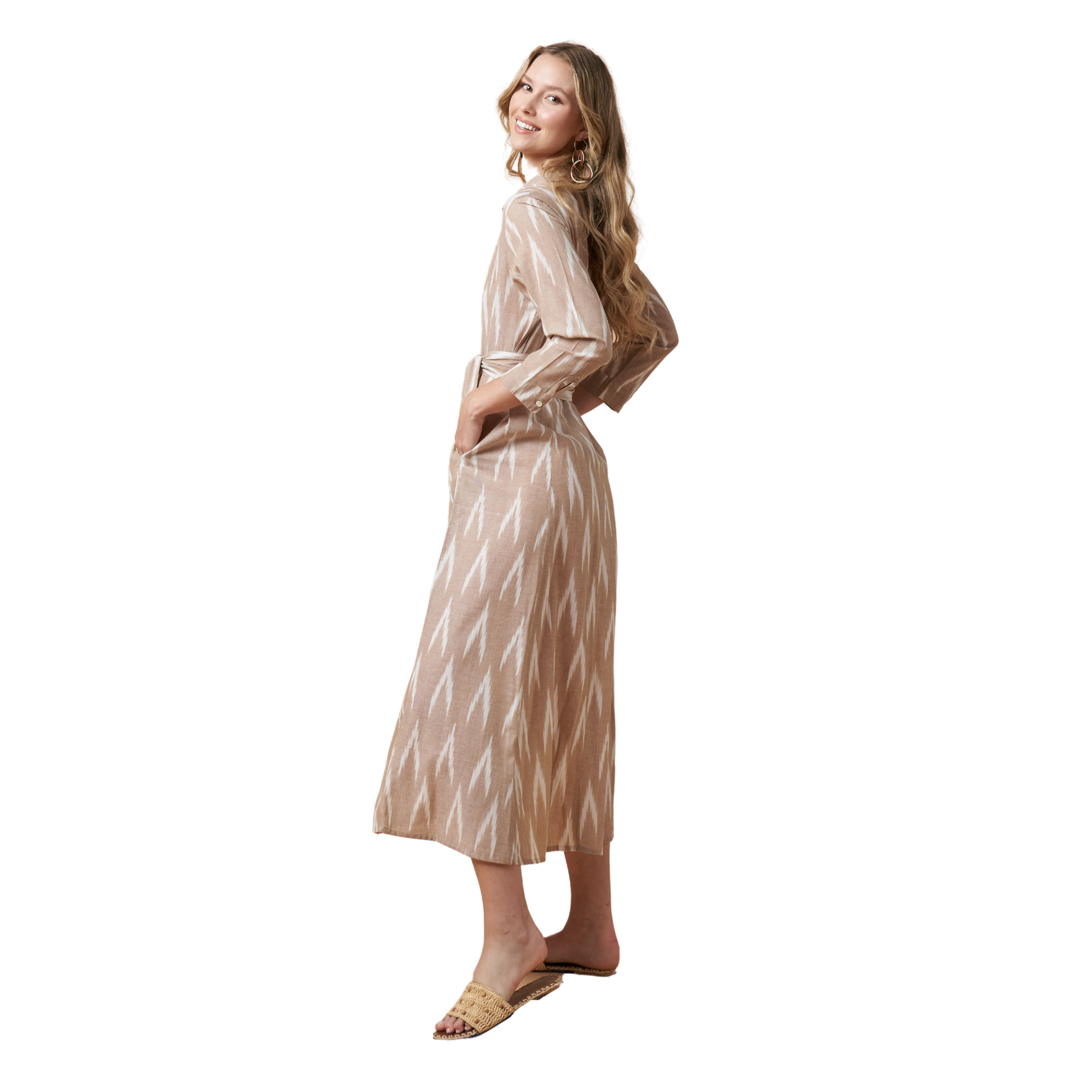 The Luciana Ikat Dress in Khaki is a timeless blend of effortless sophistication and artisanal craftsmanship. Made from 100% cotton, this breezy midi dress features a relaxed silhouette, elegant sleeves, and a striking ikat print that adds a touch of global-inspired charm. Its lightweight, breathable fabric makes it perfect for warm-weather outings, from seaside escapes to stylish weekend brunches. Pair it with sandals for a laid-back look or elevate it with statement accessories for a chic, polished ensemble.