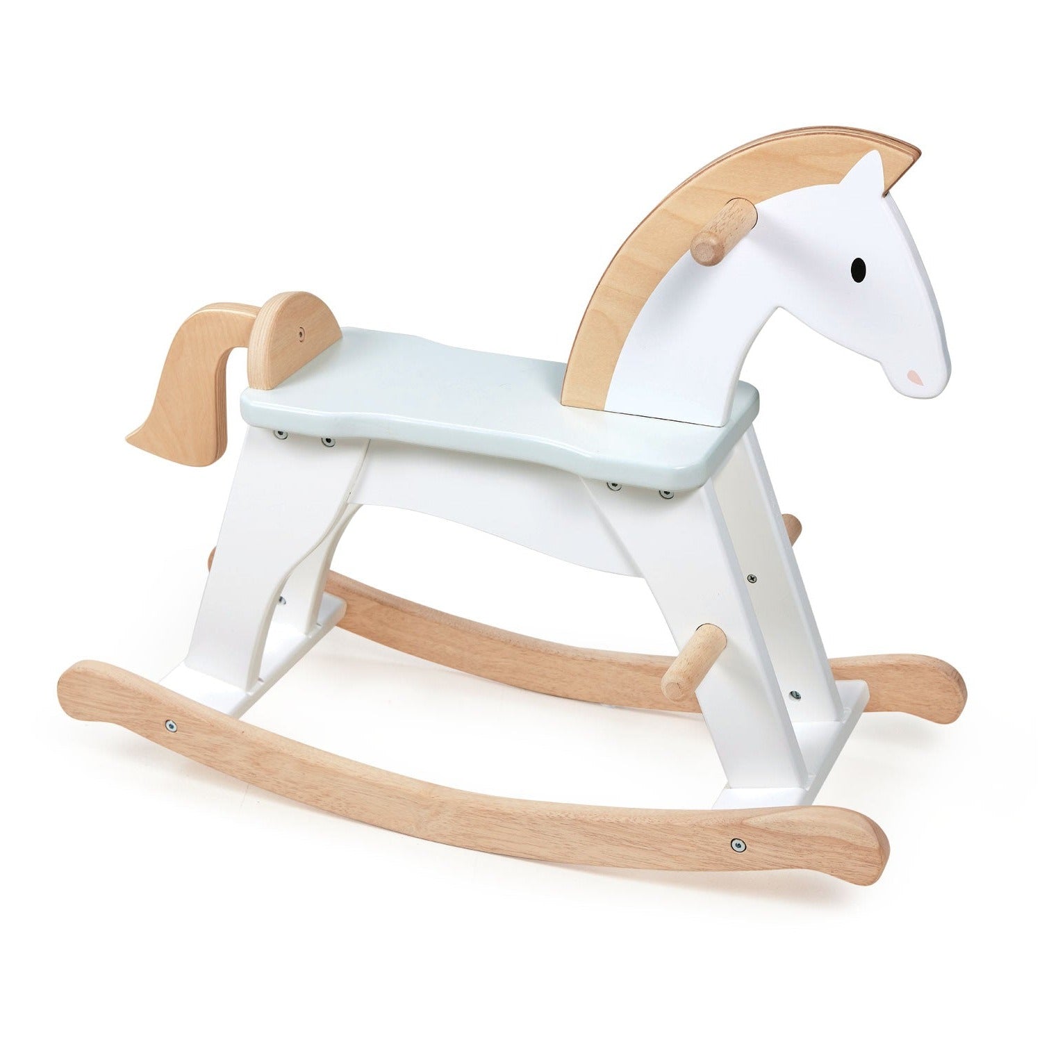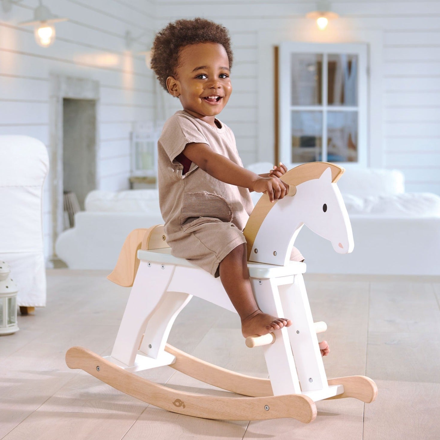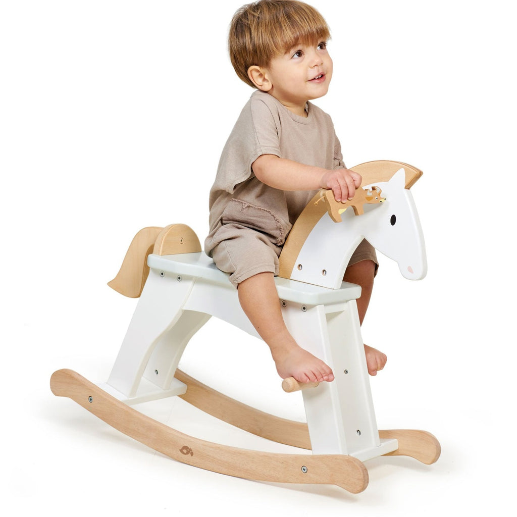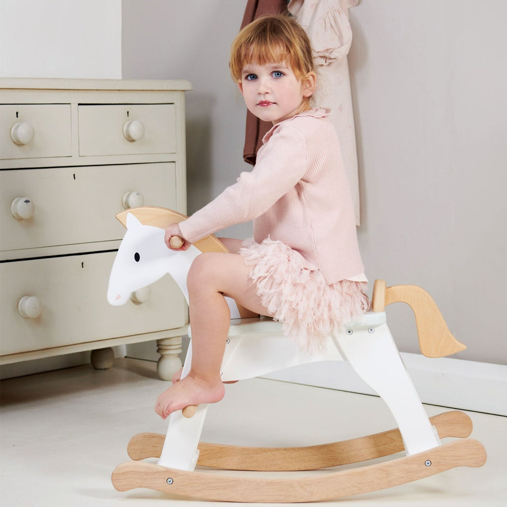 Gallop through the snowfields on your lucky horse. A premium rocking horse inspired by the classics. A traditional and essential toy for the nursery or playroom. Simple and chic, painted in white with details in wood.