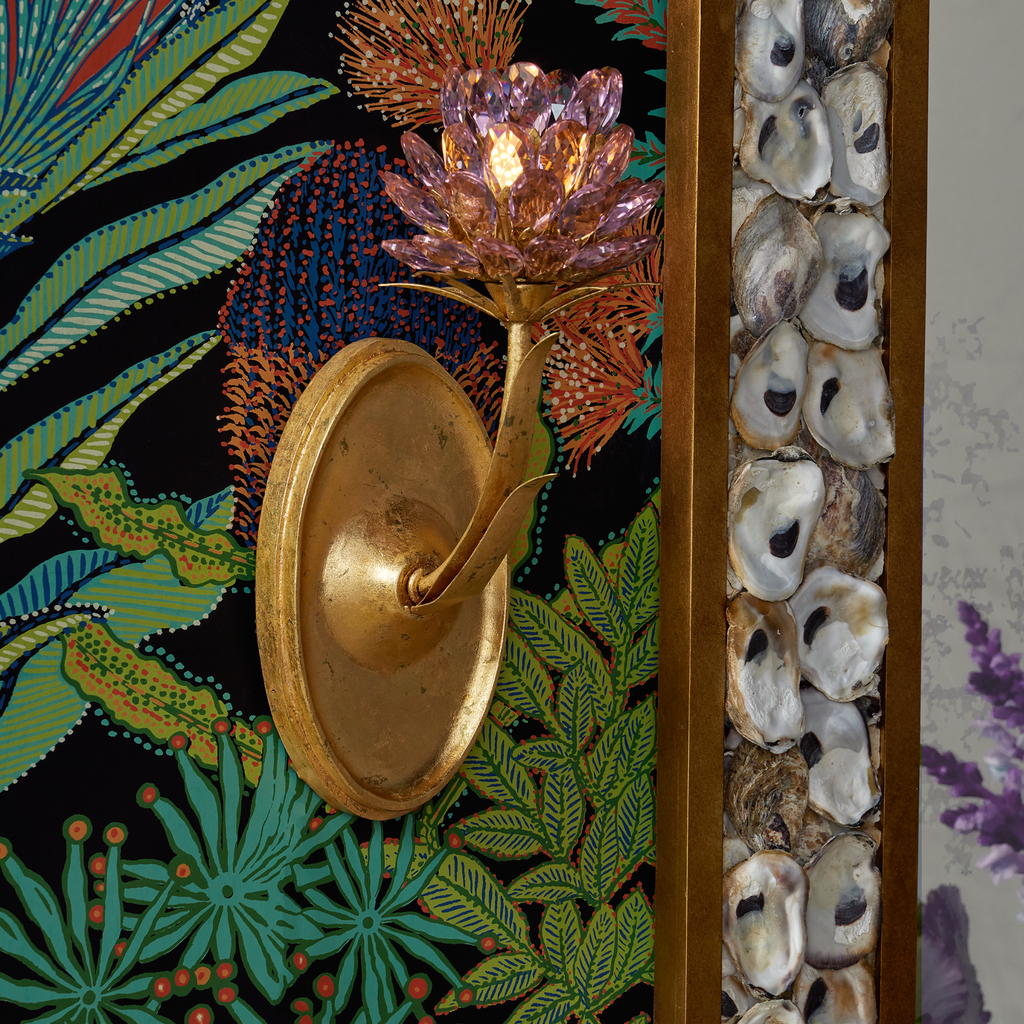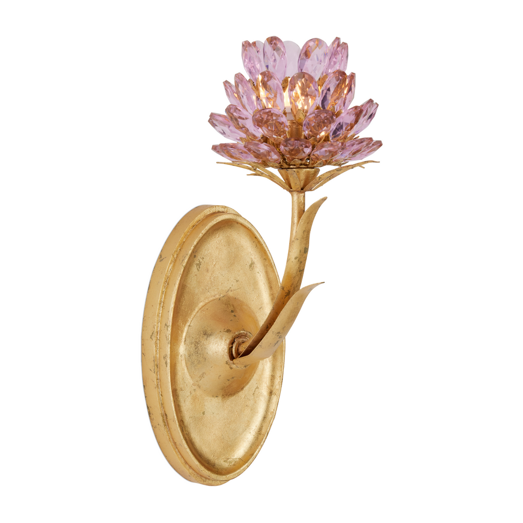 Everything about the Marilee Single-Light Wall Sconce is luminous, from its Dutch Gold Leaf finish to the crystal blossom that rises from the end of its stem. The bulb is nestled into the faceted pink crystals to bring effervescence to the glass. The detailing on the arm looks like leaves flowing up from the wallplate and a palm detail spritzes beneath the blossom like an implied bobeche. The gold wall sconce, which is made of wrought iron, is dimmable.