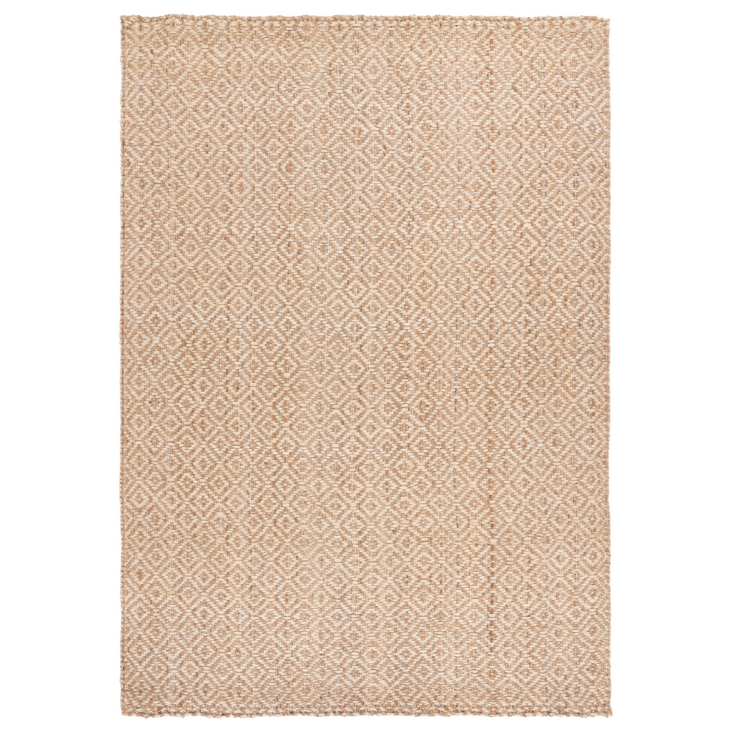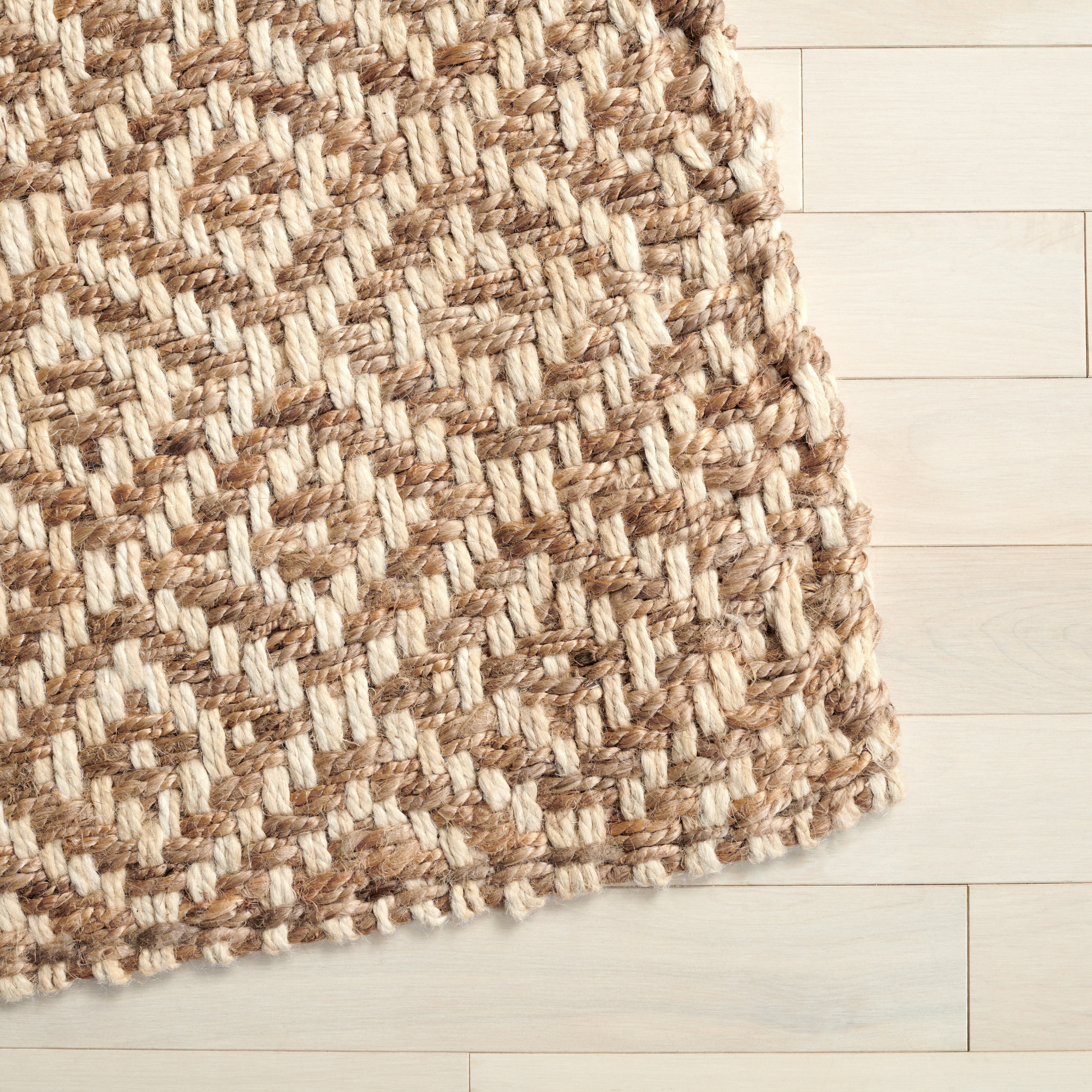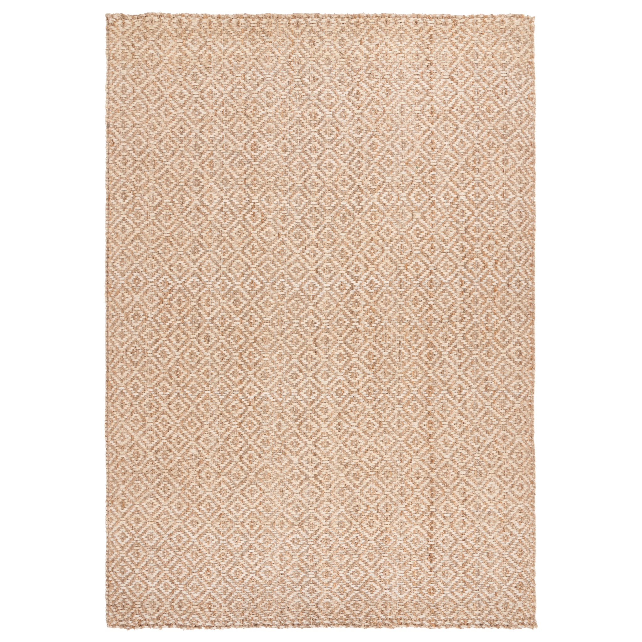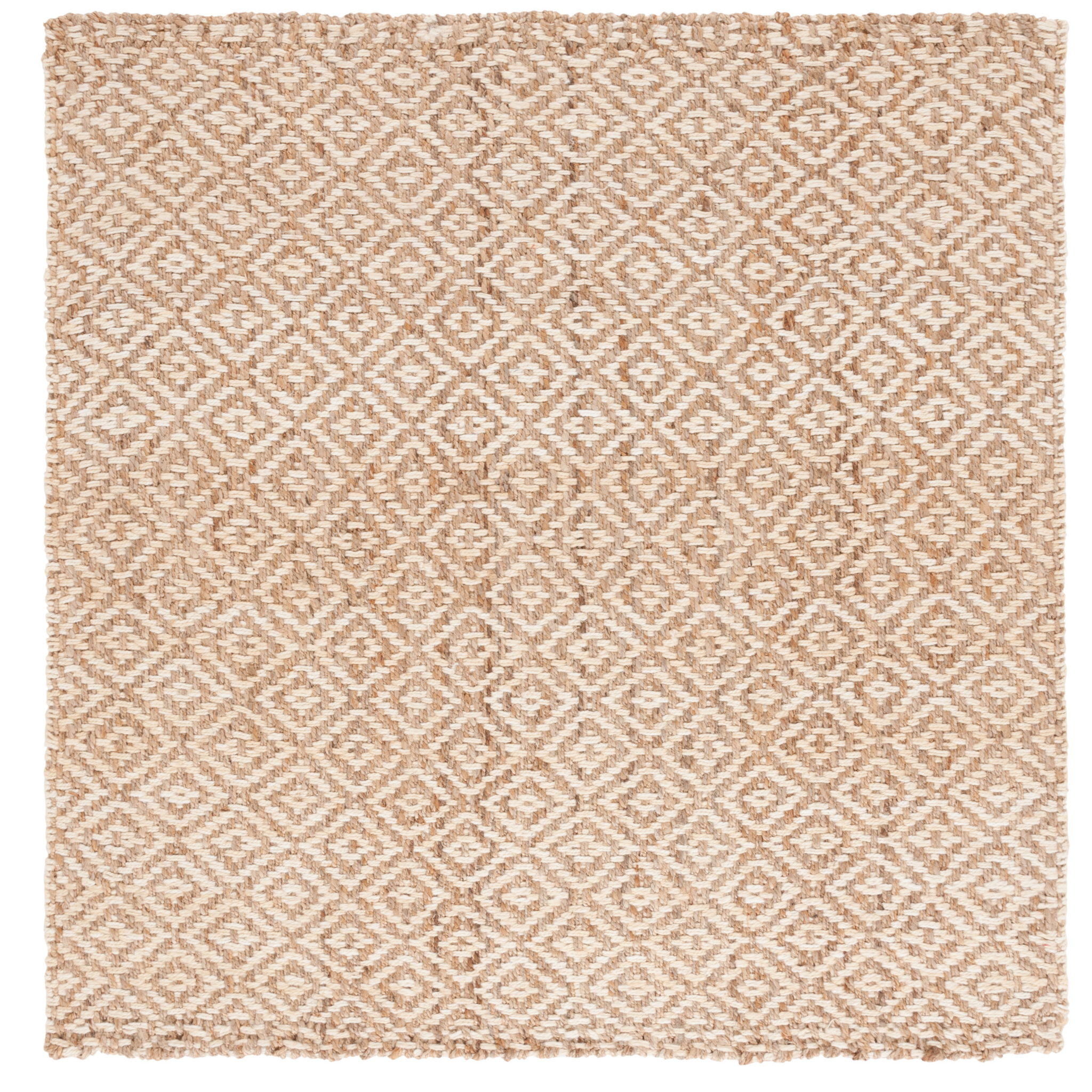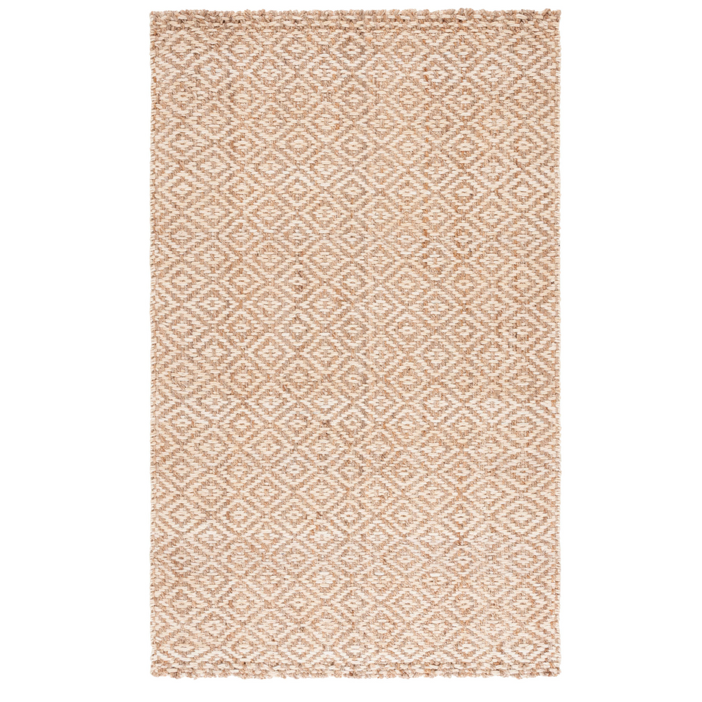 This off-white and beige hand woven jute area rug features a geometric pattern.