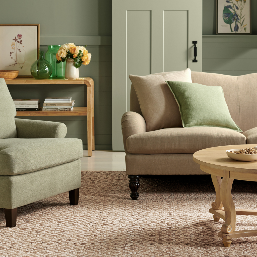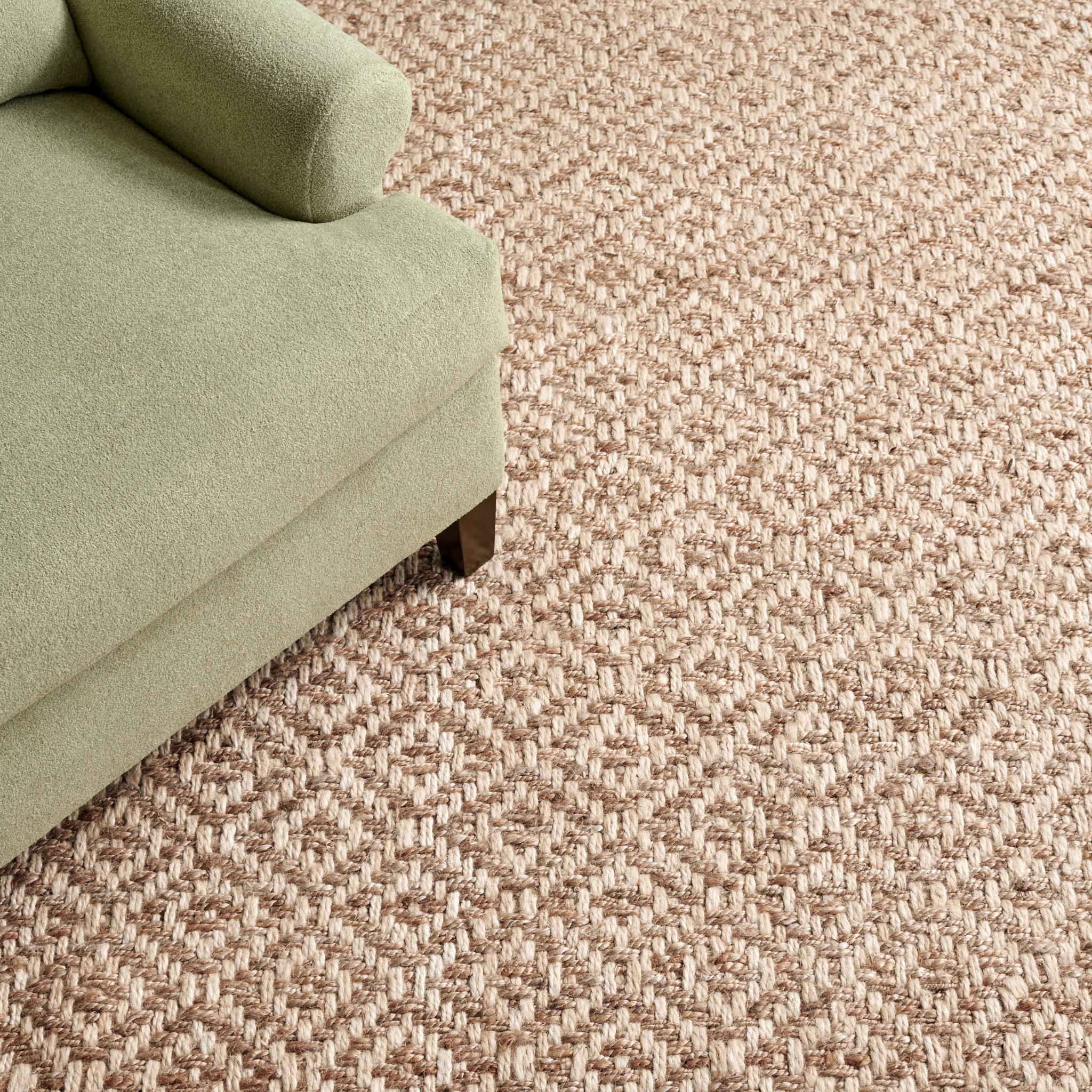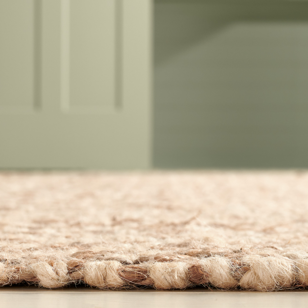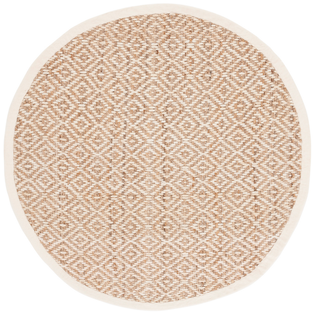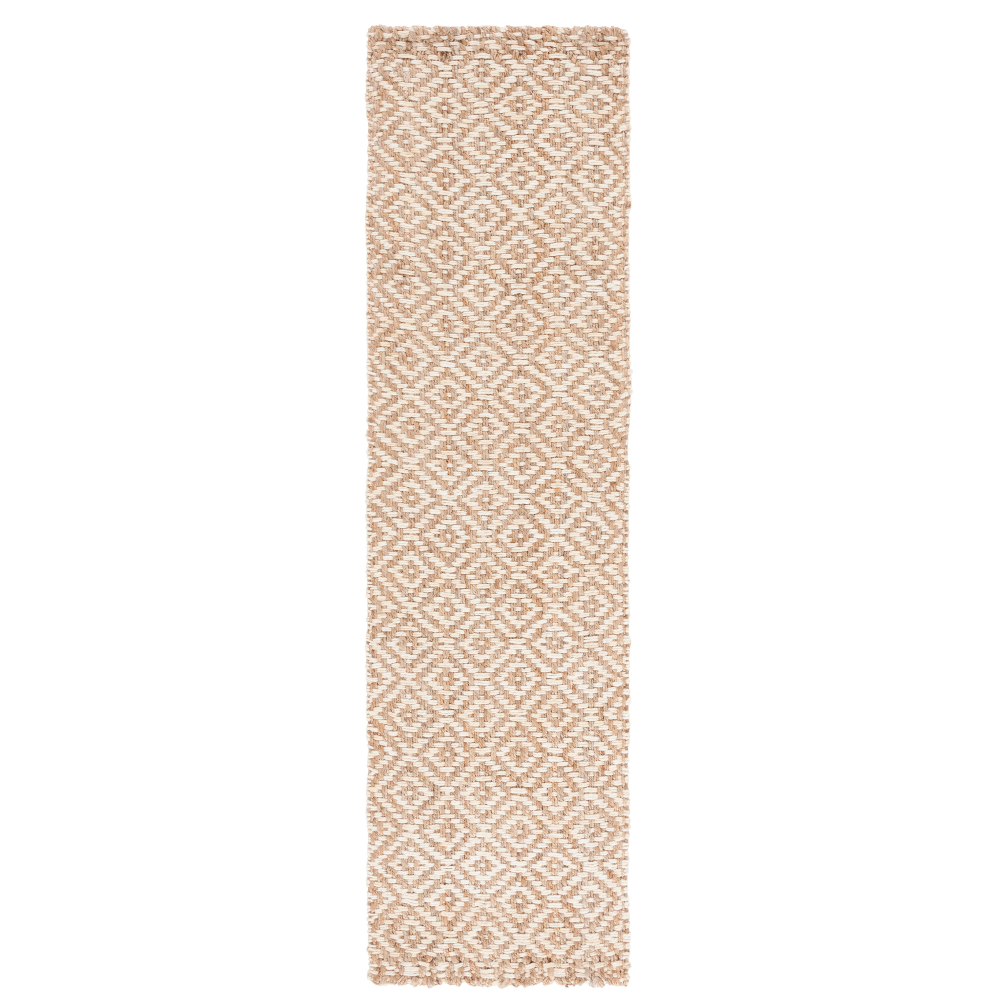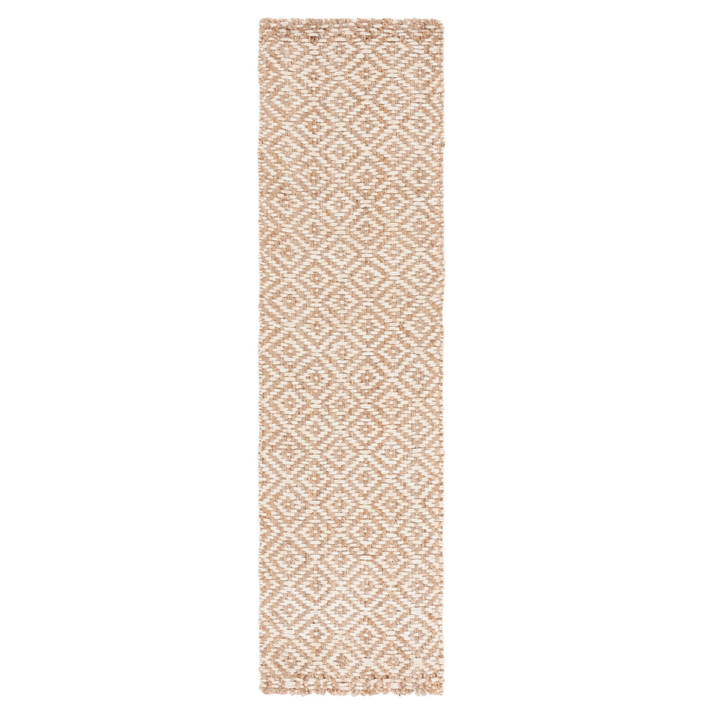 This off-white and beige hand woven jute area rug features a geometric pattern.