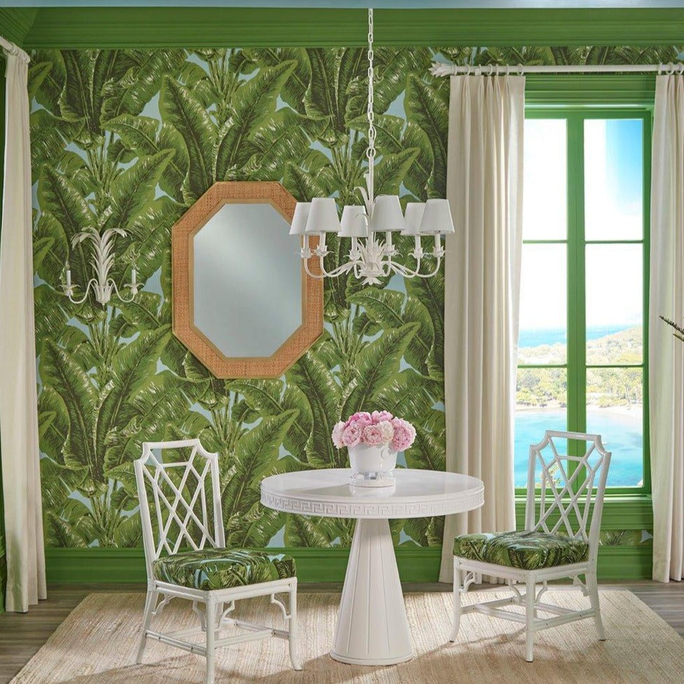 This chandelier features delicate details inspired by a bubbling fountain. This stunning tole chandelier comes with six lights, white shades and 70" of chain for hanging.  Overall Dimensions: 24"h x 28"w x 28"d. Click on images for greater detail.