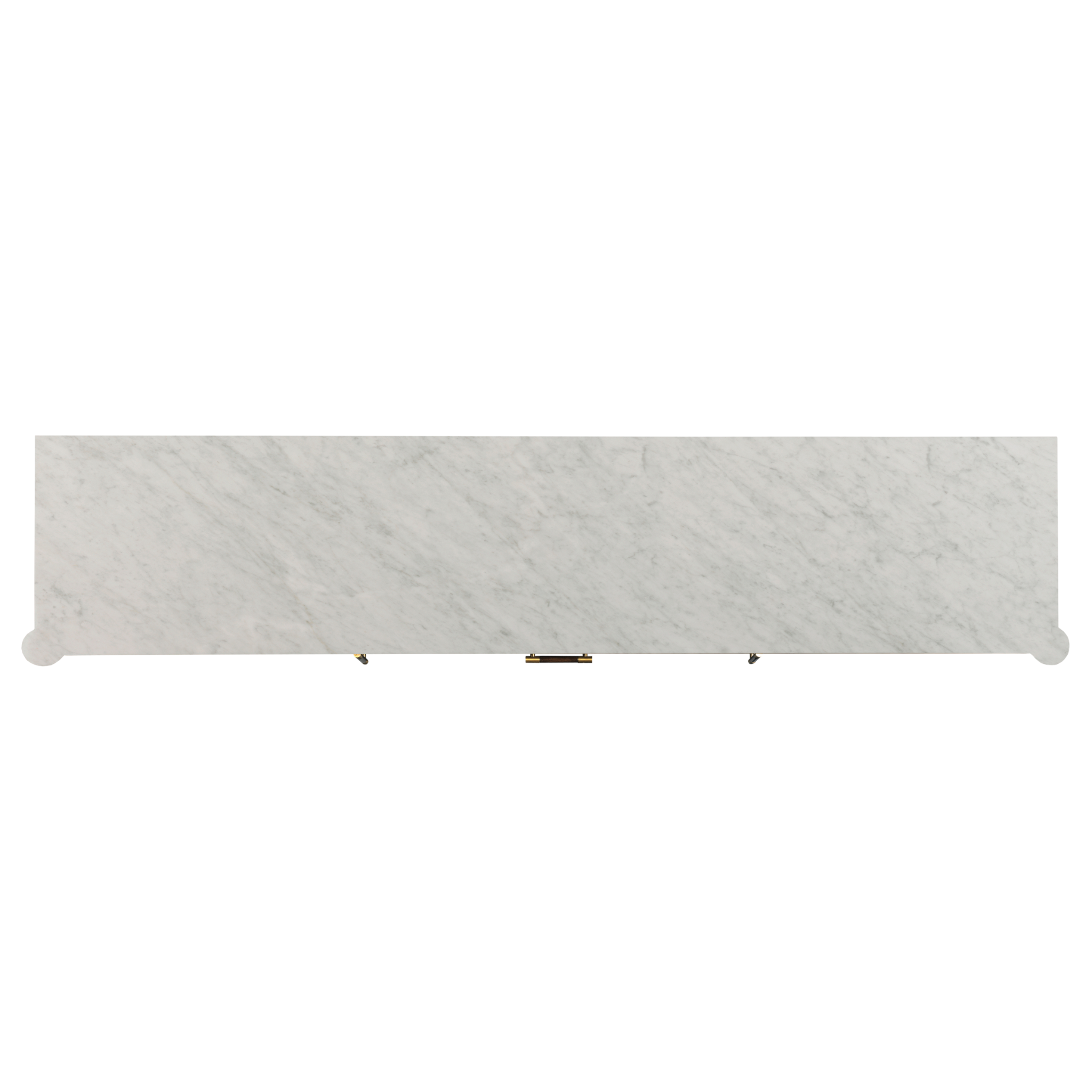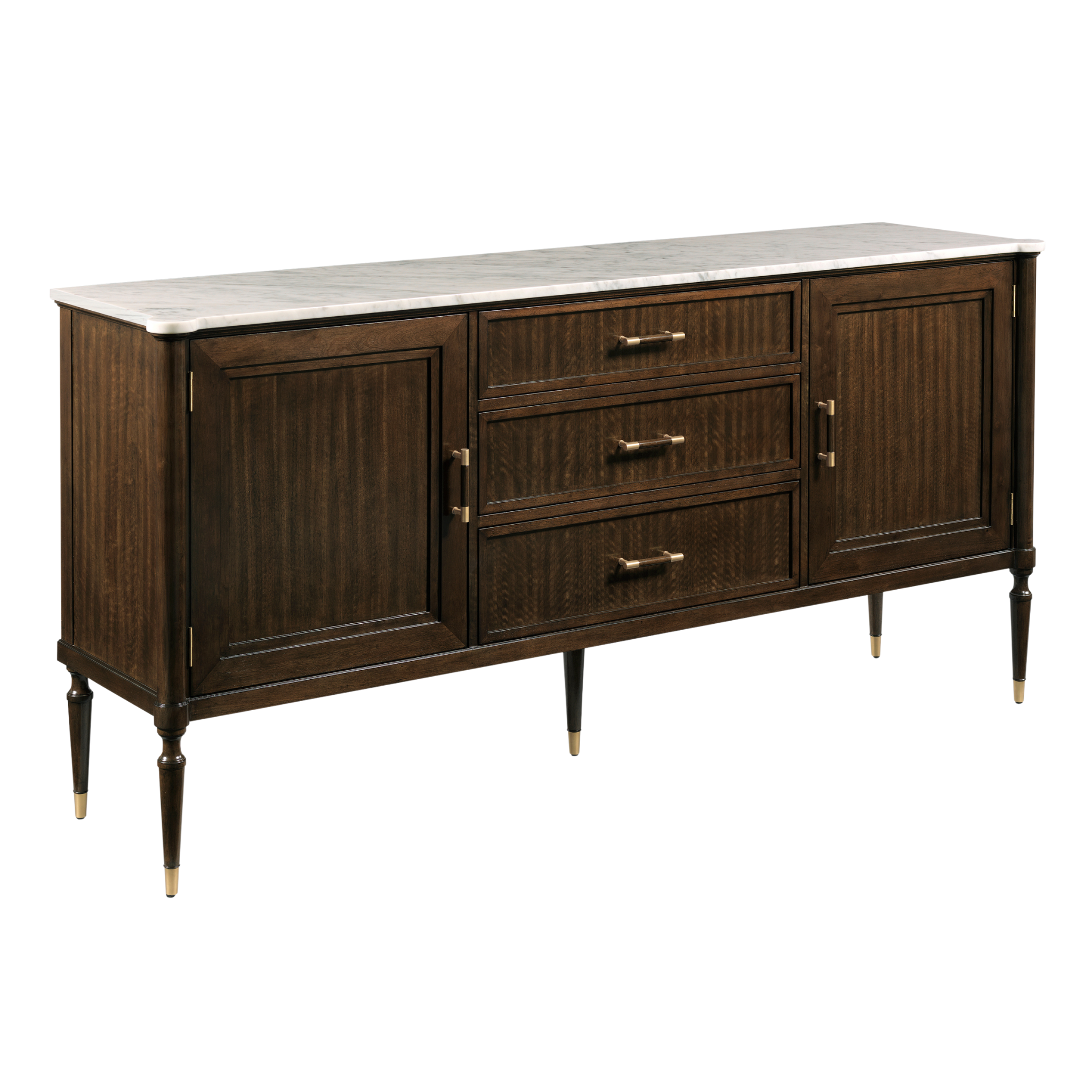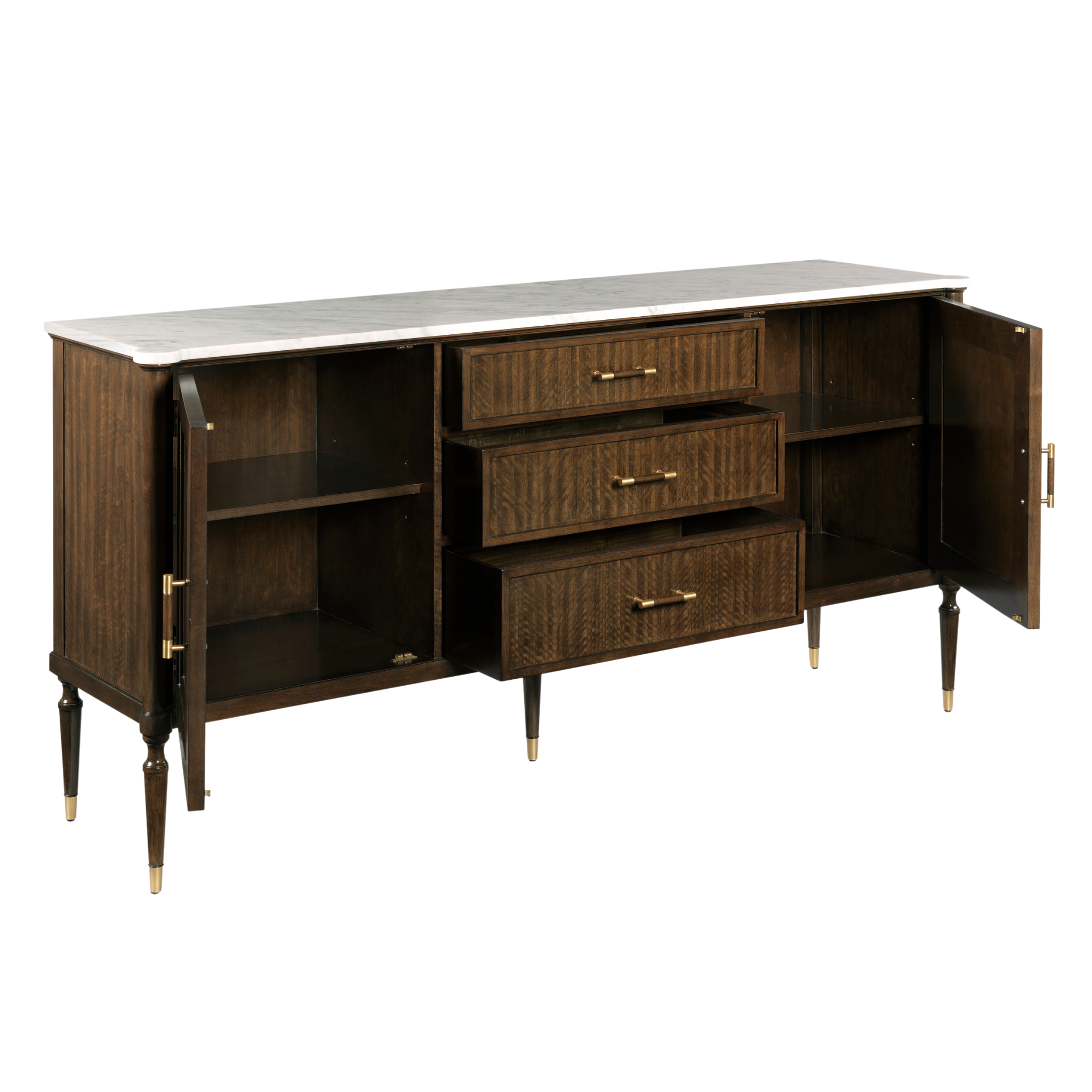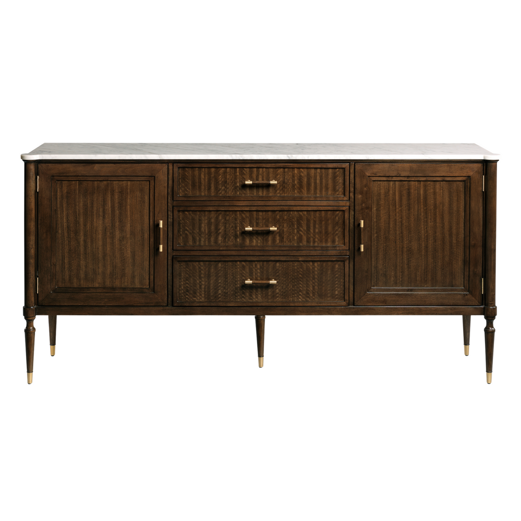 A handsome sideboard styled in the spirit of late 18th Century French Directoire originals with turned round corner posts that flank a storage area with adjustable shelving and three drawers.