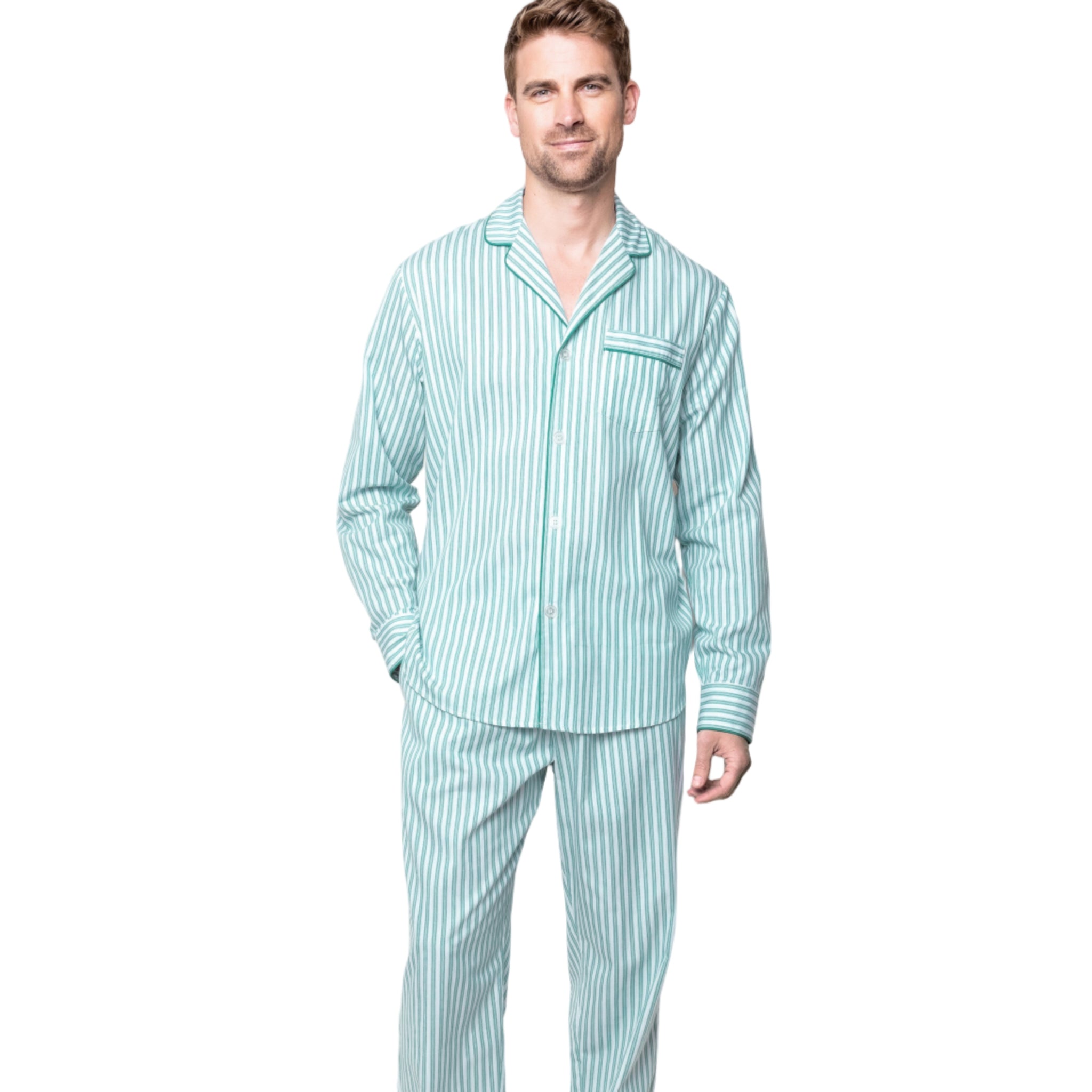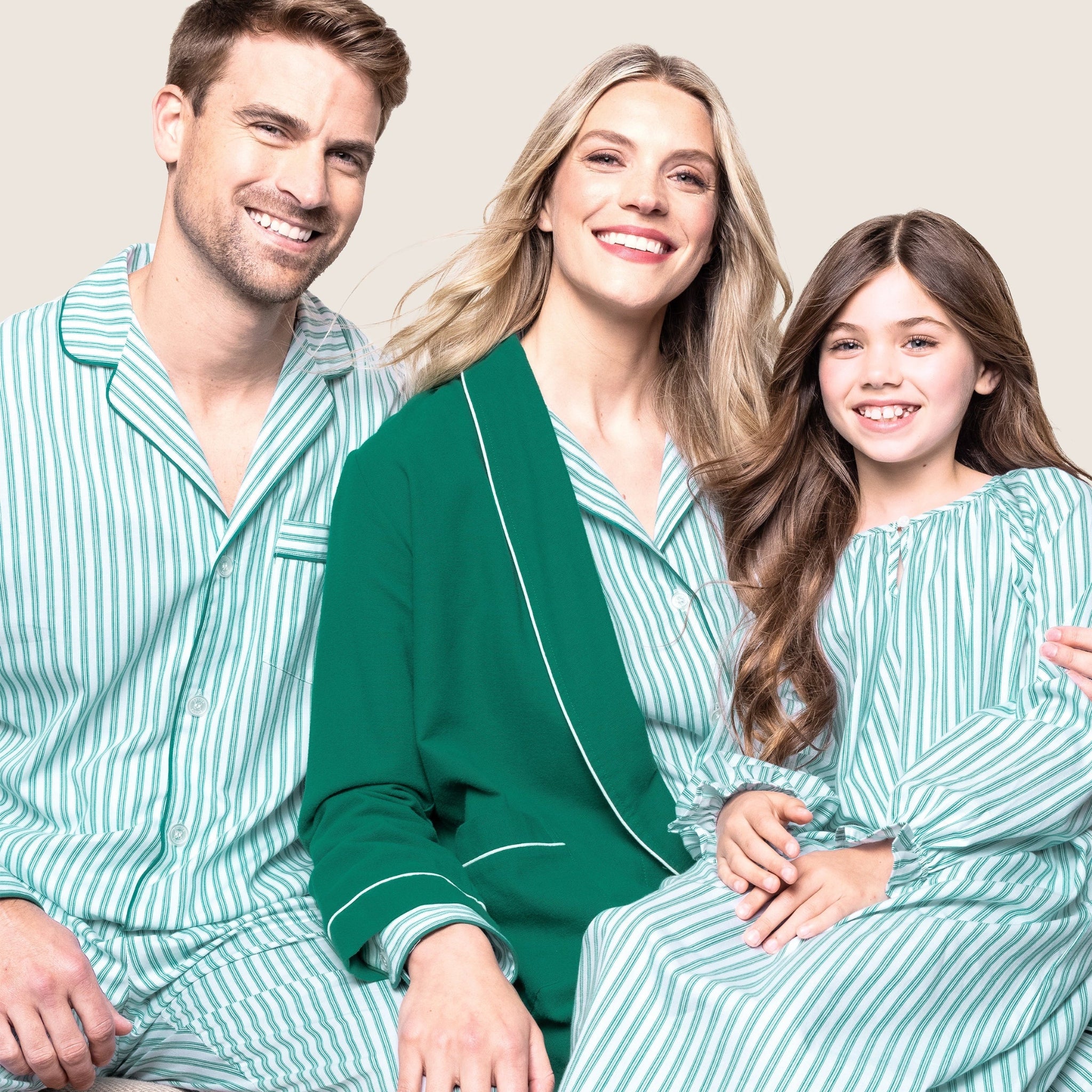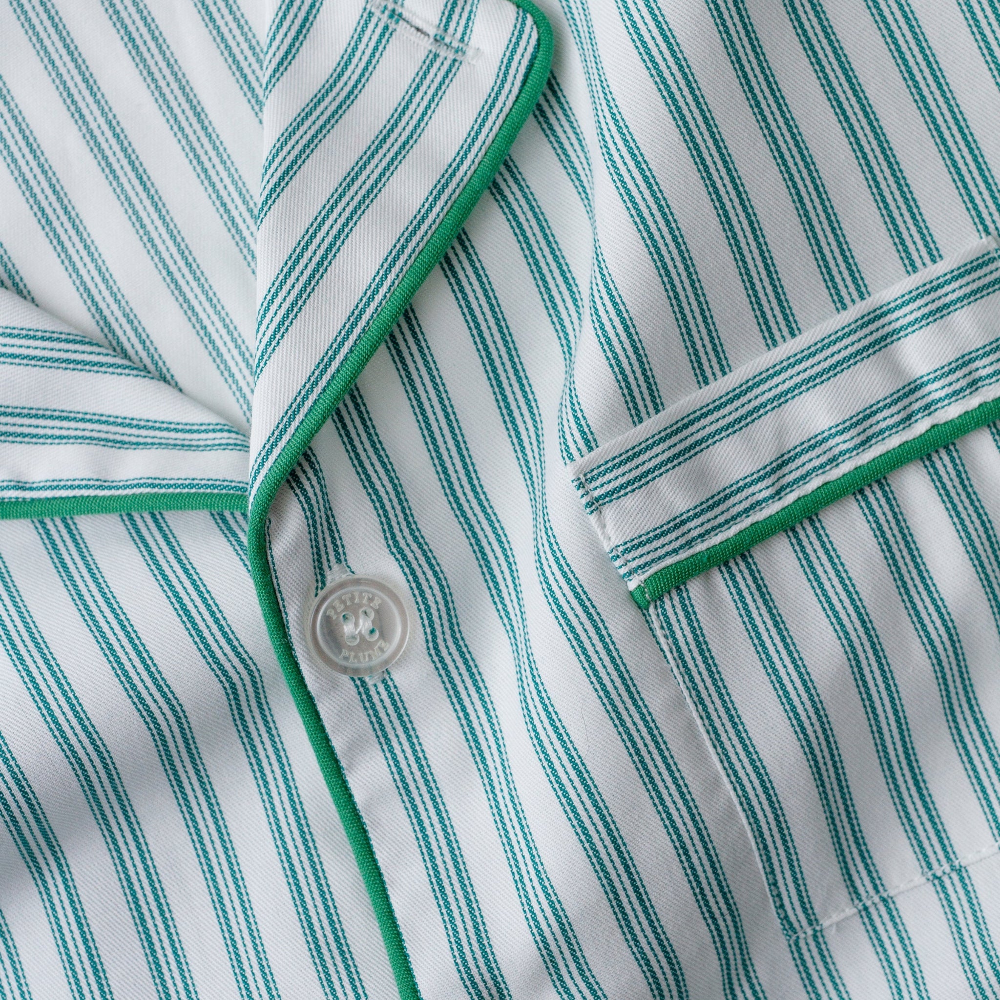 Our classic French ticking pattern takes on a new seasonal hue in a lush, deep green that channels the color of evergreen trees. The versatility of this print allows seamless transition from bedtime to holiday festivities in a snap. This classic twill pajama set is accented with green piping and finished with logo buttons. Premium 100% cotton twill makes this design crisp, comforting, and cozy. The moisture-wicking weave is yarn-dyed to help prevent fading. Cotton twill becomes more buttery with every wash.