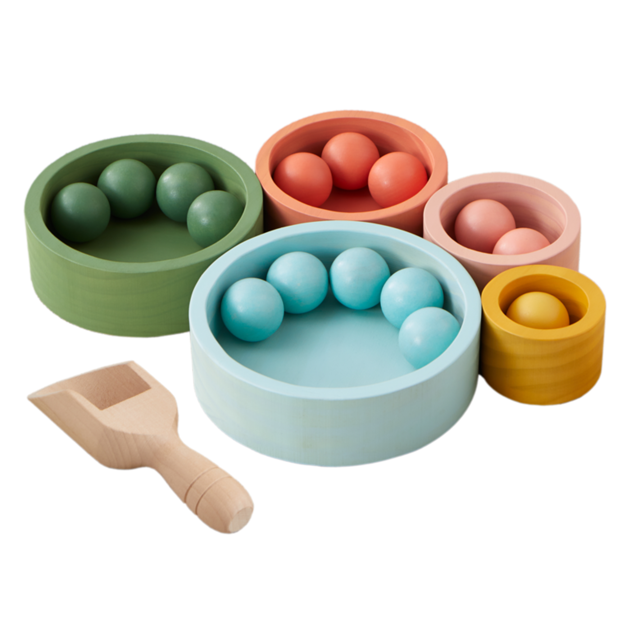 - Five solid-wood cups finished in non-toxic stains, with a wooden scooper for hands-on discovery