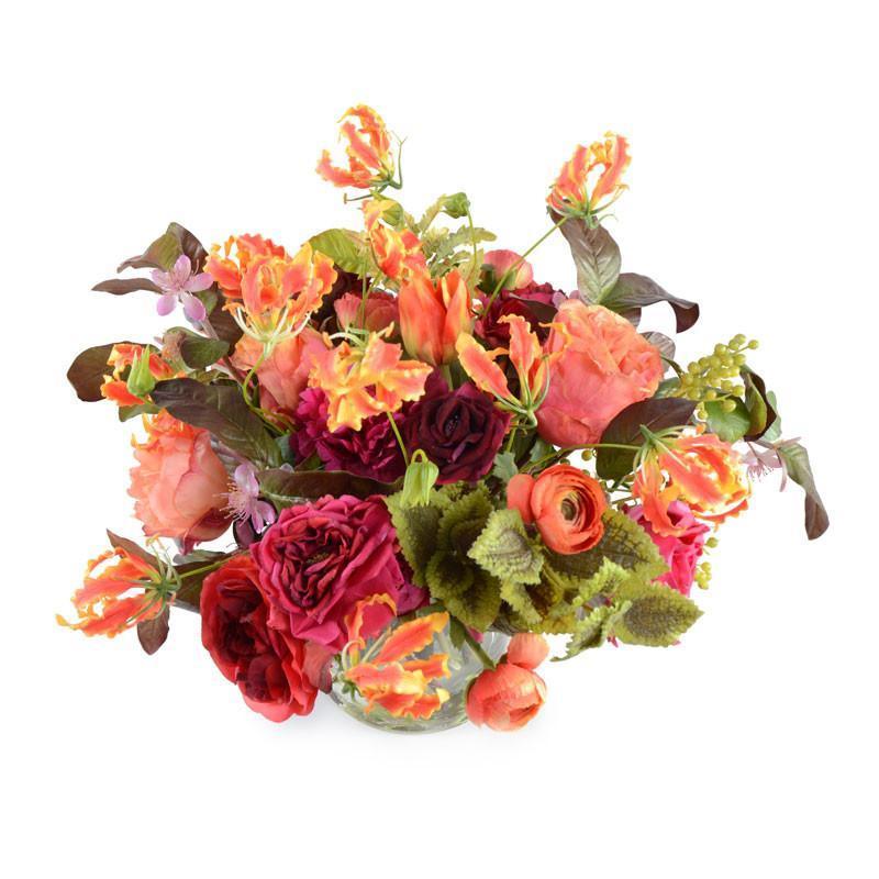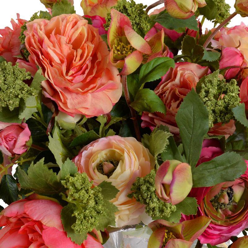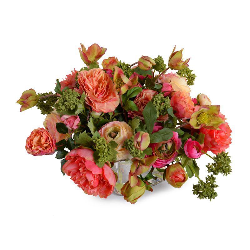 New Growth Designs Faux Fresh arrangements add a realistic floral accent with little maintenance. This striking bouquet includes shades of peach, coral, fuchsia and green in a mixed bounty of flowers which are artfully arranged by hand in clear acrylic "water" into our heavy 8" cylinder glass vase.