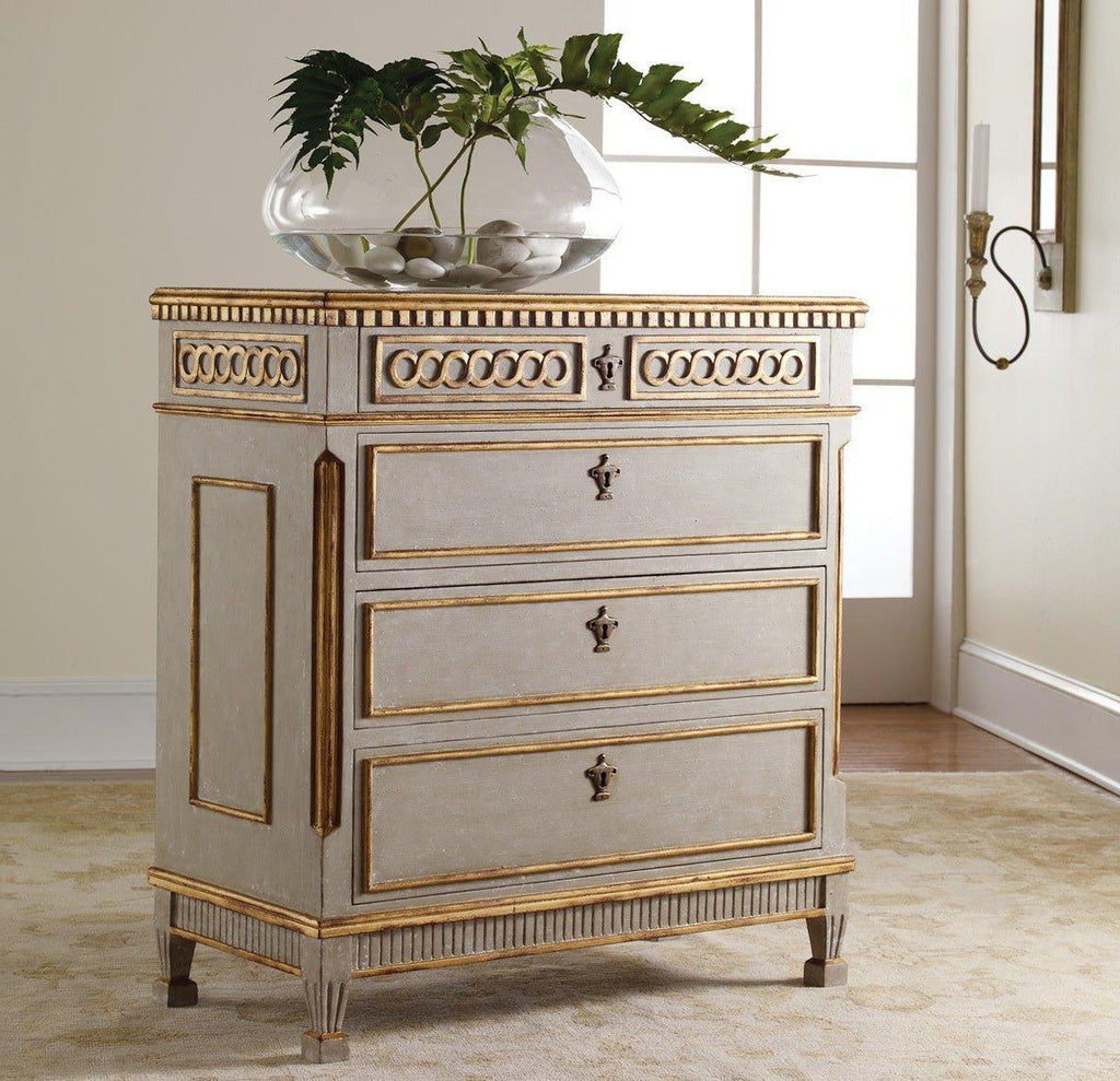 The four drawer regency chest features a painted mahogany solids finish. It also has beautiful gold leaf details. This piece of furniture is classic, timeless and well-styled and is hand-crafted in small quantities.
