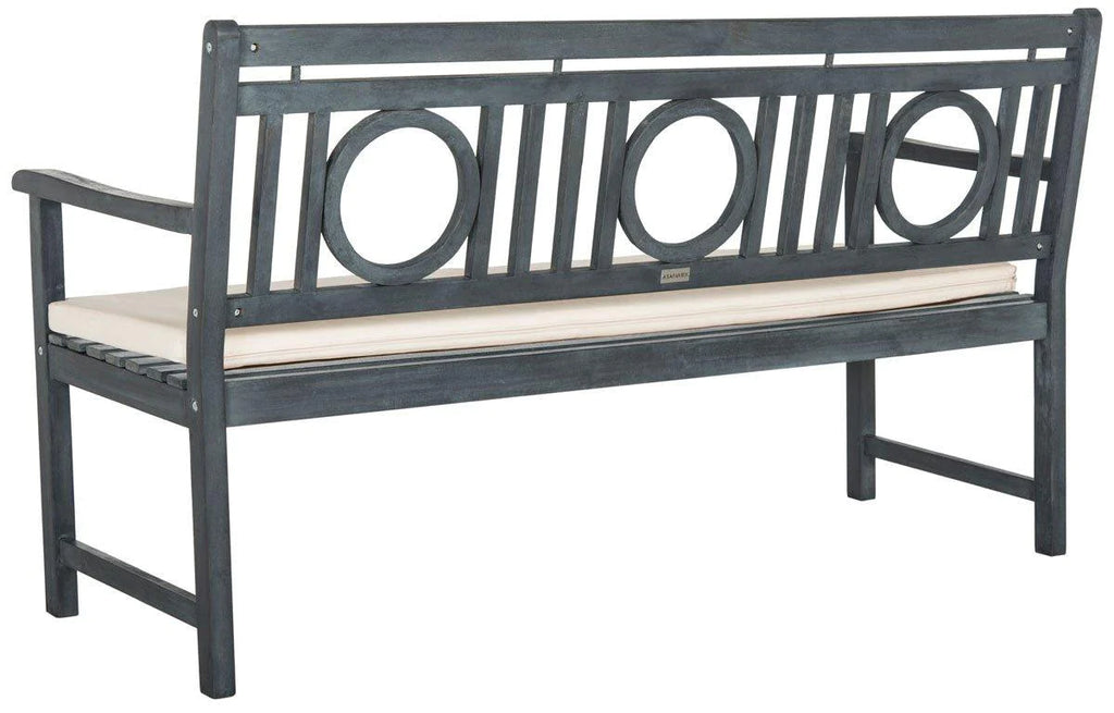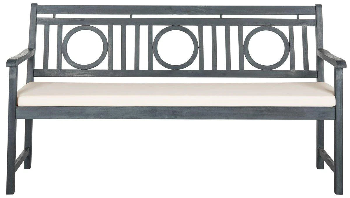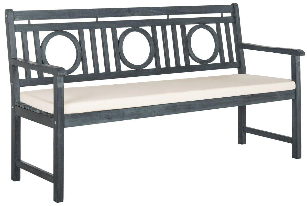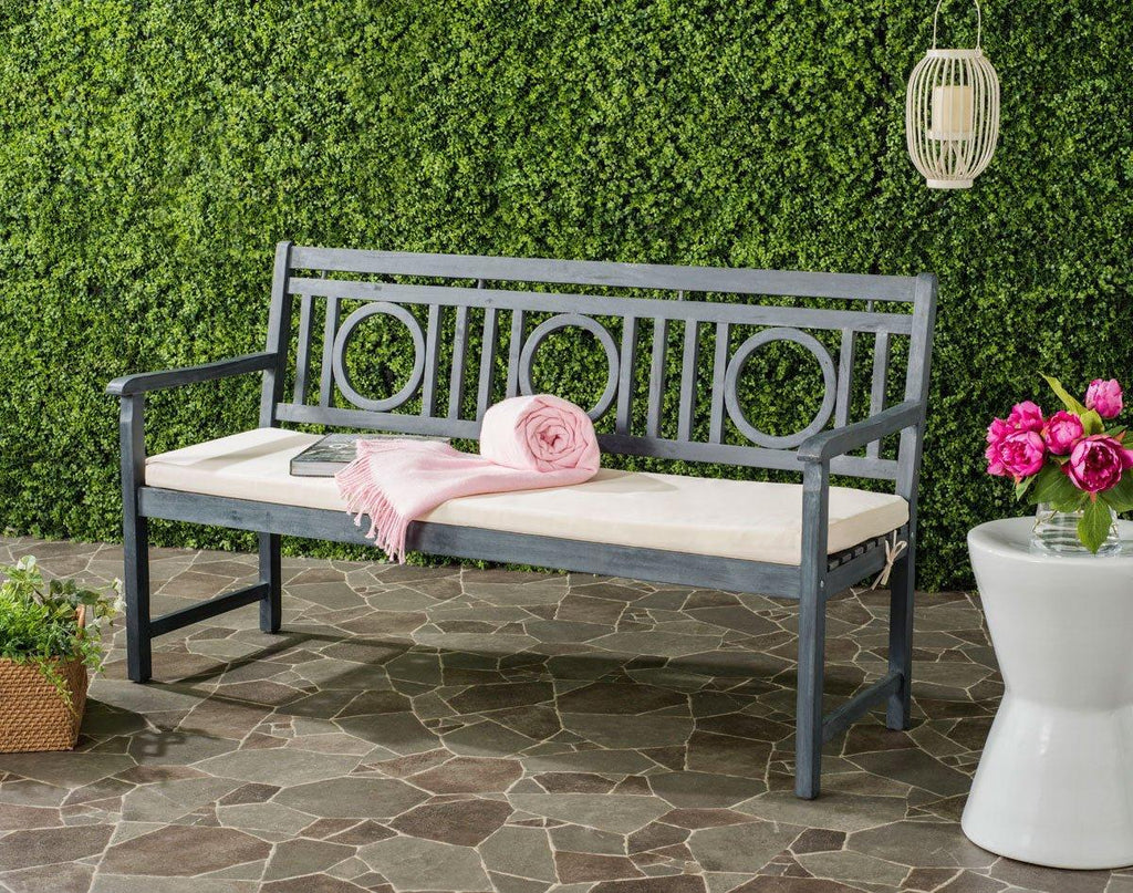 Inspired by furnishings used in the gardens of the great estates in the UK, this ash grey acacia wood 3 seat bench is a modern classic. Its circular geometric detail and plush cushion make it ideal for traditional or contemporary outdoor living. The bench is made with acacia wood and measures 23.4" x 60.6" x 34.7". Please note that assembly is required for this item. This item weighs 76.2 lb and additional shipping charges may apply. If you wish to purchase this item please contact customer service for the exact shipping price. This bench will weather naturally, taking on a subtle grayish hue and perhaps revealing minor cracks in the wood grain. This is weathering, not damage and will subside over time. Store it indoors or cover well when not in use. Dust regularly with small brush or vacuum. Spills should be taken care of immediately before they harden or stain with a slightly dampened sponge. Click images for greater details.