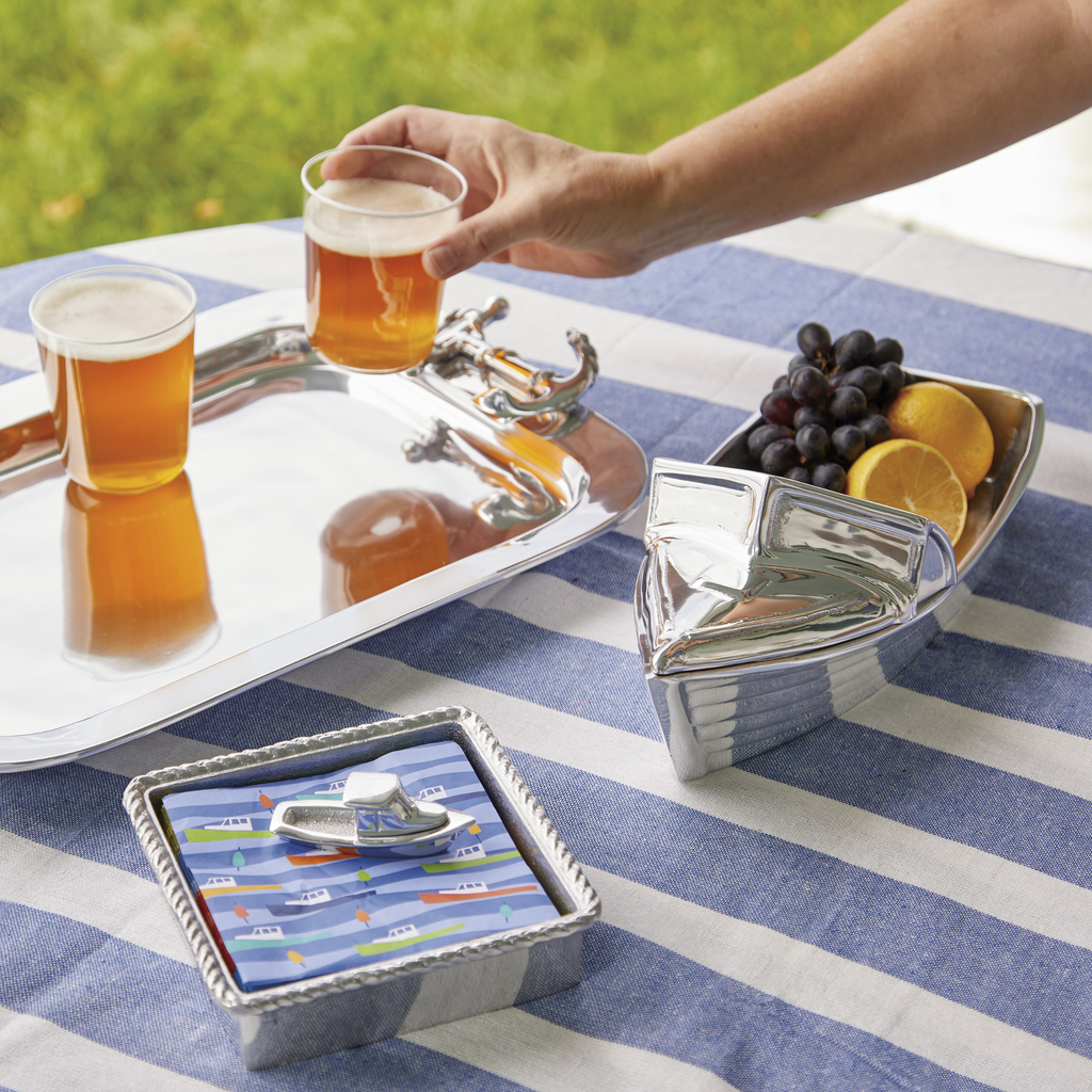 Elevate your dining experience with our unique Motorboat Server from the High Seas Collection. Hand-sculpted from 100% recycled aluminum, this distinctive serving dish not only adds a touch of maritime charm to your table but also makes a sustainable statement.