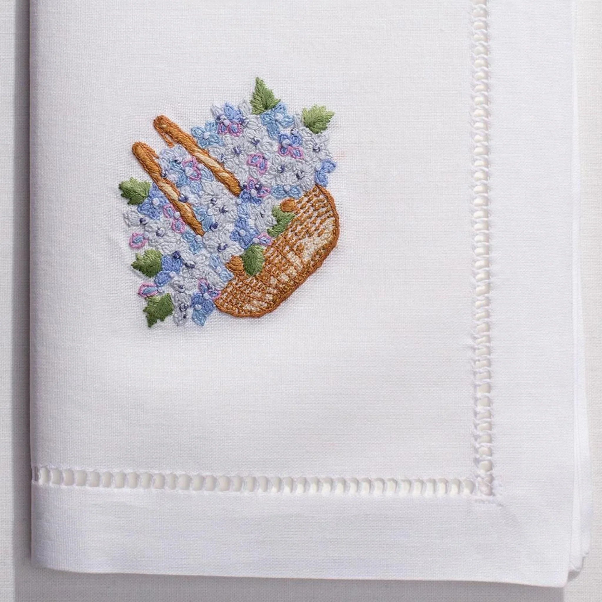 - Hand-embroidered dinner napkin finished by hand with a classic hemstitch
