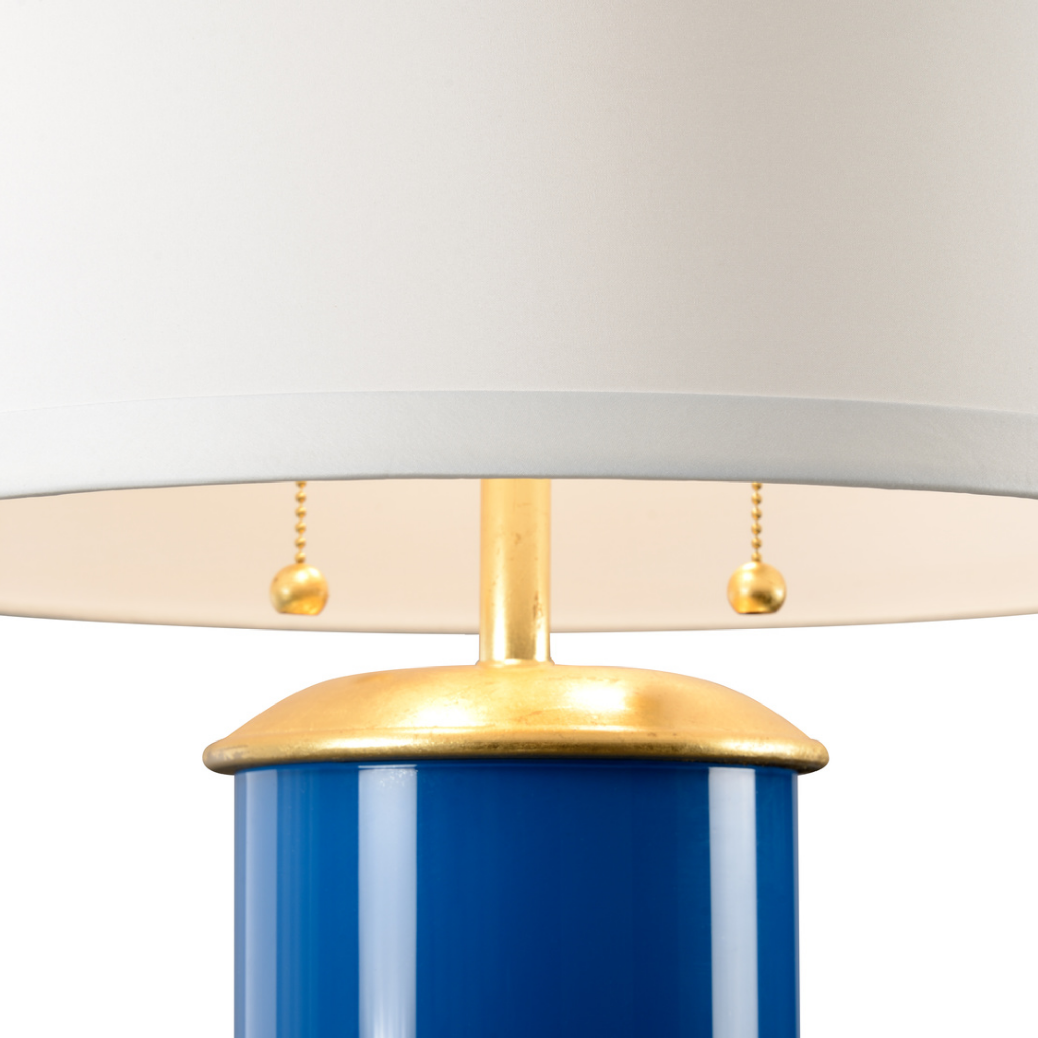 Brighten your home with this charming transitional table lamp. Savannah features a colorful glass cylinder with a dazzling gold leaf base and parts. A classic white silk drum shade completes the look creating a glamorous pop of color perfect for a bedroom, entryway or living room. Click on image for greater detail. If you are a qualified member of the design trade, please check out our trade discount program!