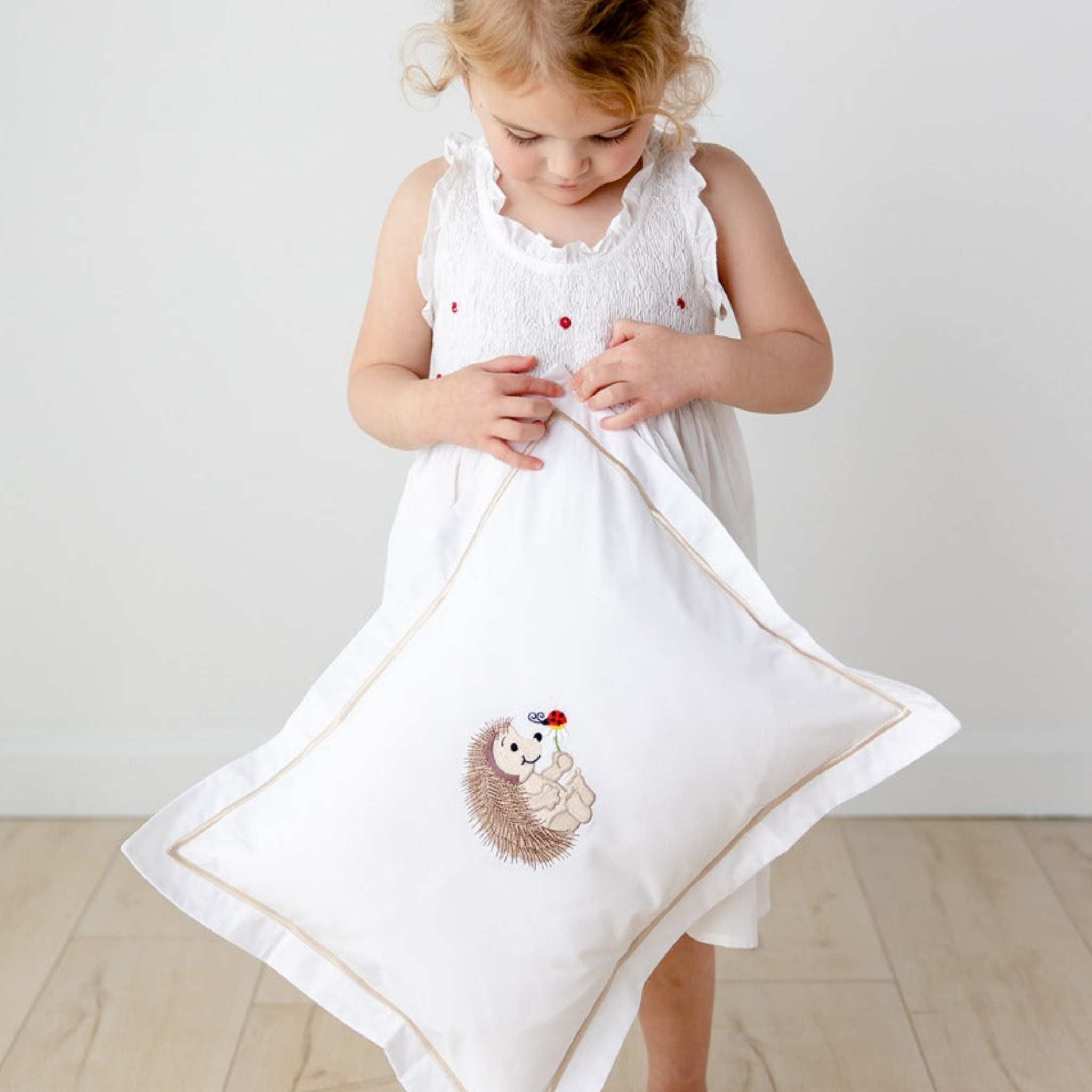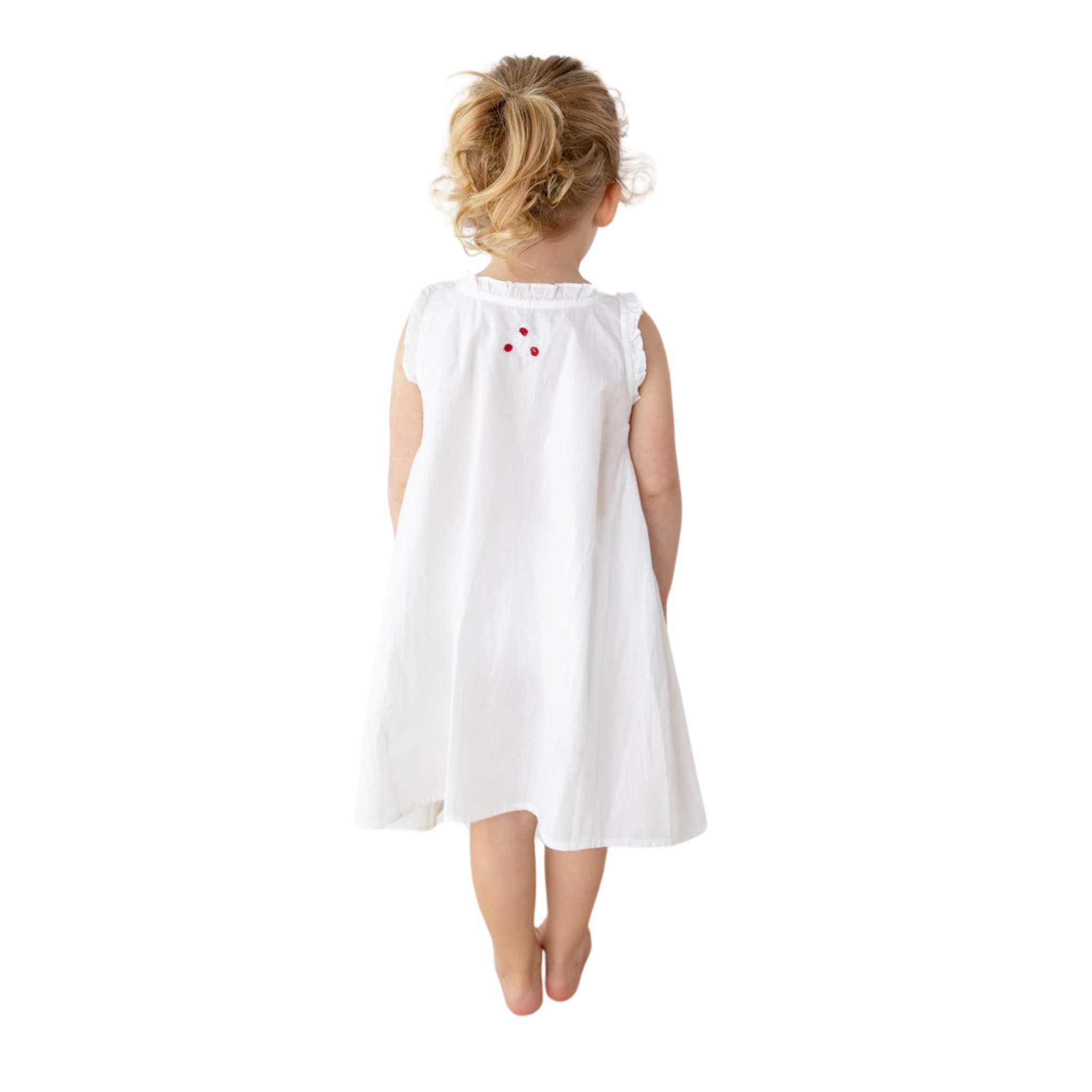 This dress is for Little Girls at play time, girl time, story time or twirl time! This Noa dress with white smocking is hand embroidered with little red rosebuds on the front and 3 delicate rosebuds on the back. It is the perfect dress for little girls to run around and play in or wear to tea time with their friends!