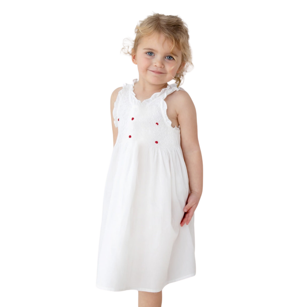 Noa White Cotton Dress, Smocked with Hand Embroidery