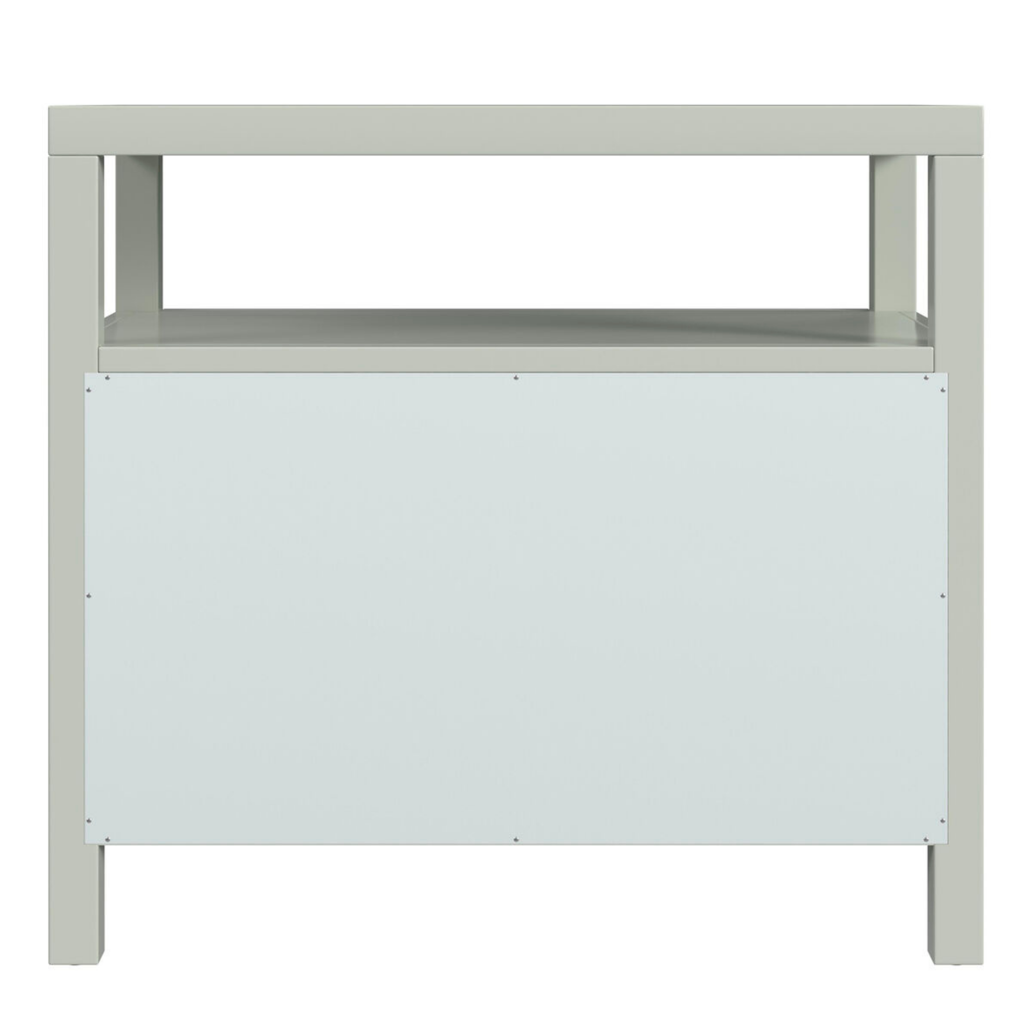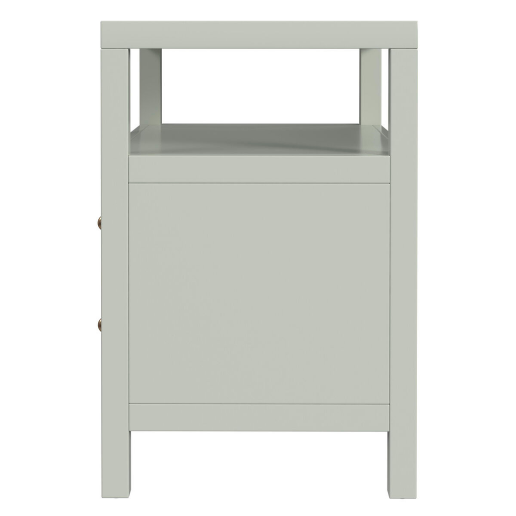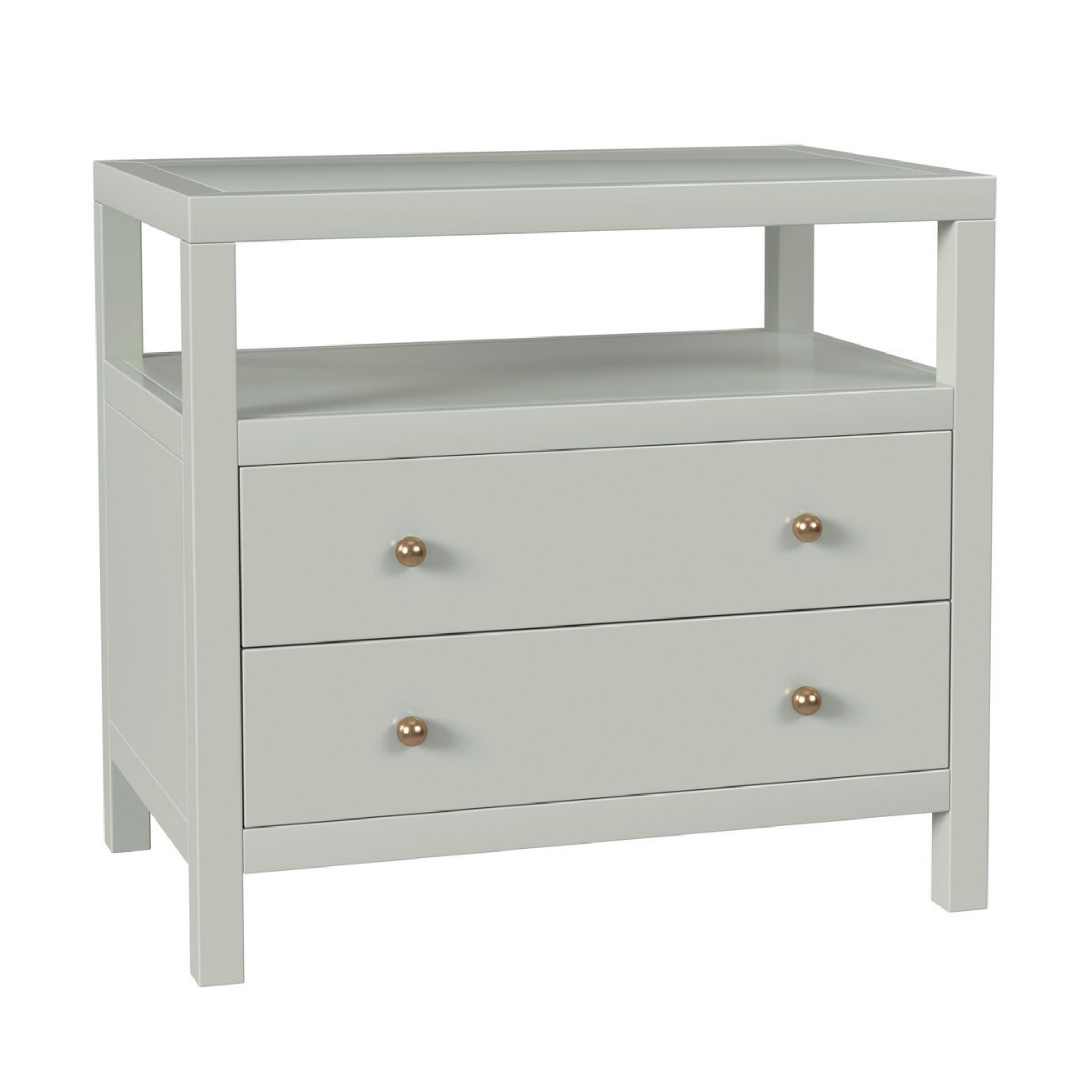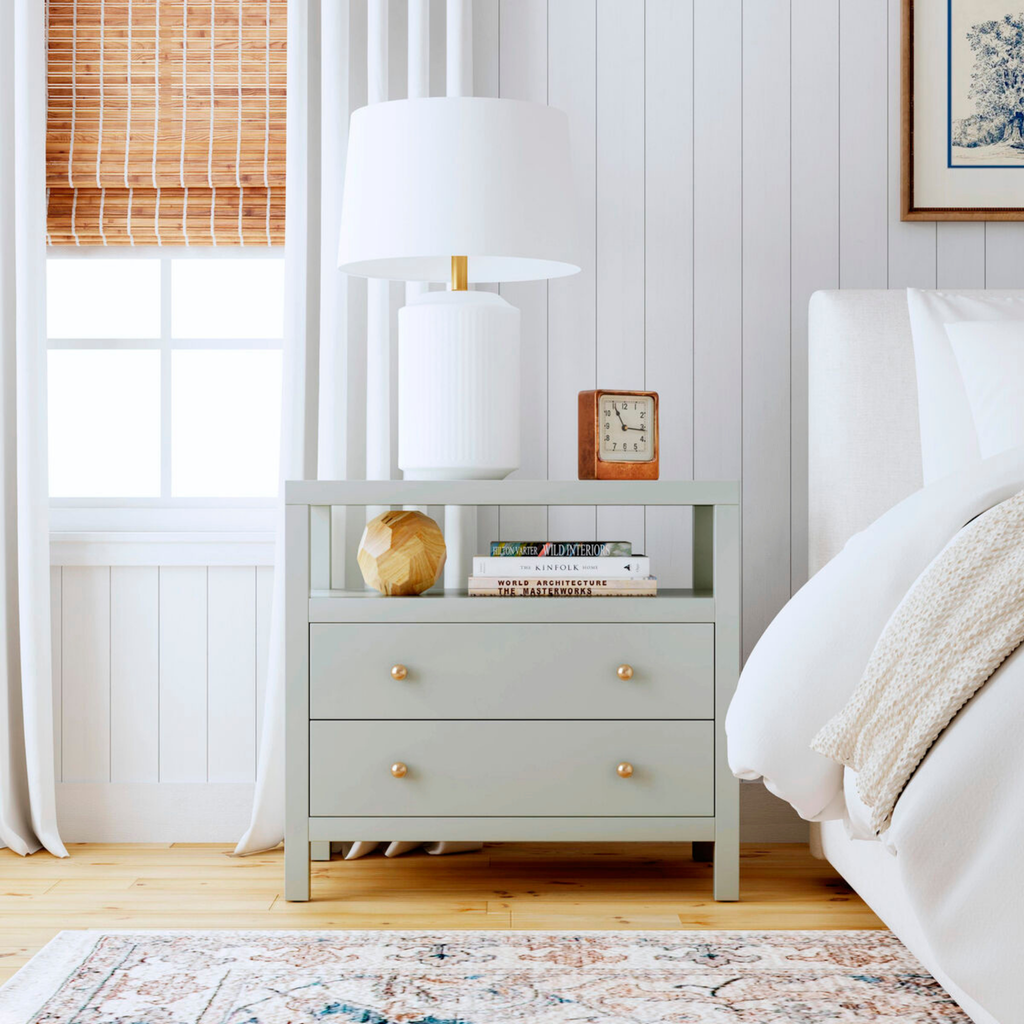 The color is pastel sage green. Crafted with a solid Acacia or rubberwood frame depending on the finish selection, this nightstand combines durability with beauty. The engineered wood top and shelf provide structural integrity while maintaining a sleek finish. The acacia veneer or solid oak drawer fronts are paired with smooth glides, ensuring effortless drawer operation. The tongue and groove joinery enhances strength, and the under-mount glides keep the drawers running smoothly over time. The use of engineered wood beneath the veneer ensures longevity, while maintaining a consistent, flawless finish. The piece is also equipped with plastic floor protection, safeguarding your floors, and kiln-dried wood for enhanced resistance to warping and cracking. Shape is rectangular.