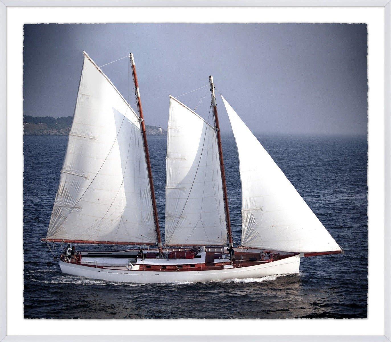 This majestic boat with bright white sails will have you dreaming of hitting the water. Giclee on watercolor paper, hand deckled and floated on a mat, Framed in a shadowbox.