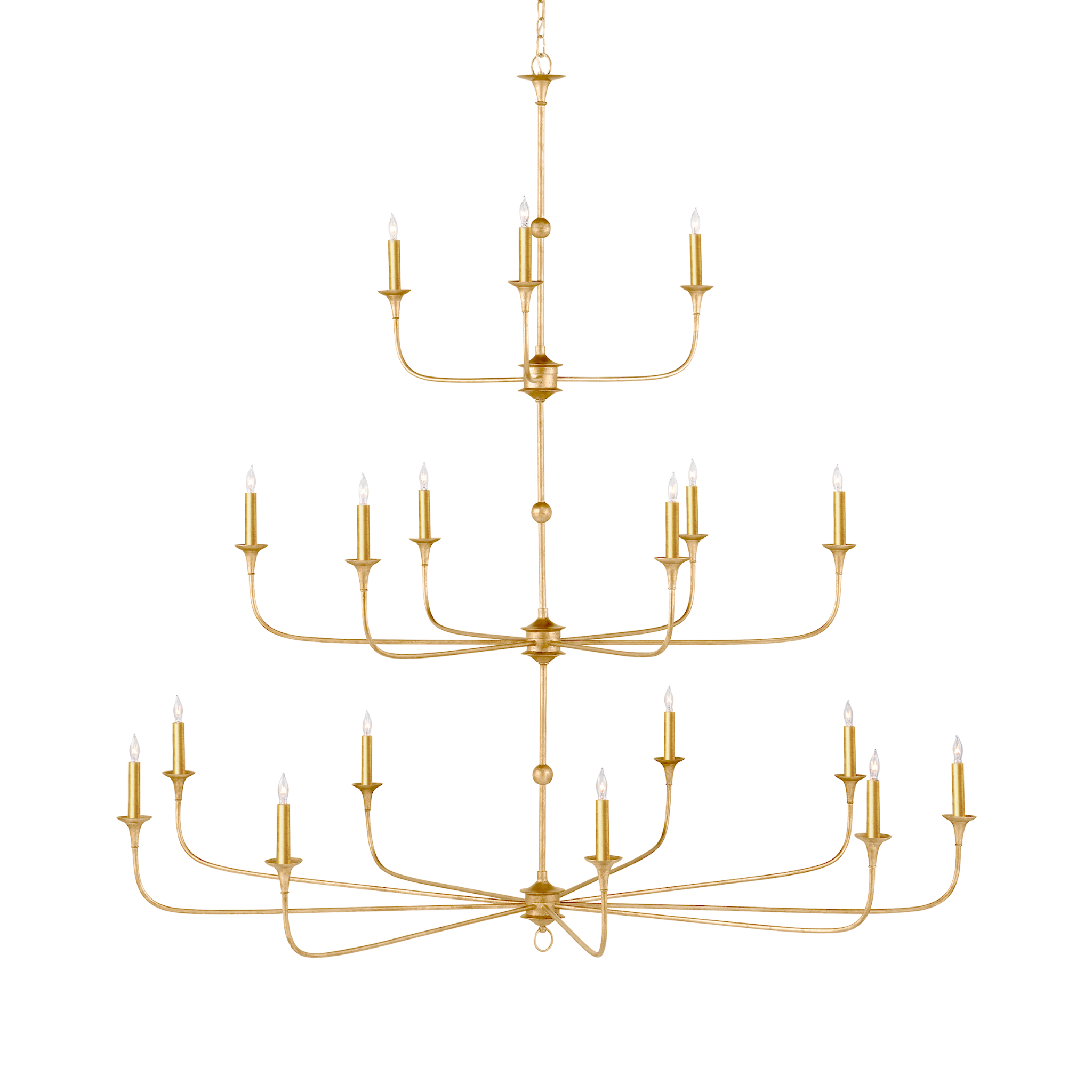The arms of the Nottaway Grande Gold Chandelier stretch gracefully from petite cogs that rest at the bottoms of its stems, the bottom one ornamented with a dainty ring. Though this is a seriously minimalist fixture, the profile of the gold chandelier has a lovely fluidity to it that makes it a natural choice for traditional and transitional interiors. The contemporary gold leaf finish on the wrought iron frame adds textural interest.