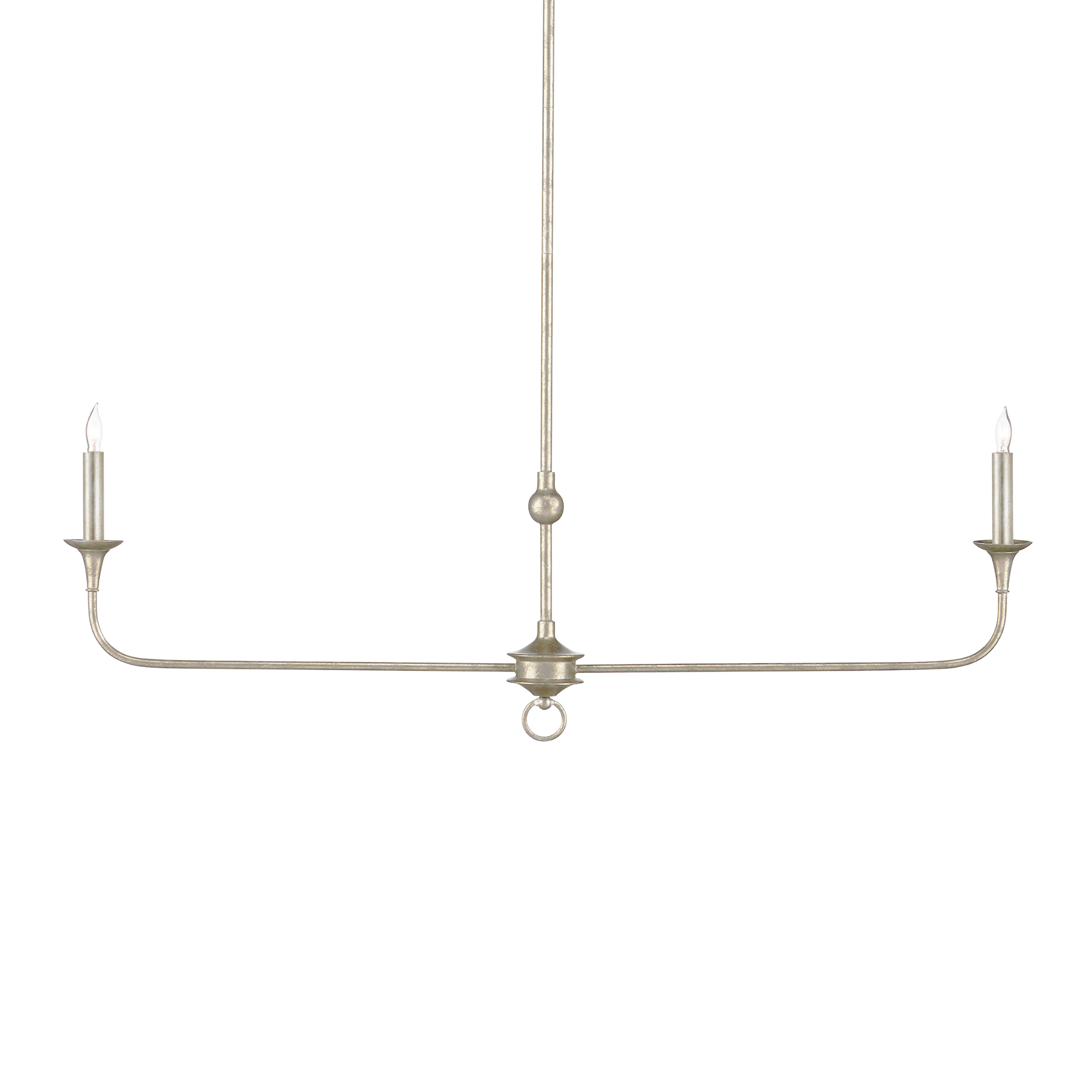 The arms of the Nottaway Linear Champagne Chandelier stretch gracefully from a petite cog at the bottom of its long, thin stem, which is ornamented with a dainty ring. Though the silver chandelier has minimalist lines, there is a sweeping fluidity to its profile that makes it a natural choice for above kitchen islands and bars or long dining room tables. The finish on the wrought iron frame brings textural interest to this dimmable two-light fixture.