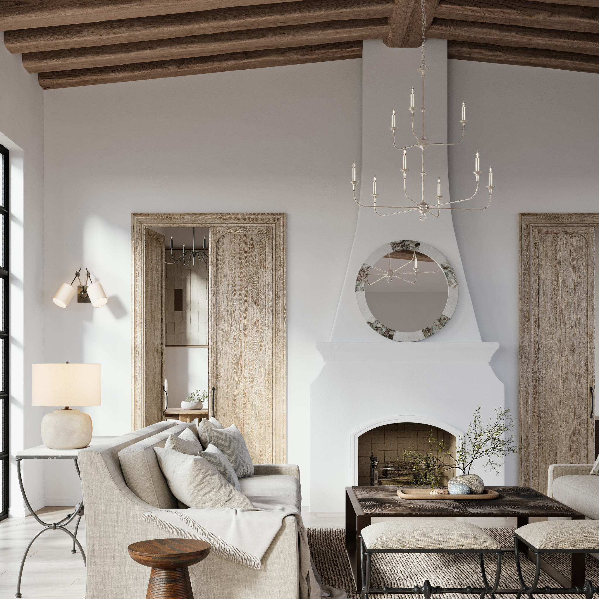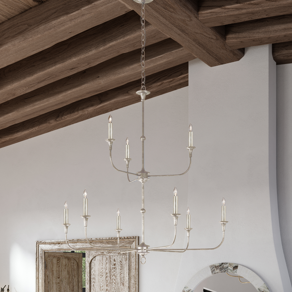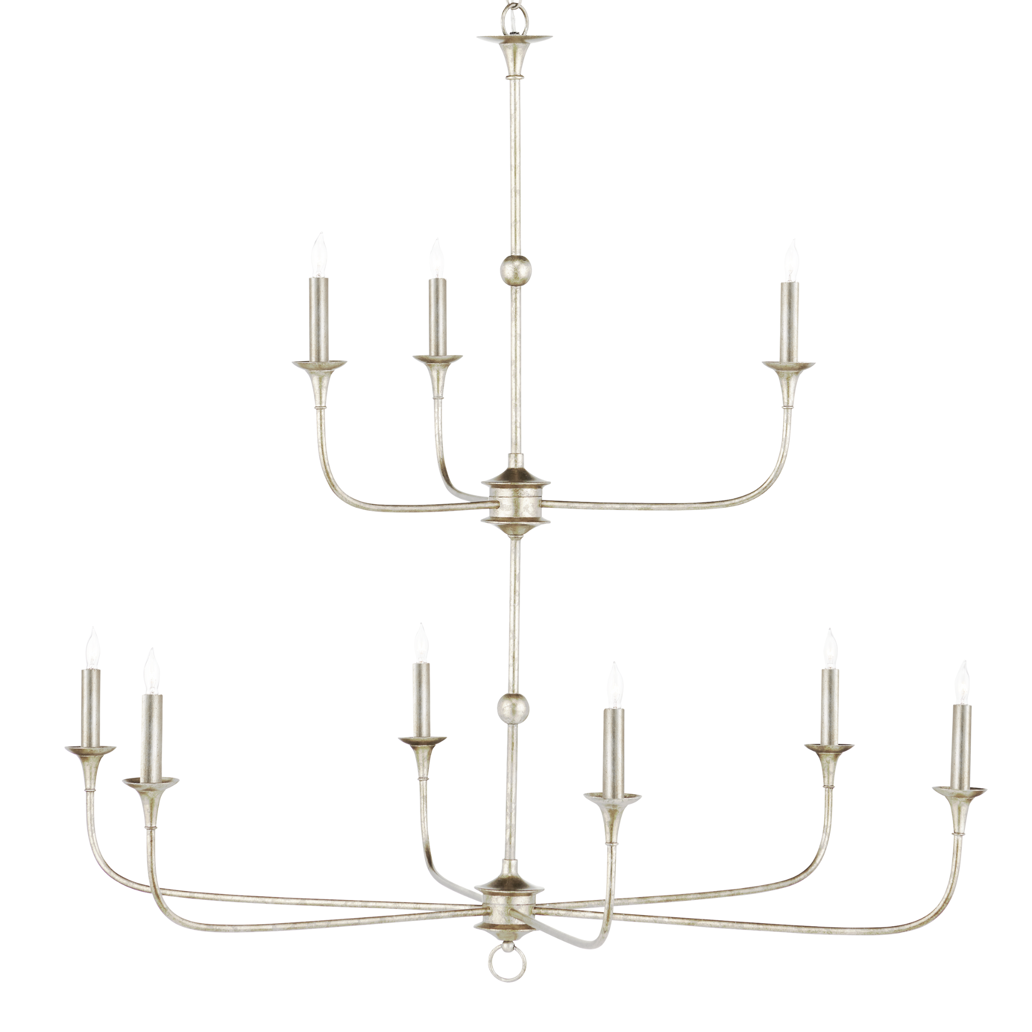 The arms of the Nottaway Two-Tier Champagne Chandelier stretch gracefully from petite cogs that rest at the bottoms of its stems, the bottom one ornamented with a dainty ring. Though the silver chandelier has minimalist lines, there is a sweeping fluidity to its profile that makes it a natural choice for large tall foyers or any room with high ceilings. The finish on the wrought iron frame brings textural interest to this dimmable nine-light fixture.