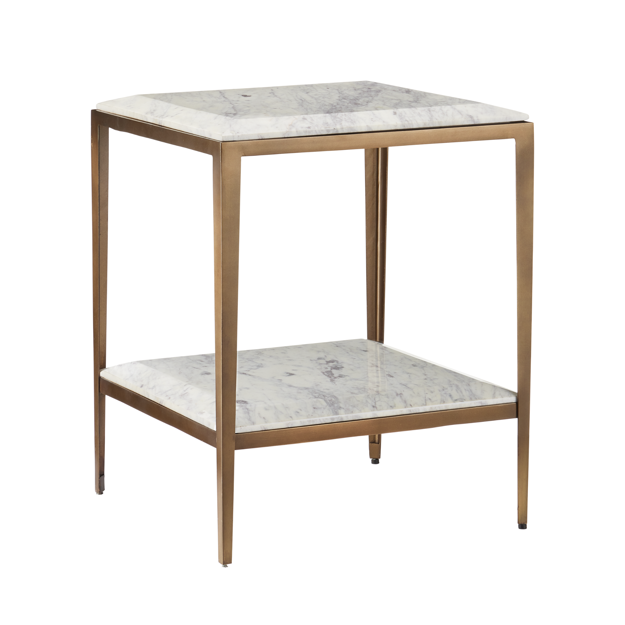 The Oblique Marble Side Table is a refined statement piece that combines masterful metalwork with luxurious stone. Its tapered legs and intersecting frames in an antique brass finish hold the chamfered top and lower shelf, each of which is made of exquisite white lilac marble and sit slightly elevated above the frame. This creates a striking floating effect. The marble’s subtle veining adds a touch of natural elegance and will vary from piece to piece.