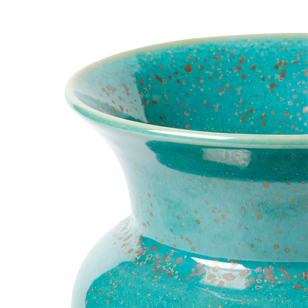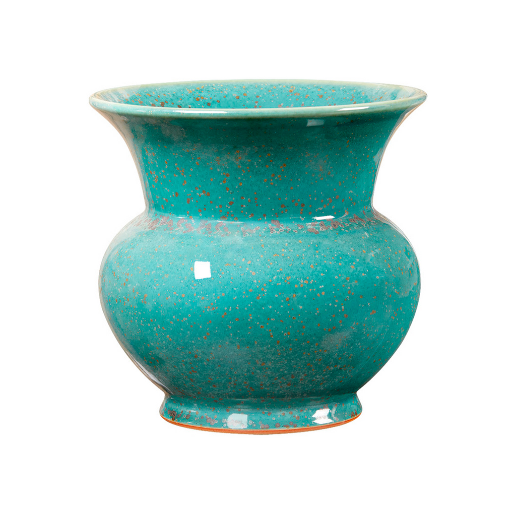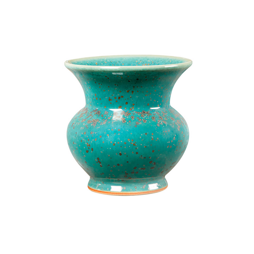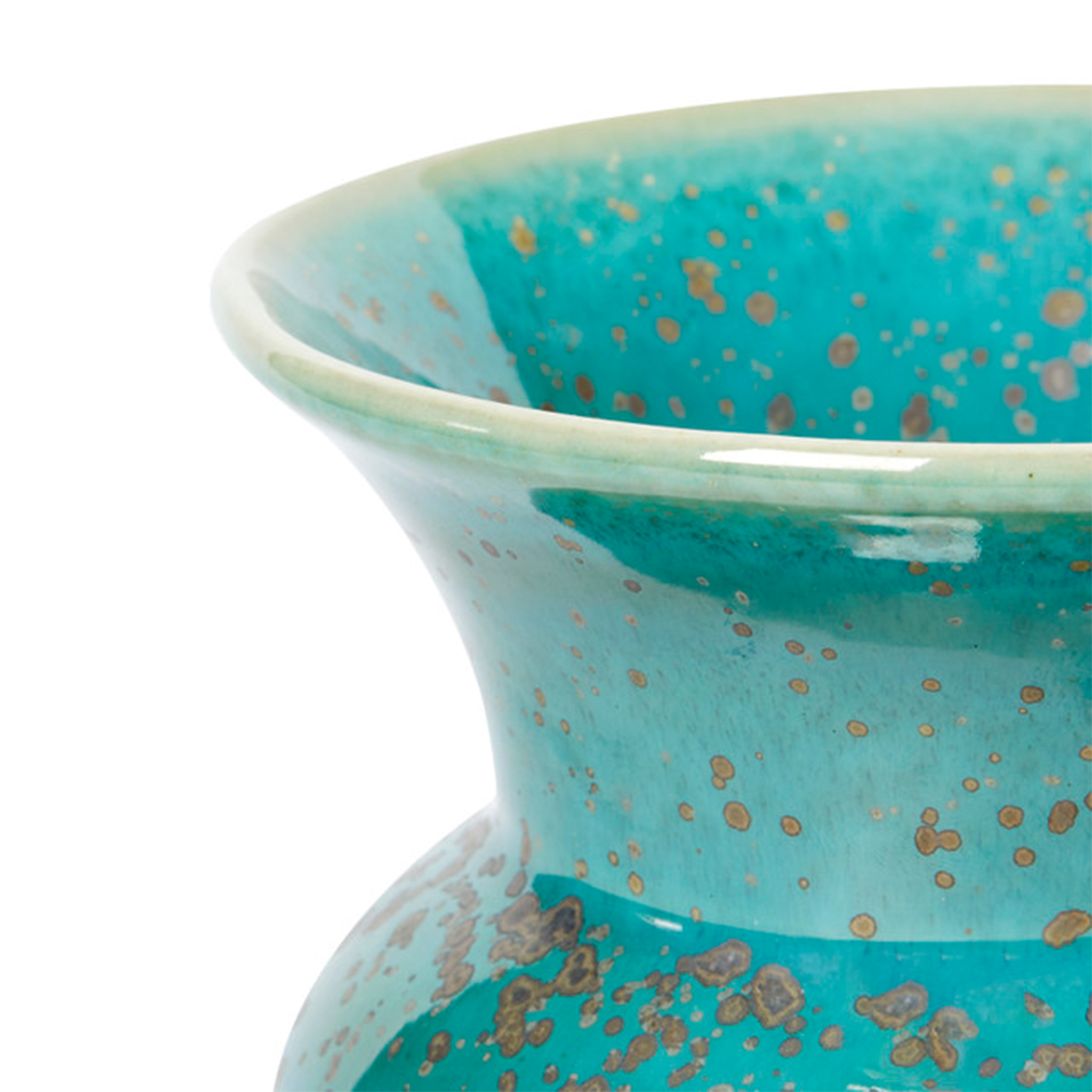 The Olympia Vase features a wide rim, rounded silhouette, and mottled turquoise finish created by reactive glazing. Each piece is one of a kind, with rich organic texture. Style it solo or pair with the Sandor Vase and Nyle Bowl for a curated, artful display.