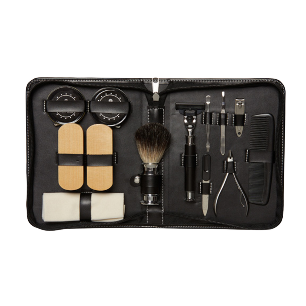 Vegan leather zipper case with Mach 3 razor compatible, badger brush, cleaning cloth, shoe polish(black), shoe polish(neutral), shoe brush, shoe hard brush, comb, cuticle nippers, tweezers, cuticle pusher, nail file and nail clippers.