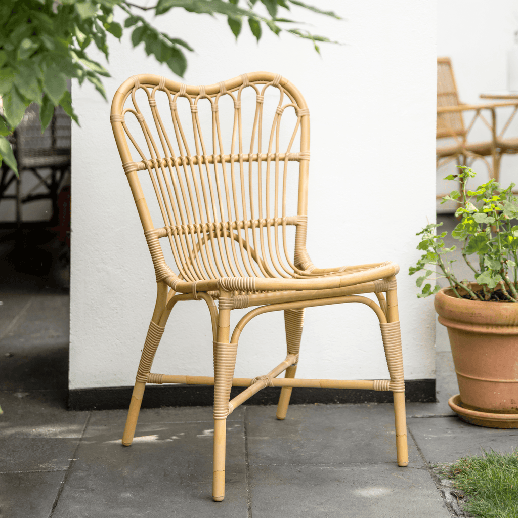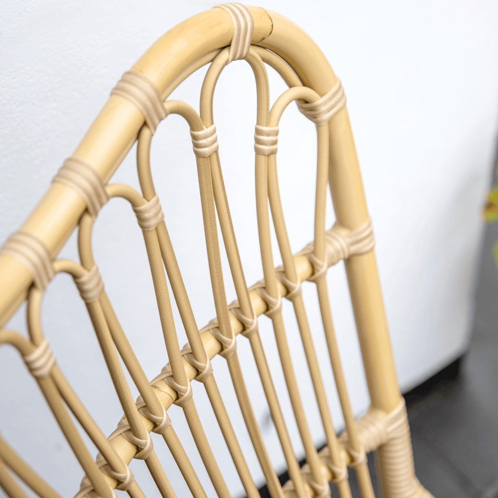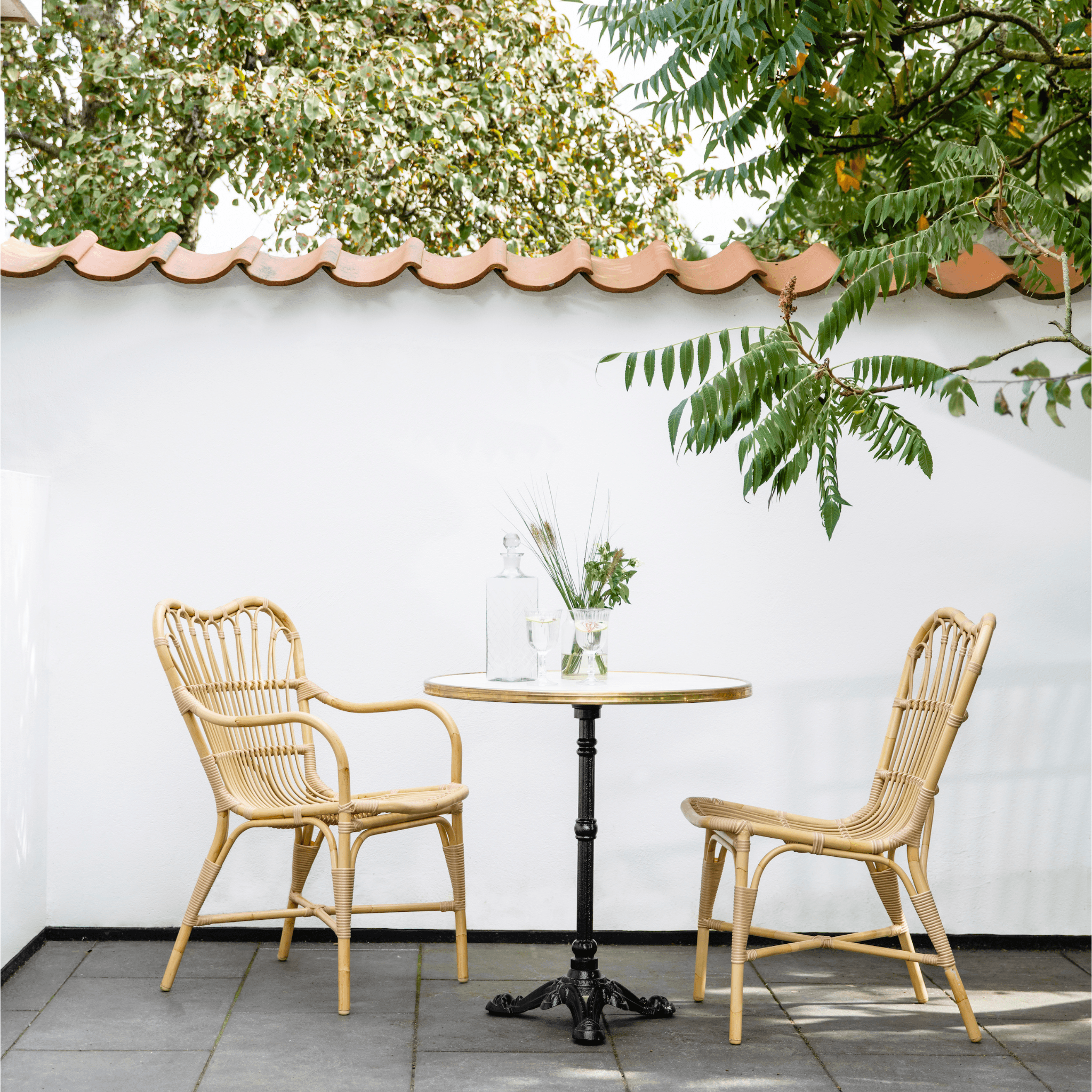 AluRattan® is powder-coated aluminum bent to mimic the curves of natural rattan. The powder coating ensures a surface resistant to knocks and scratches. The material is well-suited to be left outside all year long and is easy to clean.