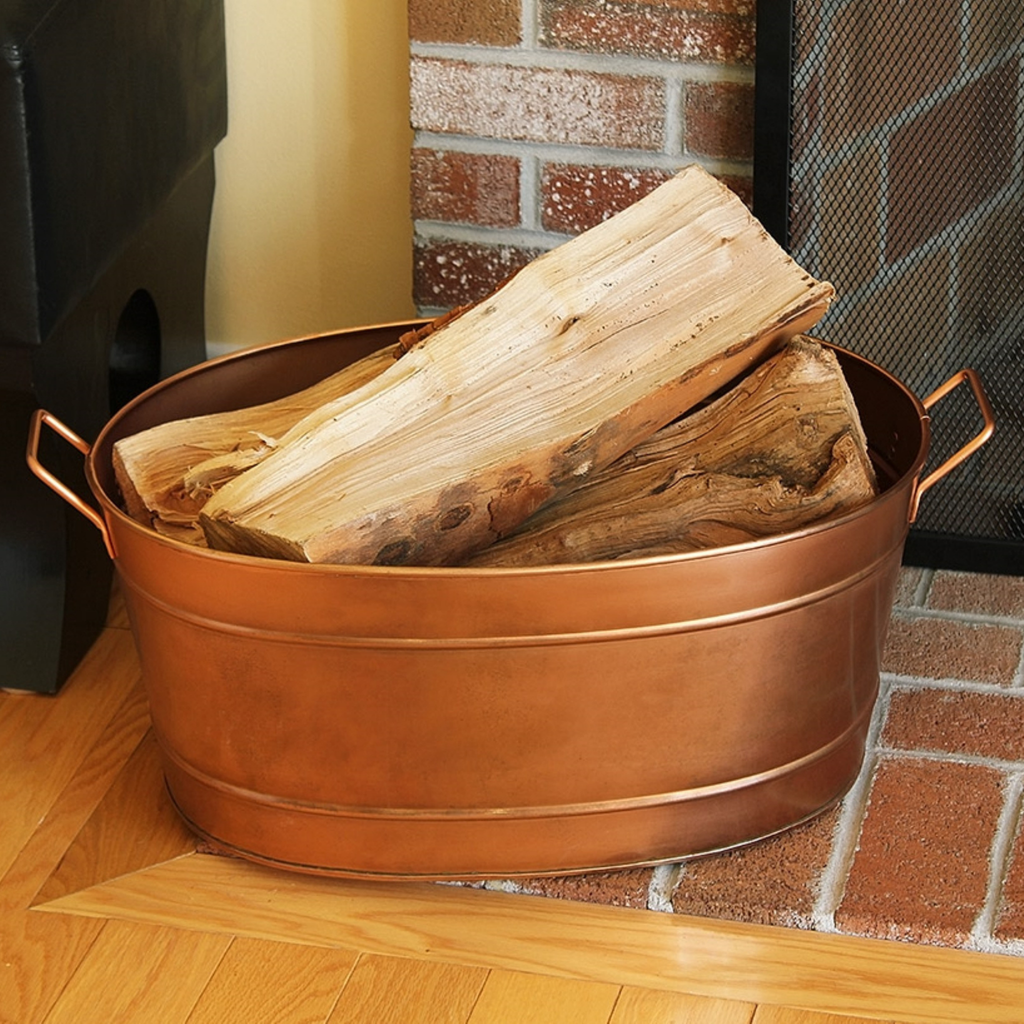 This Copper Plated Tub was made to mimic the classic old-fashioned farm tub. Reminiscent of old general stores, this tub gives even the most urban garden a rustic charm. Fill with ice for chilling beverages in the summer, hold firewood in the winter, grow a container vegetable garden, and so on! Drainage holes should be drilled for direct planting. The tub has two side handles. Use it with the Oval Wrought Iron Stand and Folding Floor Stands.