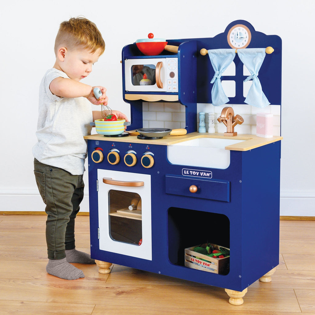 Painted in a striking royal blue colourway and finished with copper effect detailing, this traditional toy makes a great addition to the playroom or kids room and is ready for role play fun.